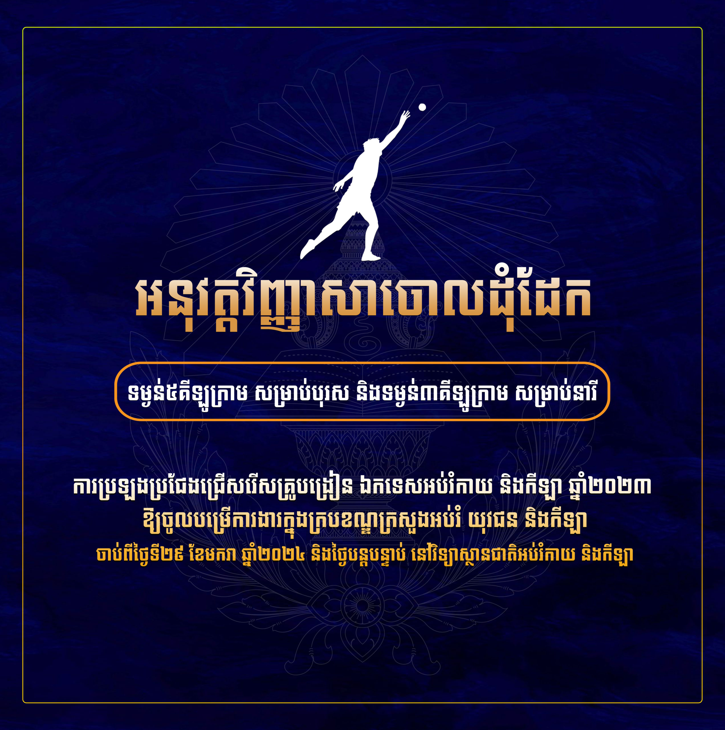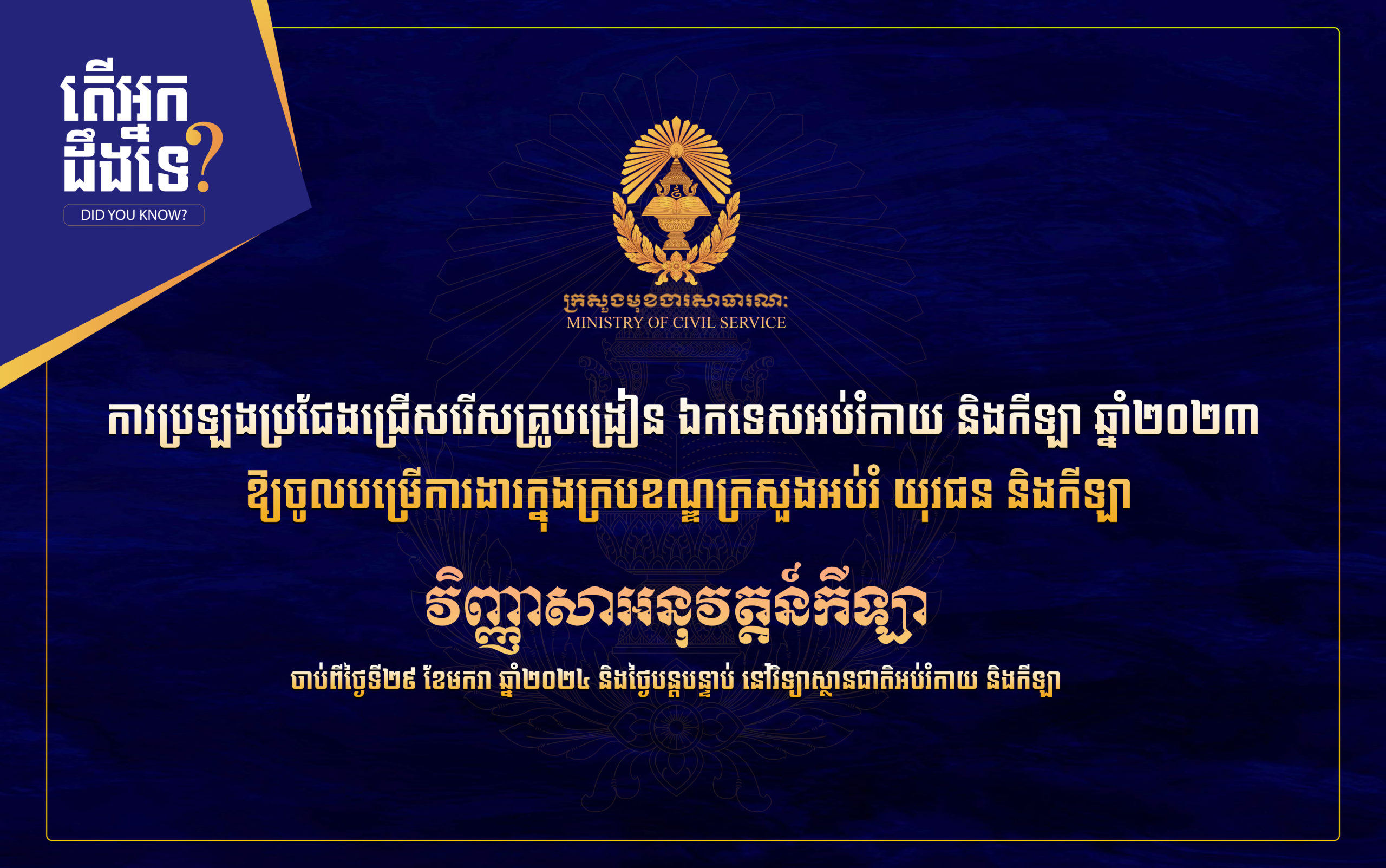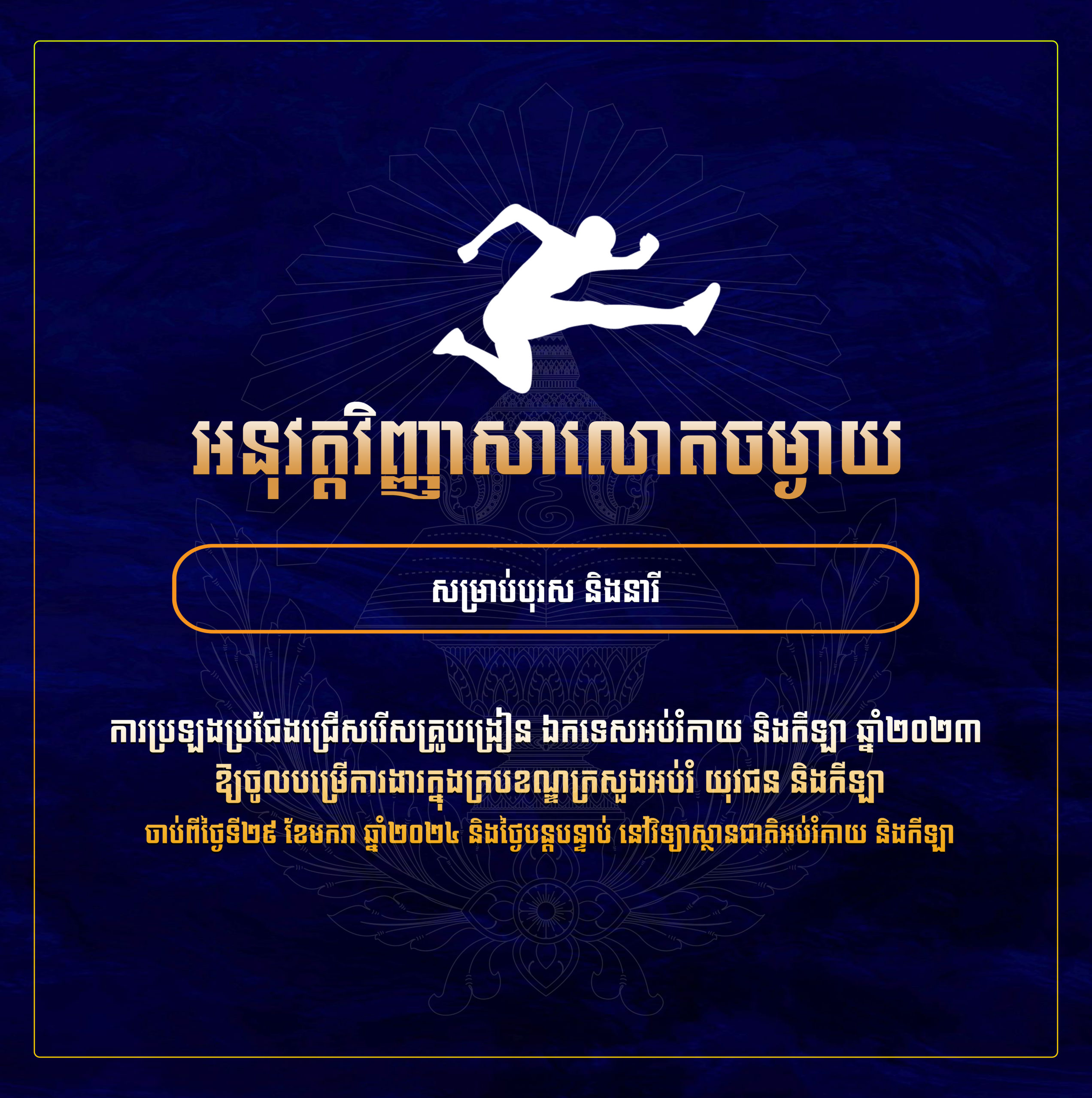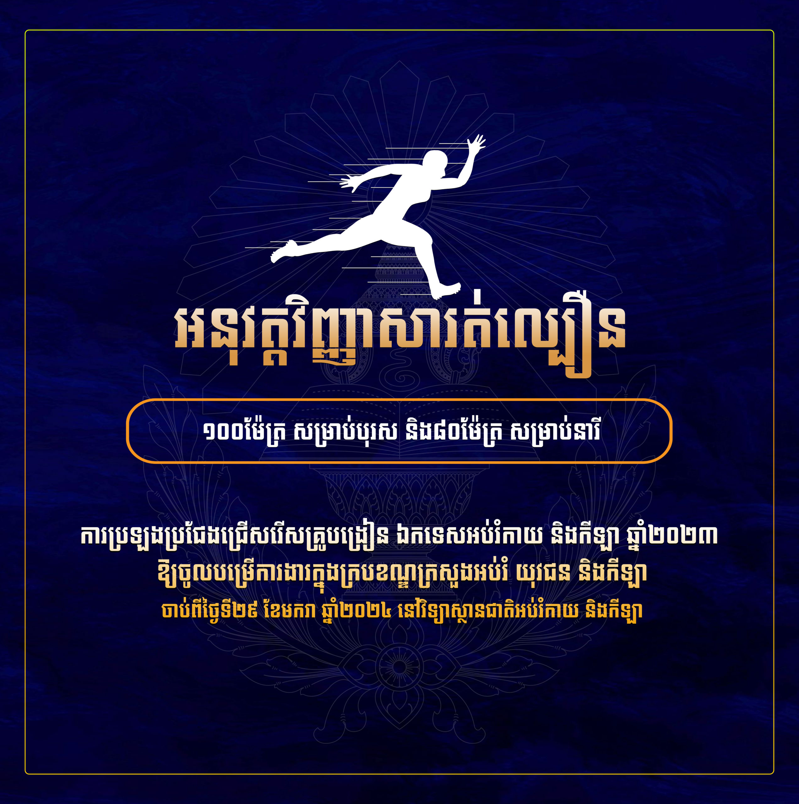 ការប្រជែងជ្រើសរើសគ្រូបង្រៀន ឯកទេសអប់រំកាយ និងកីឡា ឆ្នាំ២០២៣ ឱ្យចូលបម្រើការងារក្នុងក្របខណ្ឌក្រសួងអប់រំ យុវជន និងកីឡានឹងត្រូវប្រព្រឹត្តទៅក្រោមប្រភេទវិញ្ញាសាចំនួន២គឺប្រភេទវិញ្ញាសាសរសេរ និងប្រភេទវិញ្ញាសាអនុវត្តន៍កីឡា