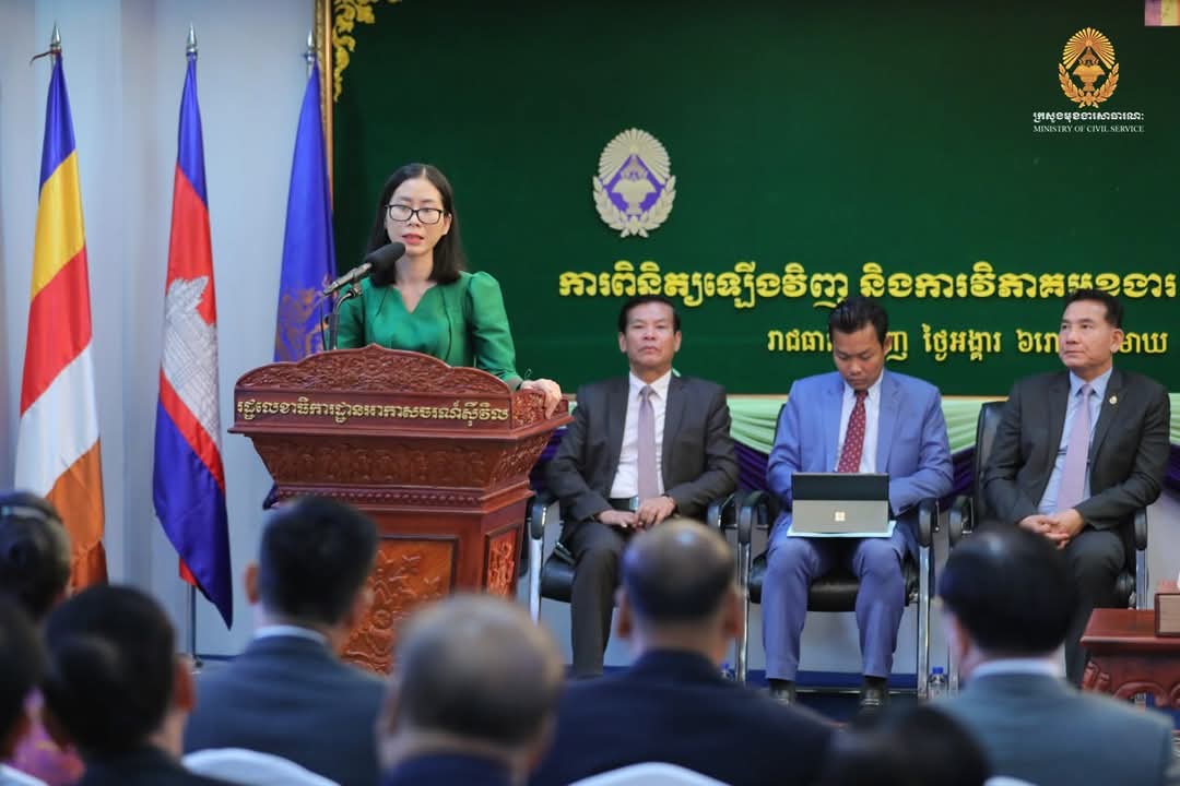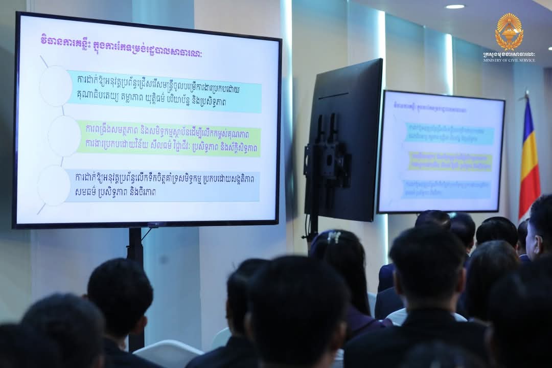 សូមជម្រាបថា សិក្ខាសាលានាព្រឹកនេះ ត្រូវបានរៀបចំឡើងជាមួយបទបង្ហាញរបស់ថ្នាក់ដឹកនាំក្រសួងមុខងារសាធារណៈ ចំនួនពីររូបគឺ៖ (១) ការបង្ហាញពីដំណើរការ នៃការពិនិត្យឡើងវិញ និងការវិភាគមុខងារ និងរចនាសម្ព័ន្ធ របស់ក្រសួង ស្ថាប័ន ដោយលោកជំទាវ ឈី វិជ្ជរ៉ា រដ្ឋលេខាធិការក្រសួងមុខងារសាធារណៈ និង (២) ការបង្ហាញពីការងារបំពេញគ្នា គាំទ្រគ្នា និងជំរុញការអនុវត្តការងាររួមគ្នា ក្នុងក្របខណ្ឌការកែទម្រង់ និងពង្រឹងអភិបាលកិច្ច ដោយឯកឧត្តម យក់ ប៊ុនណា រដ្ឋលេខាធិការប្រចាំការ ក្រសួងមុខងារសាធារណៈ៕