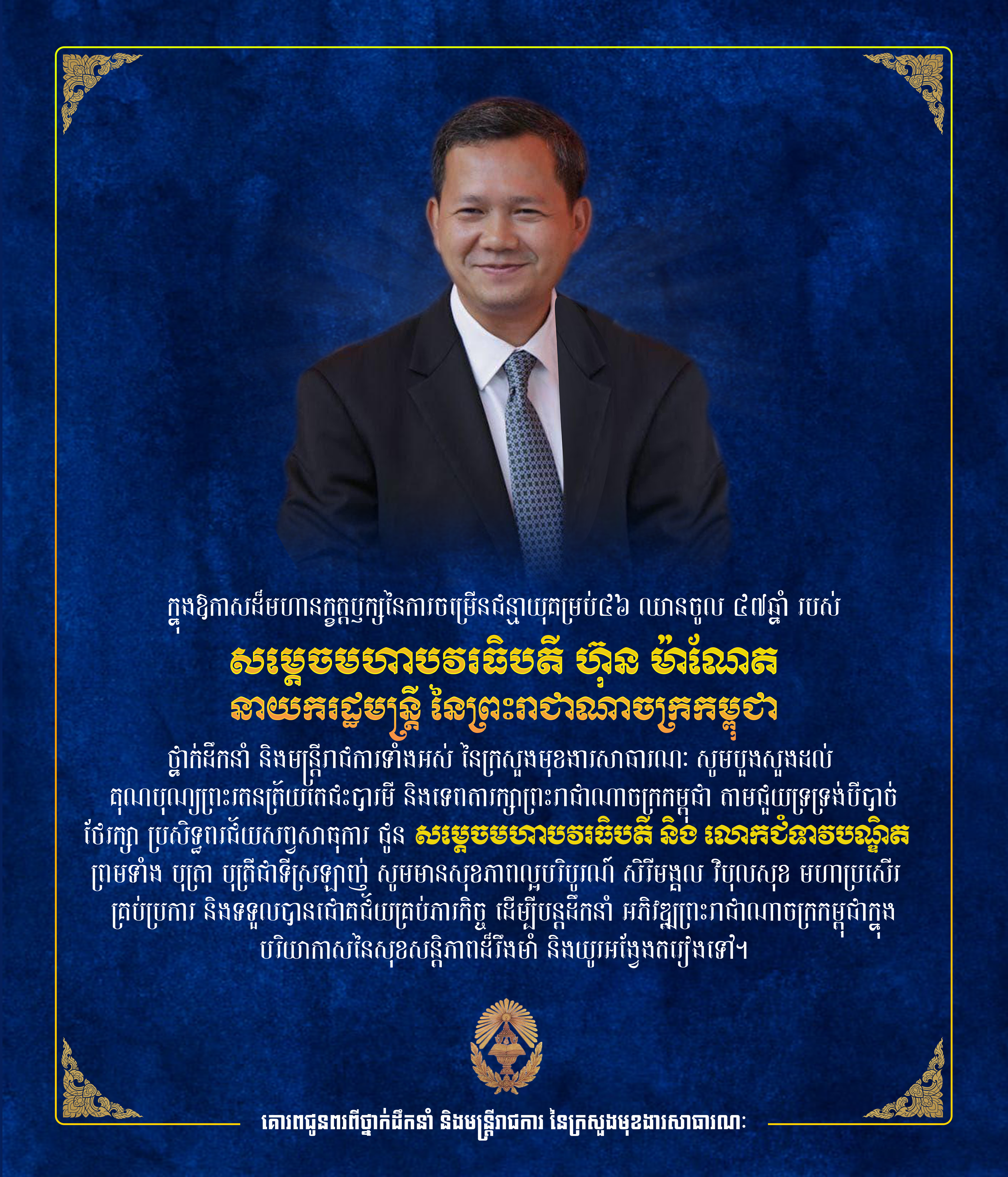 ក្នុងឱកាសដ៏មហានក្ខត្តឫក្សនៃការចម្រើនជន្មាយុគម្រប់៤៦ ឈានចូល ៤៧ឆ្នាំ របស់ សម្ដេចមហាបវរធិបតីនាយករដ្ឋមន្ត្រី ថ្នាក់ដឹកនាំ និងមន្ត្រីរាជការទាំងអស់ នៃក្រសួងមុខងារសាធារណៈ សូមចូលរួមសម្តែងមនោសញ្ចេតនាប្រកបដោយក្តីគោរពស្រឡាញ់ និងសោមនស្សរីករាយ ជូនចំពោះ សម្ដេចមហាបវរធិបតី សូមមានសុខភាពល្អបរិបូរណ៍ កម្លាំងពលំមាំមួន ប្រាជ្ញាវាងវៃ និងជន្មាយុយឺនយូរ និងសូមបួងសួងដល់គុណបុណ្យព្រះរតនត្រ័យតេជះបារមី និងទេពតារក្សាព្រះរាជាណាចក្រកម្ពុជា តាមជួយទ្រទ្រង់បីបាច់ថែរក្សា ប្រោះព្រំ ប្រសិទ្ធពរជ័យសព្វសាធុការ ជូន សម្ដេចមហាបវរធិបតី និង លោកជំទាវបណ្ឌិត ព្រមទាំង បុត្រា បុត្រីជាទីស្រឡាញ់ សូមមានសុខភាពល្អបរិបូរណ៍ សិរីមង្គល វិបុលសុខ មហាប្រសើរ គ្រប់ប្រការ និងទទួលបានជ័យជម្នះគ្រប់ភារកិច្ច ដើម្បីបន្តដឹកនាំ អភិវឌ្ឍព្រះរាជាណាចក្រកម្ពុជាក្នុងបរិយាកាសសុខសន្តិភាពដ៏រឹងមាំ និងយូរអង្វែងតរៀងទៅ។