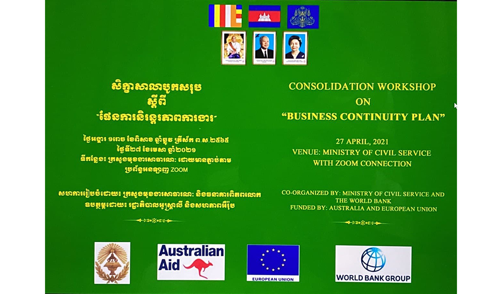 រាជធានីភ្នំពេញ៖ សិក្ខាសាលាមួយតាមប្រព័ន្ធអនឡាញដែលរៀបចំដោយក្រសួងមុខងារសាធារណៈ សហការជាមួយធនាគារពិភពលោក និងមានការគាំទ្រថវិកាដោយមូលនិធិ Trust Fund របស់រដ្ឋាភិបាលអូស្រ្តាលី និងសហភាពអឺរ៉ុប (EU) បានបូកសរុប និងវាយតម្លៃការរៀបចំផែនការបន្តនិរន្តរភាពការងារ (Business Continuity Plan-BCP) របស់សា្ថប័ន អង្គភាព ក្នុងស្ថានភាពនៃគ្រោះមហន្តរាយនានា ដូចជាការរីករាលដាលជាសកលនៃជំងឺកូវីដ-១៩។ល។
