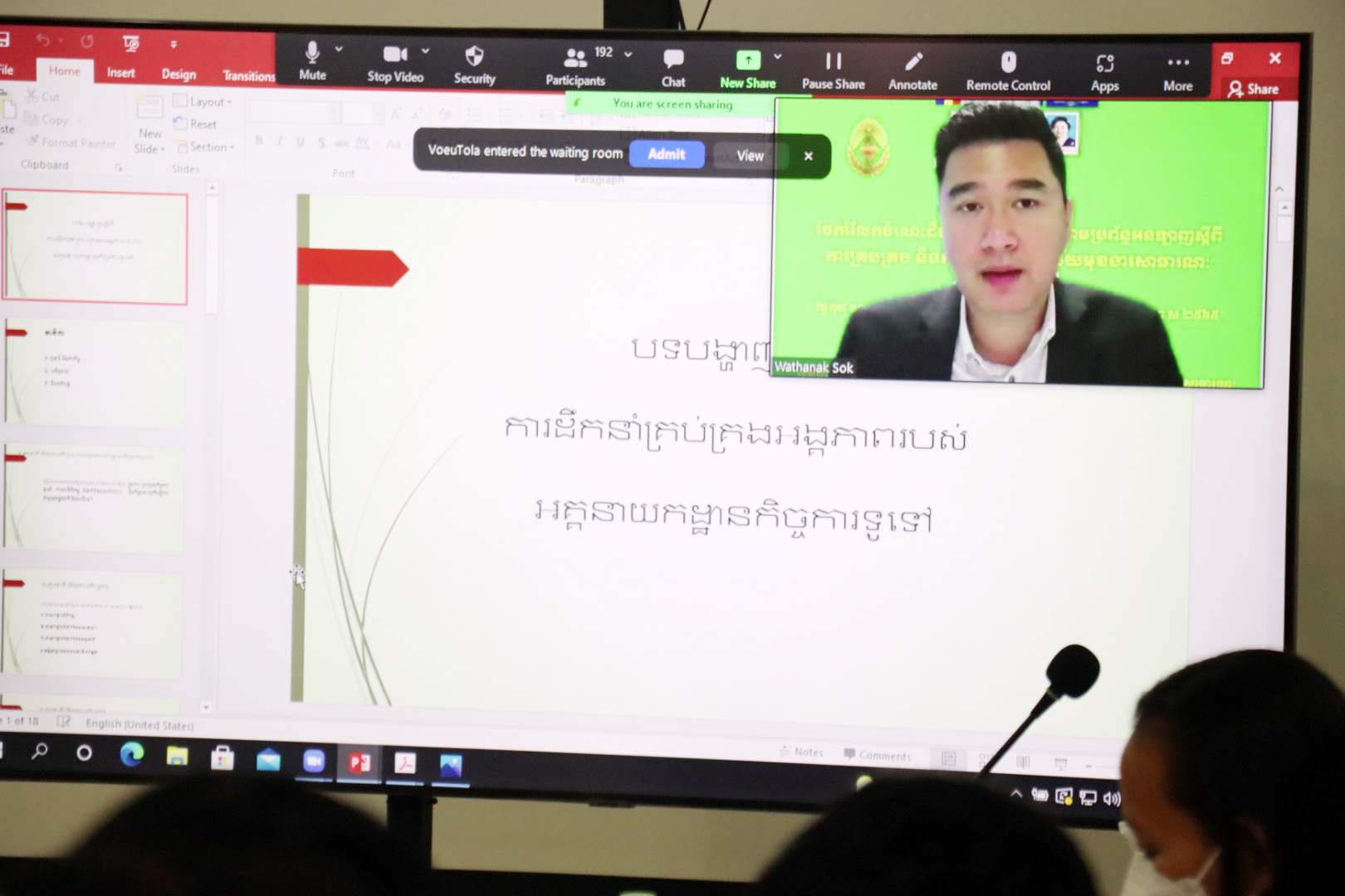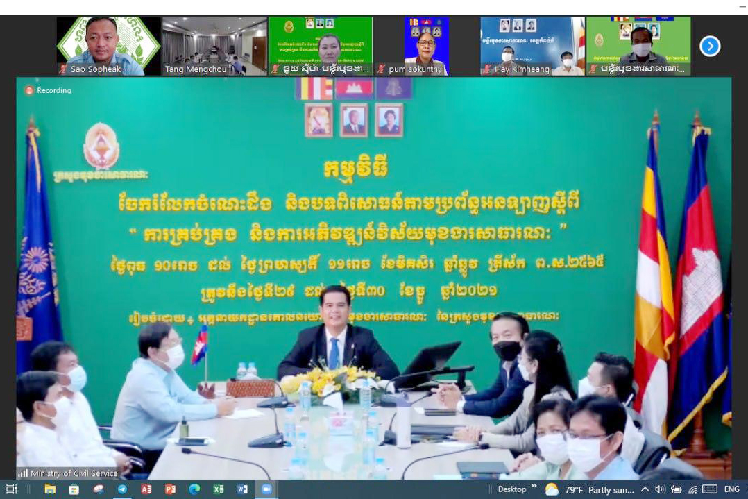 (រាជធានីភ្នំពេញ)៖ នាព្រឹកថ្ងៃទី២៩ ខែធ្នូ ឆ្នាំ២០២១ ក្រសួងមុខងារសាធារណៈបានរៀបចំ ពិធីបើកកម្មវិធីចែករំលែកចំណេះដឹង និង បទពិសោធន៍តាមប្រព័ន្ធអនឡាញ ស្តីពី «ការគ្រប់គ្រង និងការអភិវឌ្ឍន៍វិស័យមុខងារសាធារណៈ» ក្រោមអធិបតីភាព ឯកឧត្តម ប៉ូល ពីឌូ រដ្ឋលេខាធិការក្រសួងមុខងារសាធារណៈ តំណាងដ៏ខ្ពង់ខ្ពស់ ឯកឧត្តម ព្រុំ សុខា រដ្ឋមន្ត្រីក្រសួងមុខងារសាធារណៈ និងជាប្រធាន គណៈកម្មាធិការកែទម្រង់រដ្ឋបាលសាធារណៈ។ កម្មវិធីនេះប្រព្រឹត្តទៅចាប់ពីថ្ងៃទី២៩ ដល់ ថ្ងៃទី៣០ ខែធ្នូ ឆ្នាំ២០២១ ដោយមានសម្របសម្រួលពីអគ្គនាយកដ្ឋានគោលនយោបាយមុខងារសាធារណៈនៃក្រសួងមុខងារសាធារណៈ និងមានអ្នកចូលរួមសរុបប្រមាណ ២០៨នាក់ ក្នុងនោះស្រ្តីចំនួន ៥៨នាក់ ដែលមកពីគ្រប់អង្គភាពនៅទីស្តីការក្រសួងមុខងារសាធារណៈ និងគ្រប់មន្ទីរមុខងារសាធារណៈ រាជធានី-ខេត្ត។