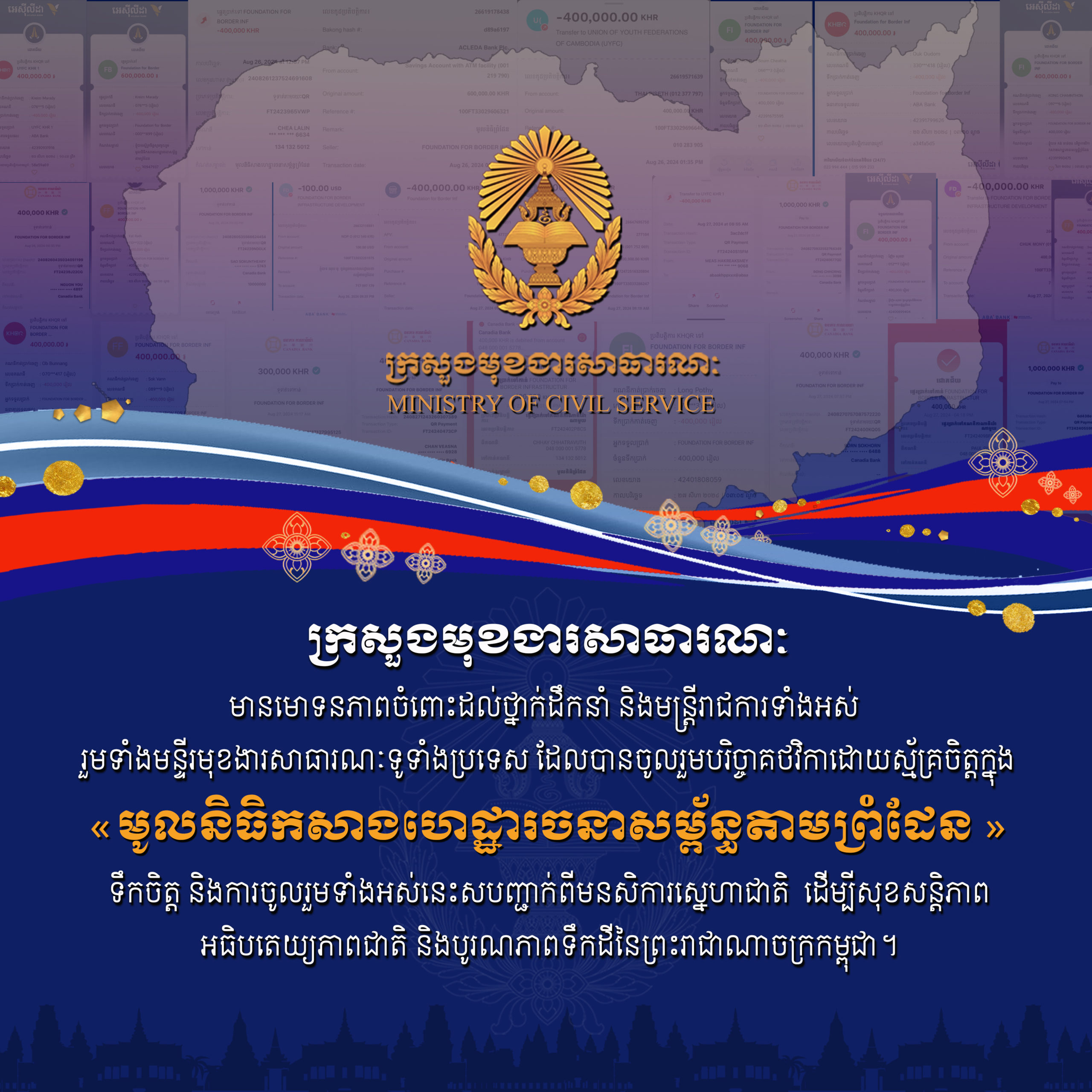 ក្រសួងមុខងារសាធារណៈ សូមថ្លែងអំណរគុណយ៉ាងជ្រាលជ្រៅចំពោះសន្តានចិត្តរបស់ ឯកឧត្តម លោកជំទាវ លោក លោកស្រី ជាថ្នាក់ដឹកនាំ និងមន្ត្រីរាជការទាំងអស់នៃក្រសួងមុខងារសាធារណៈ រួមទាំងមន្ទីរមុខងារសាធារណៈទូទាំងប្រទេស ដែលបានចូលរួមបរិច្ចេកនូវថវិកាដោយស្ម័គ្រចិត្ត ក្នុង «មូលនិធិកសាងហេដ្ឋារចនាសម្ព័ន្ធតាមព្រំដែន» ជាមួយរាជរដ្ឋាភិបាល ដើម្បីកសាងហេដ្ឋារចនាសម្ព័ន្ធតាមបណ្តោយព្រំដែន ដោយផ្តោតលើការកសាងផ្លូវក្រវាត់ព្រំដែន
