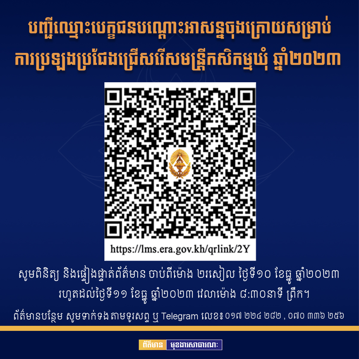 សូមបេក្ខជនពិនិត្យ និងផ្ទៀងផ្ទាត់ព័ត៌មានរបស់ខ្លួនចាប់ពីម៉ោង ២រសៀល ថ្ងៃទី១០ ខែធ្នូ ឆ្នាំ២០២៣ រហូតដល់ថ្ងៃទី១១ ខែធ្នូ ឆ្នាំ២០២៣ វេលាម៉ោង ៨:៣០នាទី ព្រឹក តាមរយៈ (link)៖ https://lms.era.gov.kh/qrlink/2Y ឬ ឯកសារជាប្រភេទ PDF៖ https://lms.era.gov.kh/qrlink/31 និង QR Code ដូចមានភ្ជាប់ជូន។