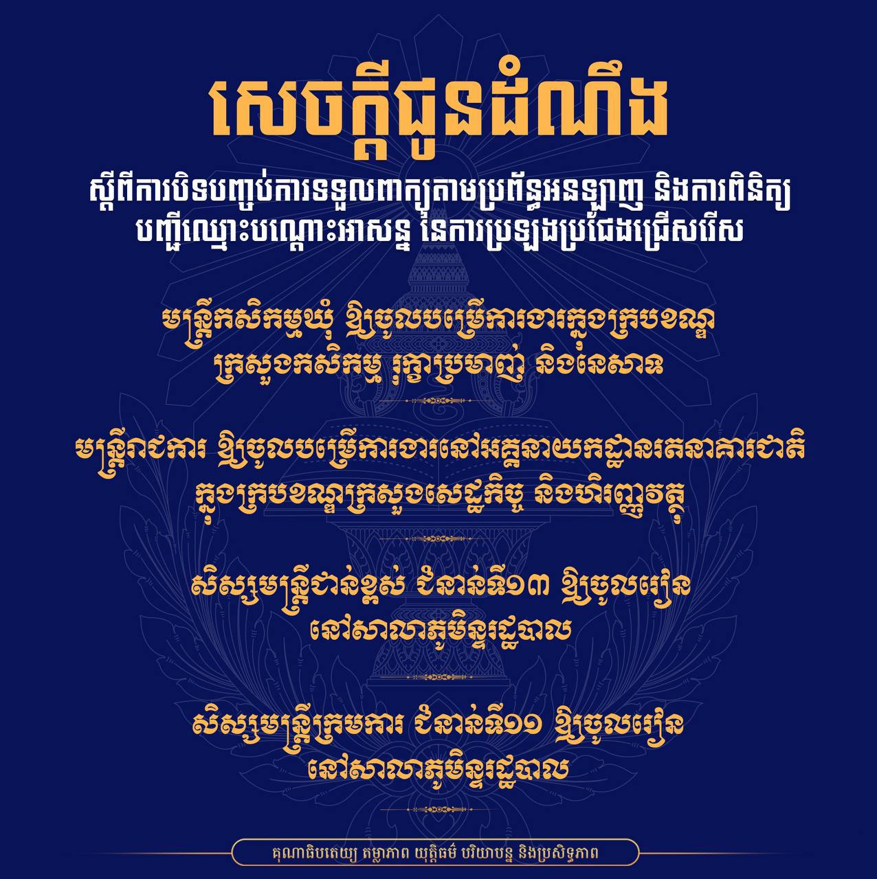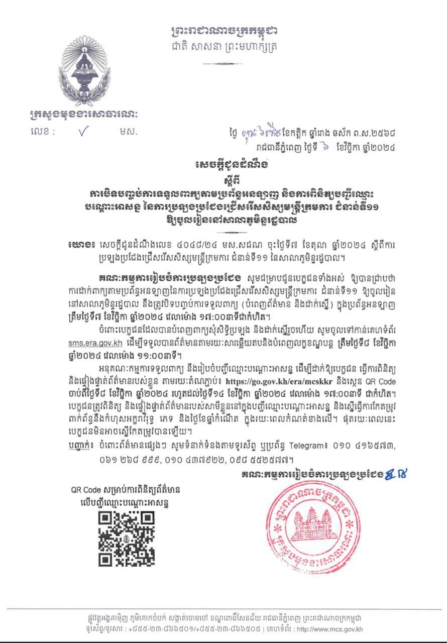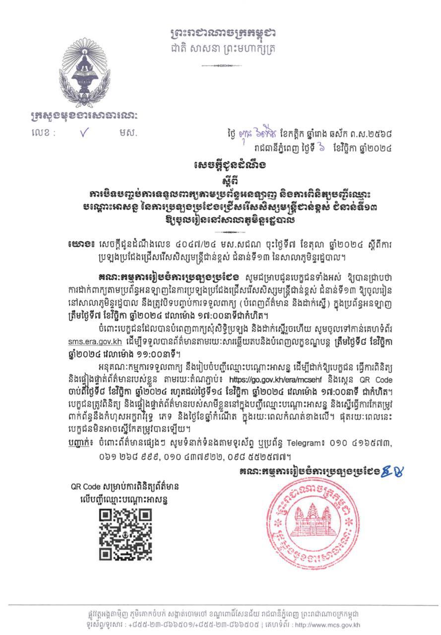 បញ្ជាក់៖ បេក្ខជនត្រូវពិនិត្យ និងរផ្ទៀងផ្ទាត់ព័ត៌មានរបស់សាមីខ្លួន នៅក្នុងបញ្ជីឈ្មោះបណ្តោះអាសន្ន និងស្នើធ្វើការកែតម្រូវ ពាក់ព័ន្ធនឹងកំហុសអក្ខរាវិរុទ្ធ ភេទ និងថ្ងៃខែឆ្នាំកំណើត ក្នុងរយៈពេលកំណត់ខាងលើ។ ផុតរយៈពេលនេះបេក្ខជនមិនអាចស្នើកែតម្រូវបានឡើយ។ ចំពោះព័ត៌មានផ្សេងៗ សូមទំនាក់ទំនងតាមទូរស័ព្ទ ឬប្រព័ន្ធ Telegrams ០១០ ៤១៦ ៥៧៣, ០៦១ ២៦៨ ៩៩៩, ០១០ ៤៣៧ ៩២២, ០៩៨ ៥៥២ ៥៧៧។