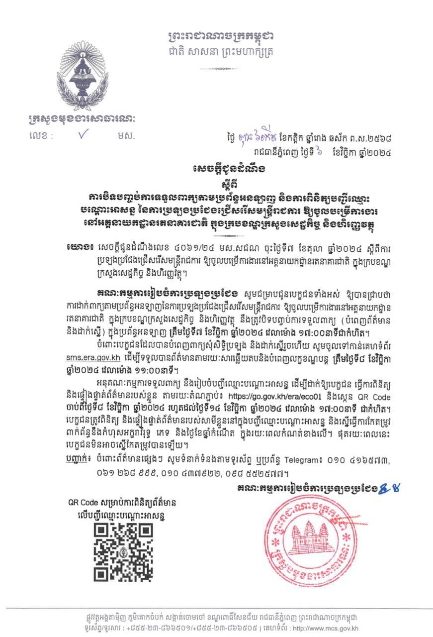 គណៈកម្មការរៀបចំការប្រឡងប្រជែង សូមជូនដំណឹងអំពីការបិទបញ្ចប់ការទទួលពាក្យ​តាមប្រព័ន្ធអនឡាញ និងការពិនិត្យបញ្ជីឈ្មោះបណ្តោះអាសន្ន​តាមតំណភ្ជាប់ដូចខាងក្រោម
