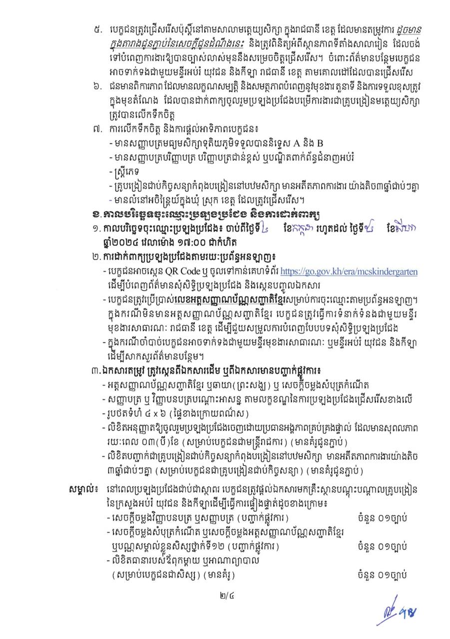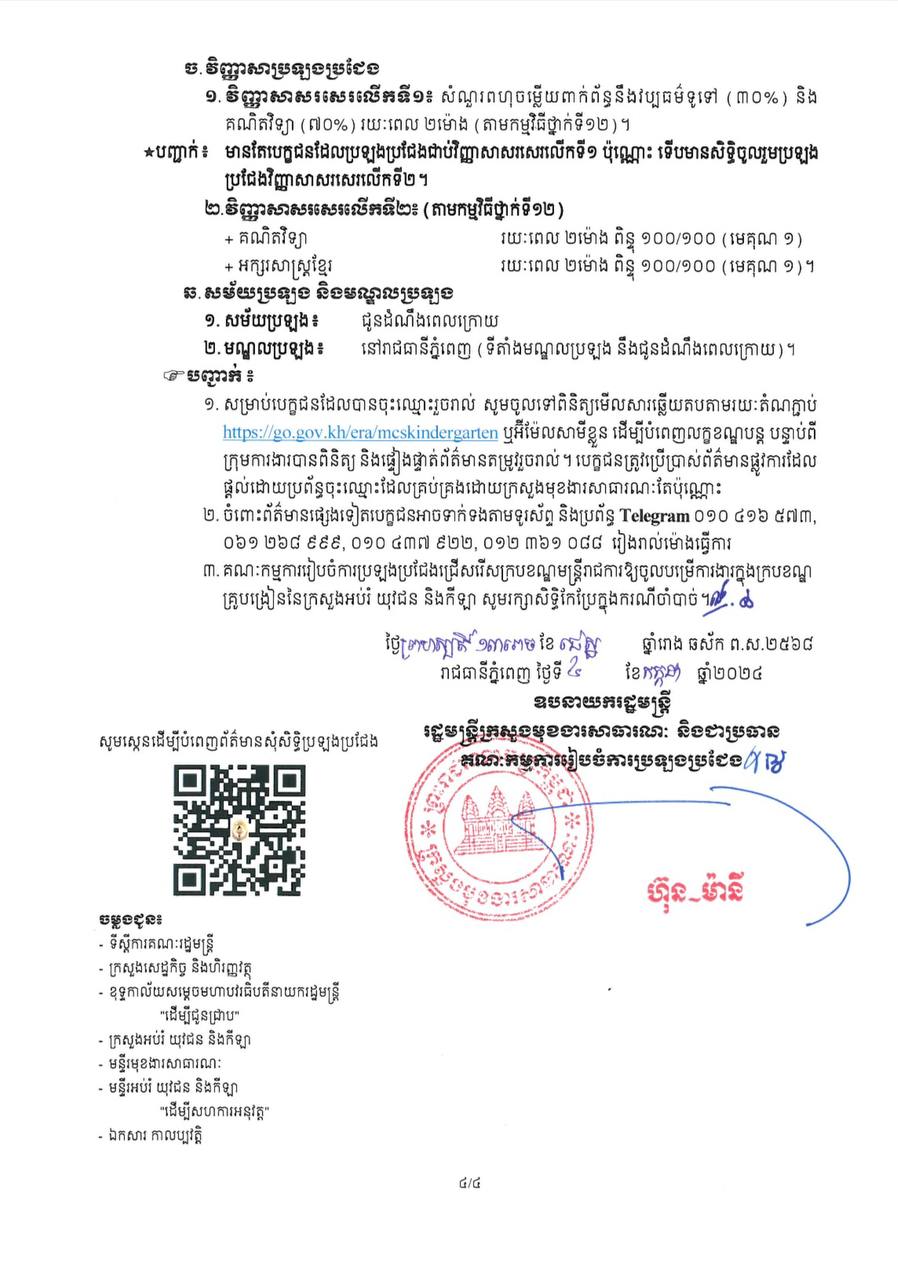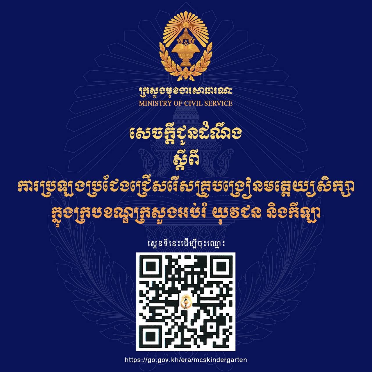 ចំពោះបេក្ខជនដែលបានដាក់ពាក្យសុំសិទ្ធិប្រឡងរួចហើយ សូមបេក្ខជនធ្វើការពិនិត្យ និងផ្ទៀងផ្ទាត់ព័ត៌មាន តាមរយៈតំណភ្ជាប់ (link) https://go.gov.kh/era/mcskindergarten ឬ ស្តេន QR Code ចាប់ពីថ្ងៃទី៤ ខែកក្កដា ឆ្នាំ២០២៤ រហូត ដល់ថ្ងៃទី០៥ ខែសីហា ឆ្នាំ២០២៤ វេលាម៉ោង ១៧:០០នាទីជាកំហិត៕