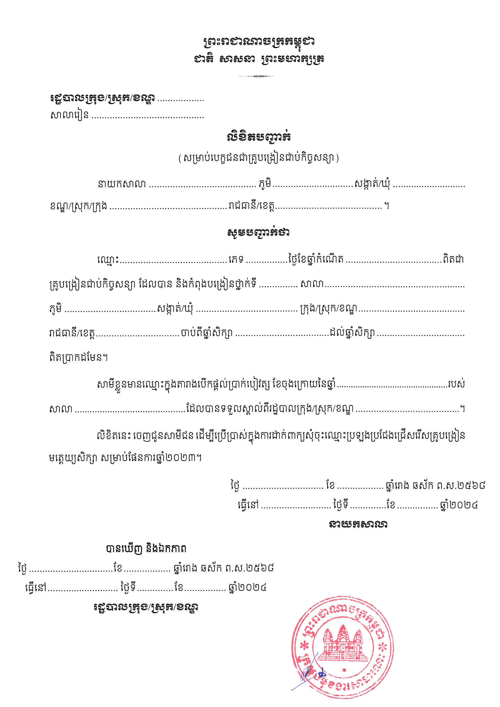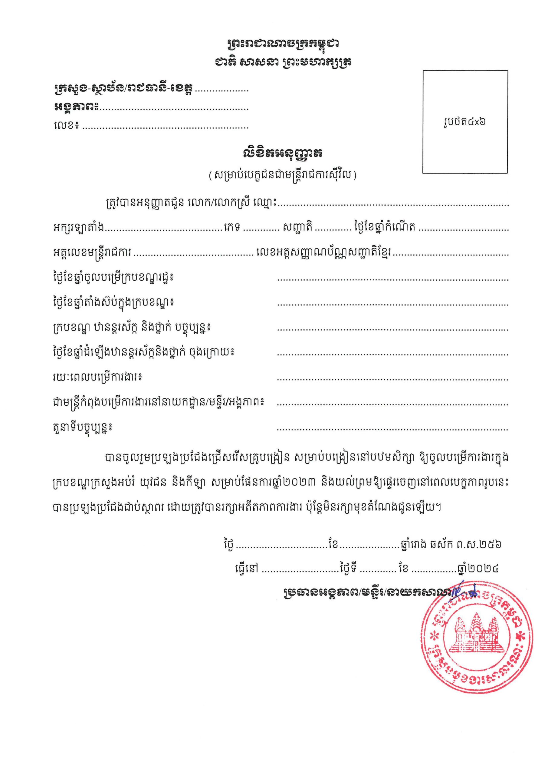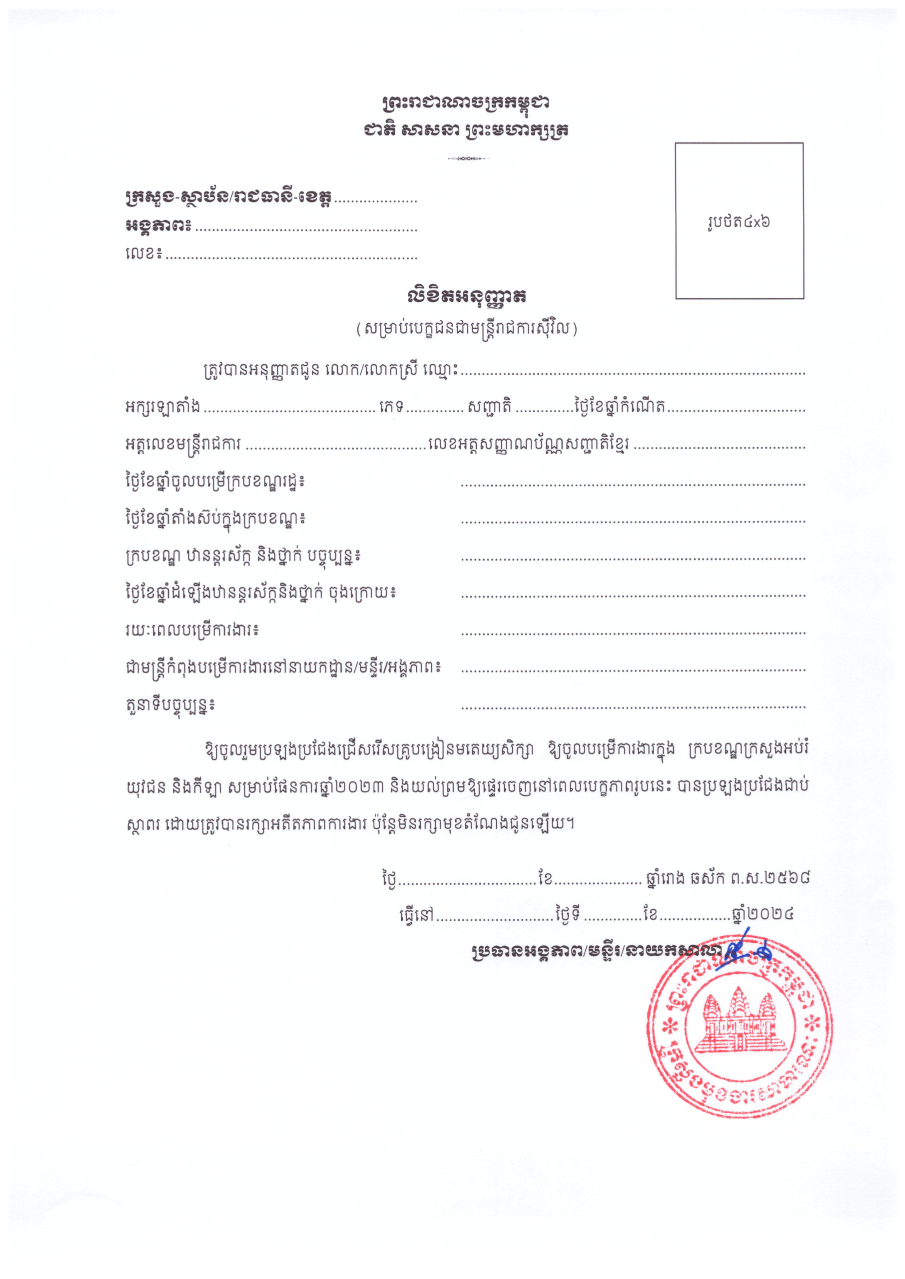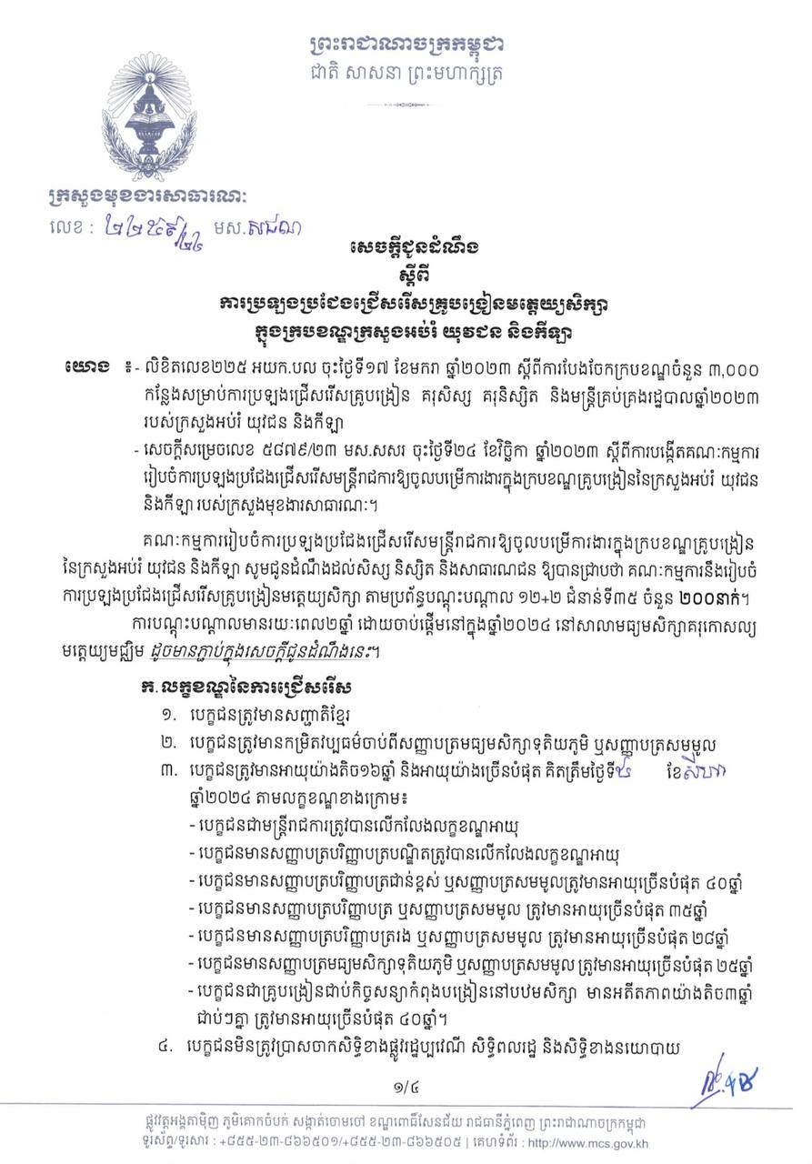 គណៈកម្មការរៀបចំការប្រឡងប្រជែងជ្រើសរើសមន្ត្រីរាជការ សូមជូនដំណឹងដល់សិស្ស និស្សិត និងសាធារណជន ឱ្យបានជ្រាបថា គណៈកម្មការ នឹងរៀបចំការប្រឡងប្រជែងជ្រើសរើសគ្រូបង្រៀនមត្តេយ្យសិក្សា តាមប្រព័ន្ធបណ្តុះបណ្តាល ១២+២ ជំនាន់ទី៣៥ ចំនួន ២០០នាក់