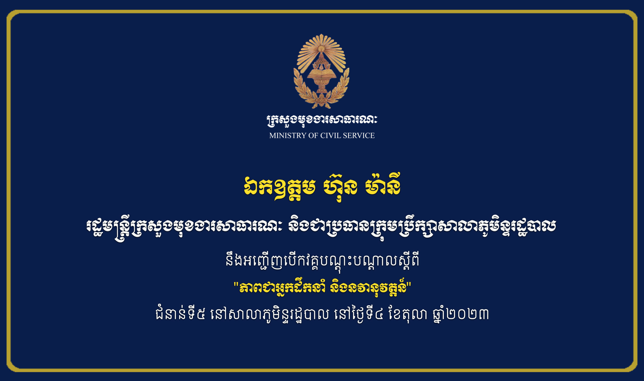 ថ្ងៃស្អែកនេះ ឯកឧត្តម ហ៊ុន ម៉ានី រដ្ឋមន្រ្តីក្រសួងមុខងារសាធារណៈ និងជាប្រធានក្រុមប្រឹក្សាសាលាភូមិន្ទរដ្ឋបាលនឹងអញ្ជើញចូលរួមពិធីបើកវគ្គបណ្ដុះបណ្ដាលស្តីពី «ភាពជាអ្នកដឹកនាំ និងនវានុវត្តន៍» ជំនាន់ទី៥ នៅសាលាភូមិន្ទរដ្ឋបាល