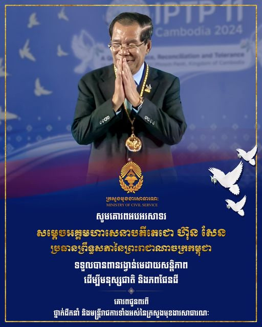 ថ្នាក់ដឹកនាំ និងមន្ត្រីរាជការទាំងអស់នៃក្រសួងមុខងារសាធារណៈ សូមសម្តែងនូវអំណរសាទរយ៉ាងក្រៃលែងជូនចំពោះ សម្តេចអគ្គមហាសេនាបតីតេជោ ហ៊ុន សែន ប្រធានព្រឹទ្ធសភា និងជាប្រធានក្រុមឧត្តមប្រឹក្សាផ្ទាល់ព្រះមហាក្សត្រ ដែលត្រូវបាន សភាអន្តរជាតិ ដើម្បីការអត់ឱន និងសន្តិភាព (IPTP) នៃក្រុមប្រឹក្សាសកល ដើម្បីការអត់ឱន និងសន្តិភាព (GCTP) ប្រគល់«ពានរង្វាន់មេដាយសន្តិភាព ដើម្បីមនុស្សជាតិ និងភពផែនដី» នាសម័យប្រជុំពេញអង្គលើកទី១១ របស់ IPTP ដែលប្រព្រឹត្តទៅកាលពីថ្ងៃទី ២៣-២៥ ខែវិច្ឆិកា ឆ្នាំ២០២៤ នៅរាជធានីភ្នំពេញ