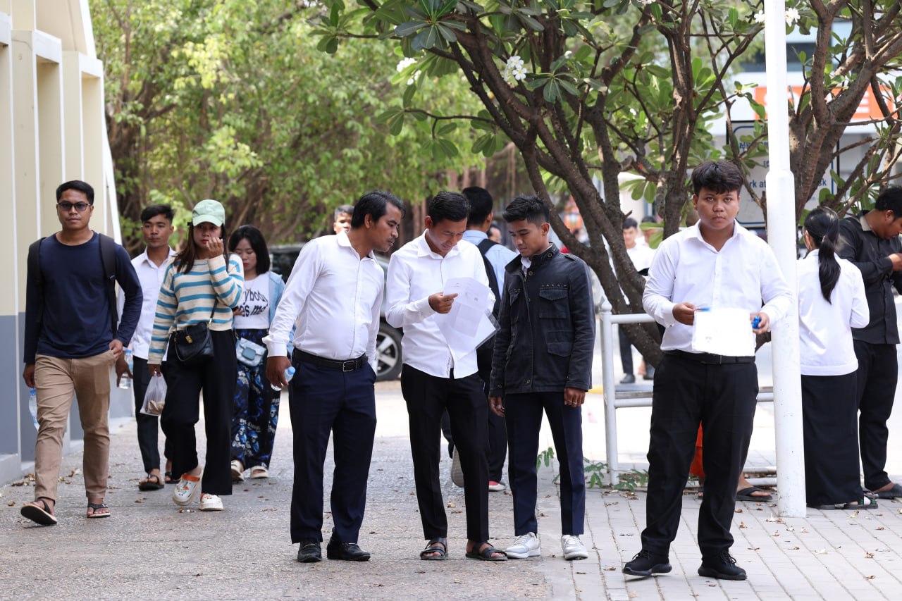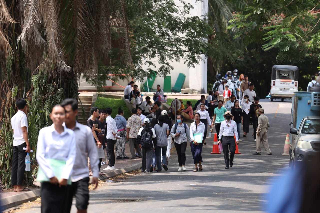 បេក្ខជនបានមកដល់មណ្ឌលប្រឡងជាបន្តបន្ទាប់ ដើម្បីចូលរួមប្រឡងប្រជែងគ្រូបង្រៀនអនុវិទ្យាល័យ ស្ថិតក្នុងសាកលវិទ្យាល័យភូមិន្ទភ្នំពេញ