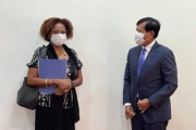 (ភ្នំពេញ)៖ ព្រឹកថ្ងៃទី១៦ ខែកញ្ញា ឆ្នាំ២០២១ លោកជំទាវ ម៉ារីយ៉ាម សាលីម ប្រធានថ្មីធនាគារពិភពលោកប្រចាំកម្ពុជា បានចូលជួបសម្តែងការគួរសម និងពិភាក្សាការងារជាមួយឯកឧត្តម ព្រុំ សុខា រដ្ឋមន្ត្រីក្រសួងមុខងារសាធារណៈ នៅទីស្តីការក្រសួង។