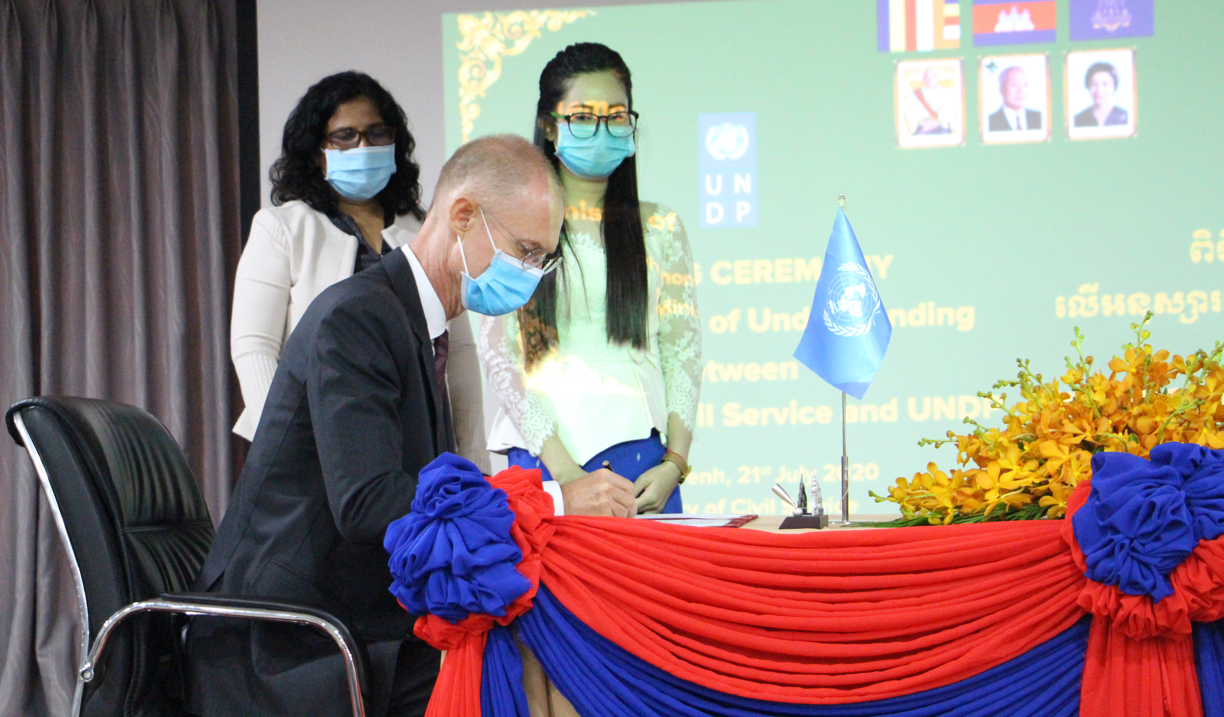 រាជធានីភ្នំពេញ៖ នារសៀលថ្ងៃអង្គារ ១កើត ខែស្រាពណ៍ ឆ្នាំជូត ទោស័ក ព.ស ២៥៦៤ ត្រូវនឹងថ្ងៃទី២១ ខែកក្កដា ឆ្នាំ២០២០ នៅទីស្តីការក្រសួងមុខងារសាធារណៈ មានការរៀបចំពិធីចុះហត្ថលេខាលើអនុស្សារណៈនៃការយោគយល់គ្នារវាងក្រសួងមុខងារសាធារណៈនិងកម្មវិធីអភិវឌ្ឍសហប្រជាជាតិ (UNDP) ក្រោមអធិបតីភាព ឯកឧត្តម ព្រុំ សុខា រដ្ឋមន្រ្តីក្រសួងមុខងារសាធារណៈ និង លោក Nick Beresford តំណាងនិវេសនដ្ឋាននៃកម្មវិធីអភិវឌ្ឍសហប្រជាជាតិប្រចាំកម្ពុជា ព្រមទាំងថ្នាក់ដឹកនាំ និងមន្រ្តីជាន់ខ្ពស់របស់ស្ថាប័ន ទាំងពីរ សរុប ៣០ រូប។