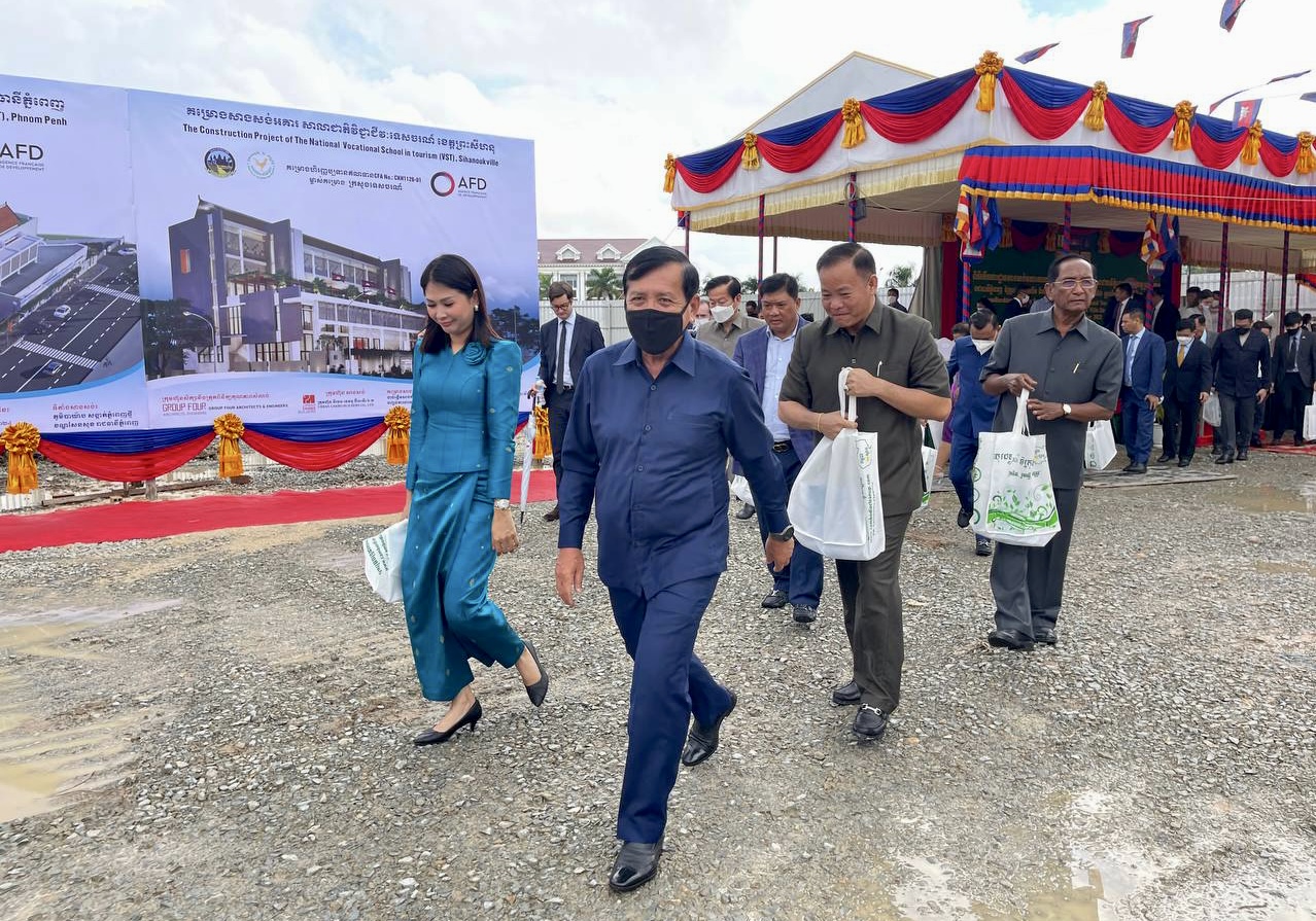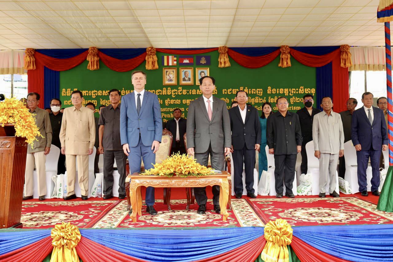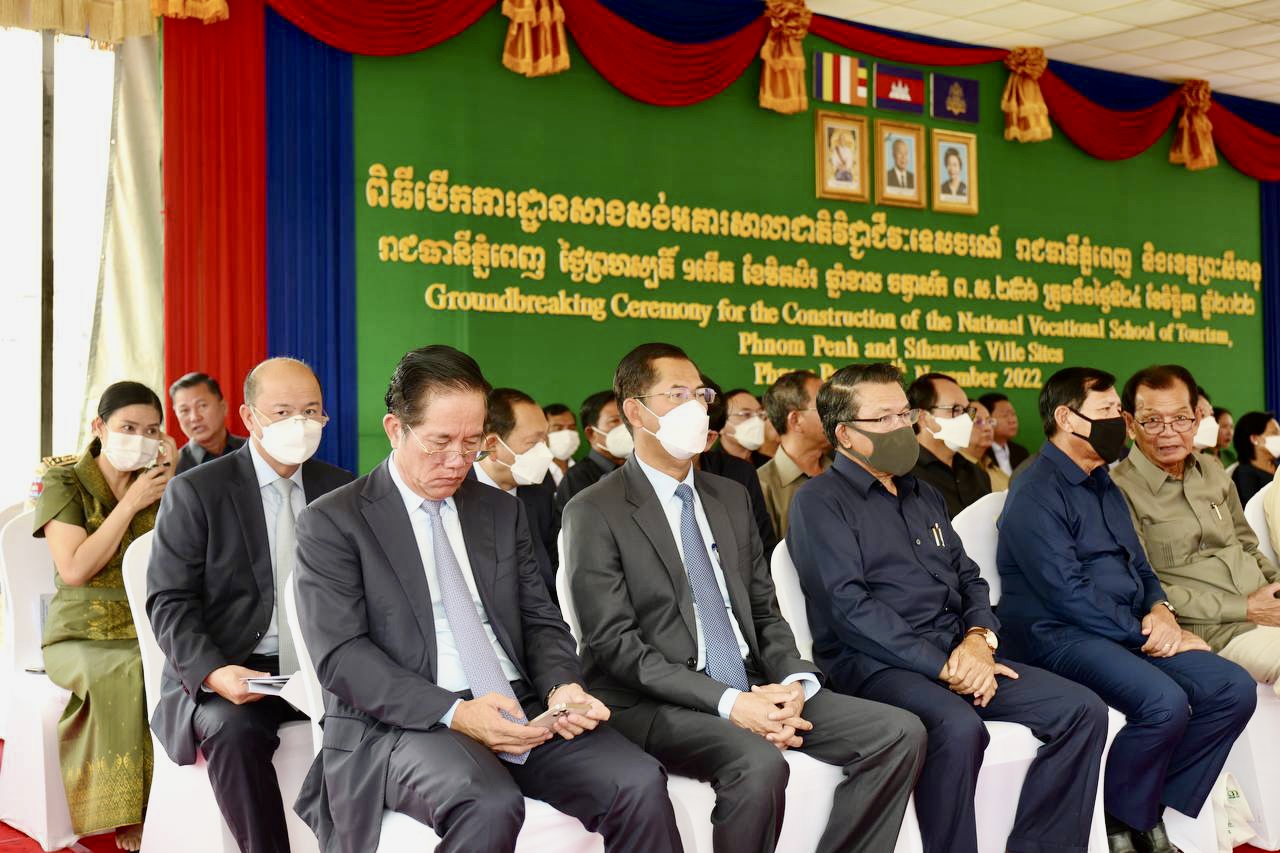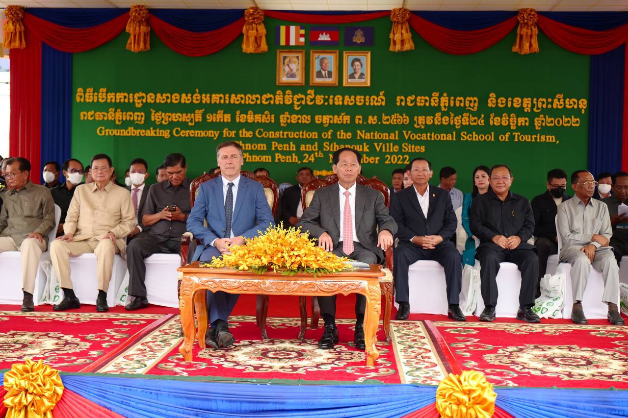 (ភ្នំពេញ)៖ នាព្រឹកថ្ងៃទី២៤ ខែវិច្ឆិកា ឆ្នាំ២០២២ ឯកឧត្តមឧបនាយករដ្ឋមន្ត្រី ជា សុផារ៉ា រដ្ឋមន្ត្រីក្រសួងដែនដី នគរូបនីយកម្ម និងសំណង់ តំណាងដ៏ខ្ពង់ខ្ពស់​ សម្តេច​អគ្គមហាសេនាបតី​តេជោ​ ហ៊ុន​ សែន​ នាយករដ្ឋមន្ត្រី​នៃ​ព្រះរាជាណាចក្រ​កម្ពុជា​ រួមជាមួយឯកឧត្តមJacques PELLET ឯកអគ្គរដ្ឋទូតវិសាមញ្ញ​ និងពេញសមត្ថភាព​ នៃសាធារណរដ្ឋបារាំងប្រចាំនៅព្រះរាជាណាចក្រកម្ពុជា បានអញ្ជើញ​ជា​អធិបតី​ក្នុង​ពិធី​បេីកការដ្ឋានសាងសង់អគារសាលាជាតិវិជ្ជាជីវៈទេសចរណ៍។ ក្នុងពិធីនេះ ក៏មានវត្តមានឯកឧត្តមរដ្ឋមន្ត្រីក្រសួងមុខងារសាធារណៈផងដែរ៕