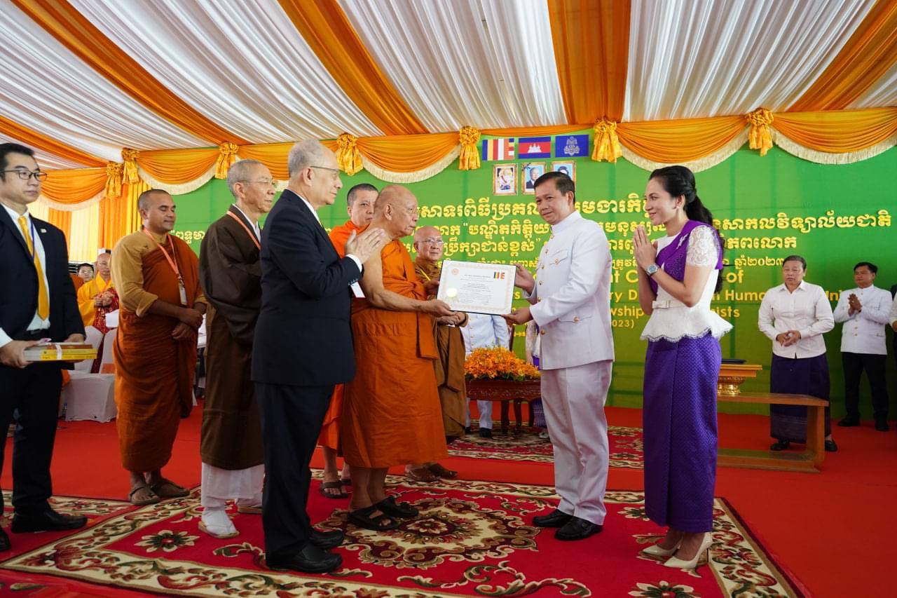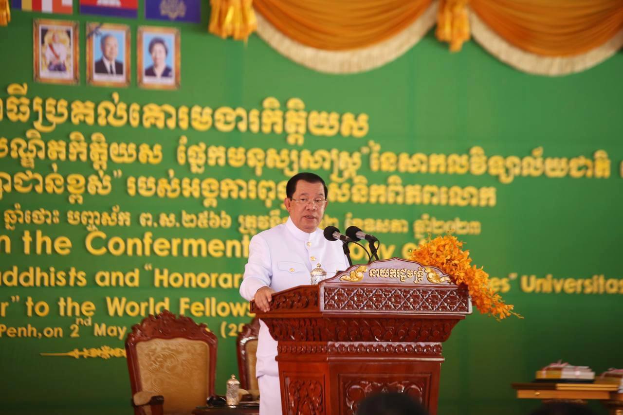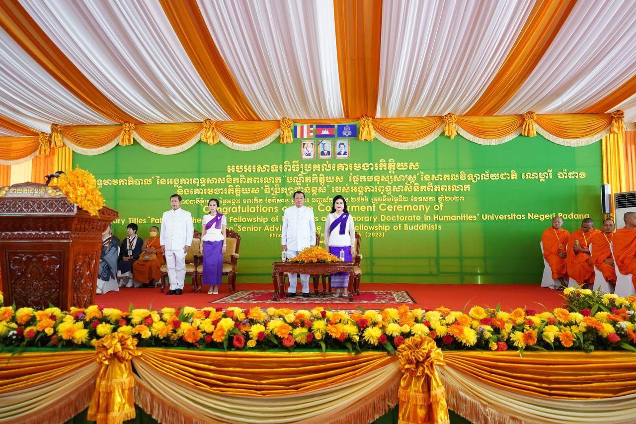 (ភ្នំពេញ)៖ នាព្រឹកថ្ងៃទីអង្គារ ១៣កើត ខែពិសាខ ឆ្នាំថោះ បញ្ចស័ក ព.ស.២៥៦៦ ត្រូវនឹងថ្ងៃទី២ ខែឧសភា ឆ្នាំ២០២៣ នេះពិធីប្រកាស និងប្រគល់ជូនគោរមងារកិត្តិយស «ពុទ្ធមាមកាភិបាល» របស់អង្គការពុទ្ធសាសនិកពិភពលោក និង បណ្ឌិតកិត្តិយស ផ្នែកមនុស្សសាស្ត្រ ដោយសាកលវិទ្យាល័យជាតិ ណេហ្គរី ប៉ាដាង ជូនសម្តេចតេជោ ហ៊ុន សែន នាយករដ្ឋមន្រ្តីនៃកម្ពុជា និងគោរមងារកិត្តិយស «ទីប្រឹក្សាជាន់ខ្ពស់» របស់អង្គការពុទ្ធសាសនិកពិភពលោកជូន ឯកឧត្តមនាយឧត្តមសេនីយ៍បណ្ឌិត ហ៊ុន ម៉ាណែត អគ្គមេបញ្ជាការរងកងយោធពលខេមរភូមិន្ទមេបញ្ជាការកងទ័ពជើងគោក និងជាប្រធានគ្រូពេទ្យស្ម័គ្រចិត្តយុវជនសម្តេចតេជោ (TYDA) ដែលពិធីនេះត្រូវប្រារព្ធធ្វើឡើងនៅរមណីយដ្ឋានវប្បធម៌ ប្រវត្តិសាស្ត្រវត្តភ្នំ បរិវេណរូបសំណាកលោកយាយពេញ សង្កាត់វត្តភ្នំ ខណ្ឌដូនពេញ រាជធានីភ្នំពេញ។ ក្នុងពិធីនេះក៏មានវត្តមានឯកឧត្តម ព្រុំ សុខា រដ្ឋមន្រ្តីក្រសួងមុខងារសាធារណៈ ចូលរួមផងដែរ៕