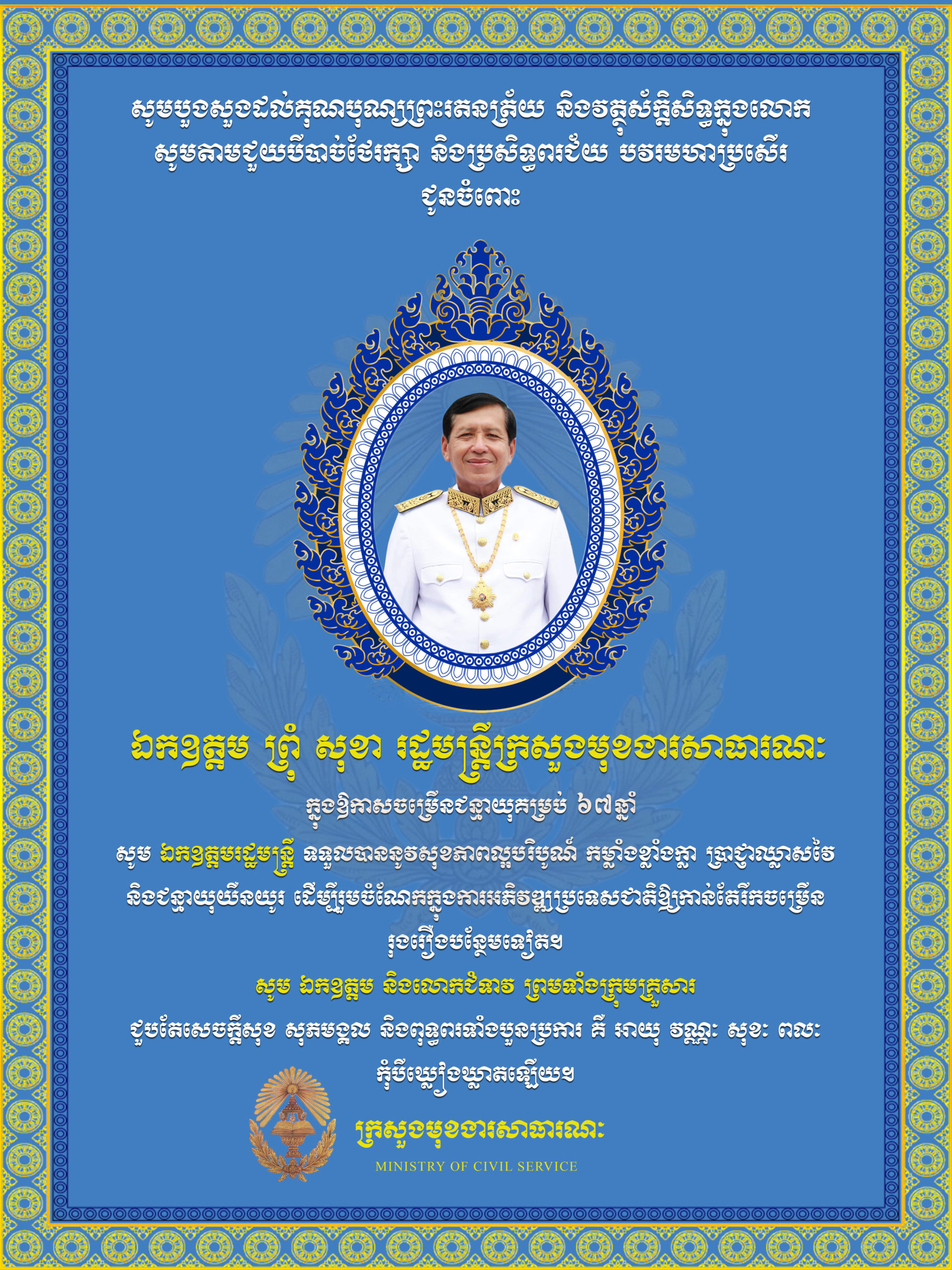 លិខិតគោរពជូនពរពីថ្នាក់ដឹកនាំ និងមន្រ្តីរាជការក្រសួងមុខងារ សាធារណៈ ទាំងអស់ជូនចំពោះឯកឧត្តម ព្រុំ សុខា រដ្ឋមន្រ្តី ក្រសួងមុខងារសាធារណៈ ក្នុងឱកាសចម្រើនជន្មាយុគម្រប់៦៧ ឆ្នាំ