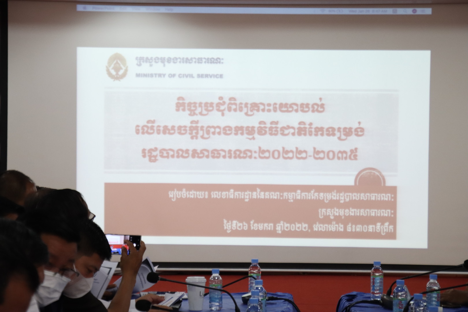 (រាជធានីភ្នំពេញ)៖ នៅថ្ងៃពុធ ៩រោច និងថ្ងៃព្រហស្ប ត្តិ៍ ១០រោច ខែបុស្ស ឆ្នាំឆ្លូវ ត្រីស័ក ព.ស ២៥៦៥ ត្រូវនឹងថ្ងៃទី២៦ និងថ្ងៃទី២៧ ខែមករា ឆ្នាំ២០២២ នៅទីស្តីការក្រសួងមុខងារសាធារណៈ លេខាធិការដ្ឋាននៃគណៈកម្មាធិការកែទម្រង់រដ្ឋបាលសាធារណៈ បានបន្តរៀបចំកិច្ចប្រជុំពិគ្រោះយោបល់លើសេចក្តីព្រាងកម្មវិធីជាតិកែទម្រង់រដ្ឋបាលសាធារណៈ ២០២២-២០៣៥ ជាមួយរដ្ឋបាលថ្នាក់ក្រោមជាតិ និងអគ្គលេខាធិការដ្ឋាន/លេខាធិការដ្ឋាននៃកំណែទម្រង់បីបូកមួយ។