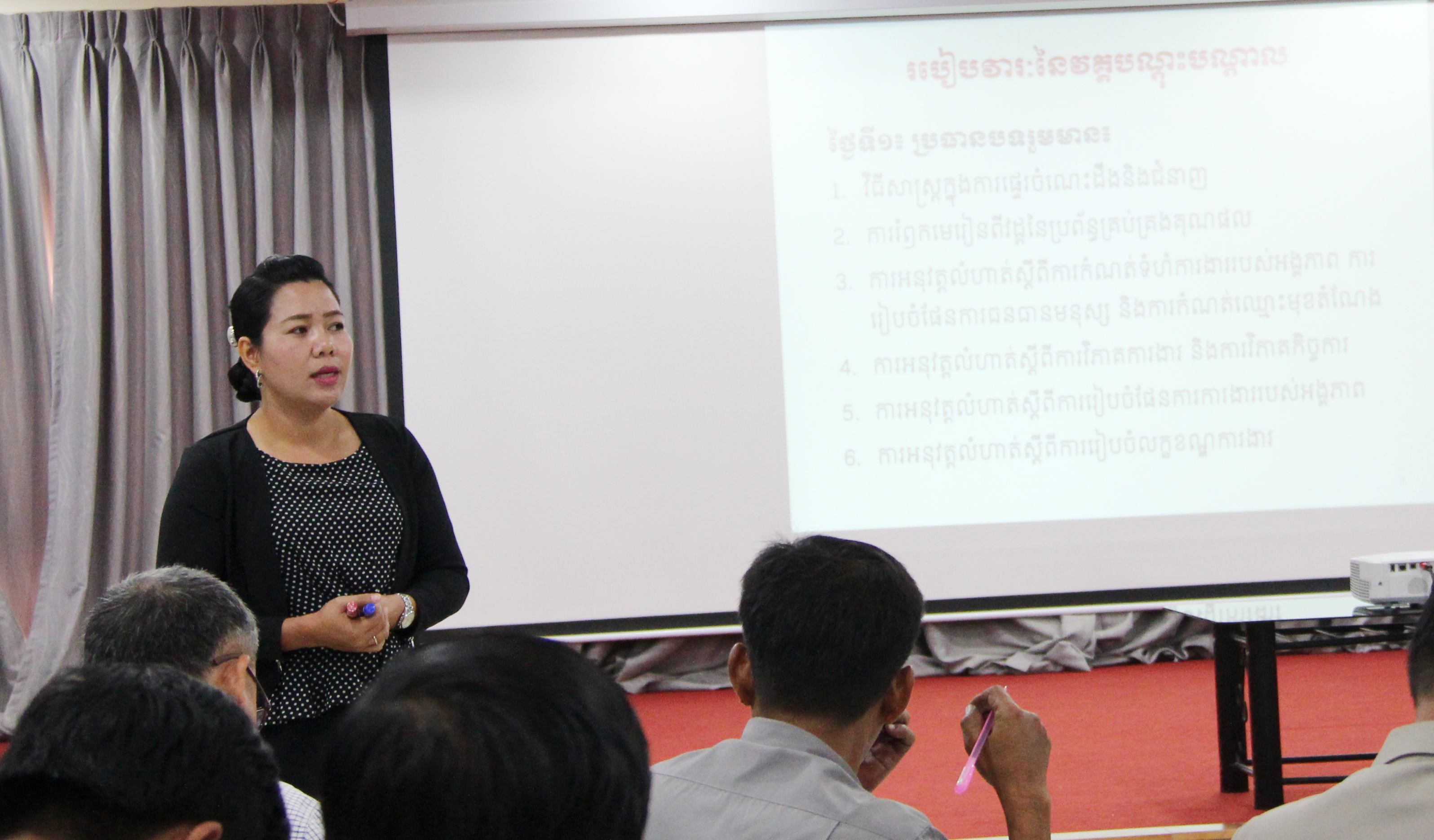 រាជធានីភ្នំពេញ៖ នាព្រឹកថ្ងៃព្រហស្បតិ៍ ៧រោច ខែកត្តិក ឆ្នាំច សំរឹទ្ធិស័ក ព.ស.២៥៦២ ត្រូវនឹងថ្ងៃទី២៩ ខែវិច្ឆិកា ឆ្នាំ២០១៨ នៅទីស្តីការក្រសួងមុខងារសាធារណៈនាយកដ្ឋានអភិវឌ្ឍន៍ធនធានមនុស្សនិងស្ថាប័ន បានរៀបចំវគ្គបណ្តុះបណ្តាលគ្រូបង្គោលលើកទី២ ស្តីពី“ប្រព័ន្ធគ្រប់គ្រងគុណផល” ក្រោមការដឹកនាំដោយឯកឧត្តម គង់ សុភី អគ្គនាយក នៃអគ្គនាយកដ្ឋានគោលនយោបាយមុខងារសាធារណៈ នៃក្រសួងមុខងារសាធារណៈ និង ជាប្រធានលេខា ធិការដ្ឋាននៃ គណៈកម្មាធិការកែទម្រង់រដ្ឋបាលសាធារណៈ ដោយមានសមាសភាពចូលរួមពី អធិការ ប្រធាននាយកដ្ឋាន អនុប្រធាននាយកដ្ឋាន ប្រធានមន្ទីរ និងអនុប្រធានមន្ទីរ សរុបចំនួនប្រមាណ ៥០នាក់ ក្នុងនោះស្រ្តី ១០នាក់។ កម្មវិធីនេះប្រព្រឹត្តទៅរយៈពេល ២ថ្ងៃ ក្នុងគោលបំណងដើម្បីផ្សព្វផ្សាយ និងជំរុញការអនុវត្តប្រព័ន្ធគ្រប់គ្រងគុណផល នៅតាមក្រសួង ស្ថាប័នថ្នាក់ជាតិ និងថ្នាក់ក្រោមជាតិ និង ឱ្យសិក្ខាកាមជាគ្រូបង្គោលមានឱកាសអនុវត្តផ្ទាល់ ក្នុងការរៀបចំឧបករណ៍នៃធាតុទាំង៧ របស់ប្រព័ន្ធគ្រប់គ្រងគុណផល និងរៀនពីរបៀបផ្ទេរចំណេះដឹង ហើយត្រៀមលក្ខណៈផ្ទេរចំណេះដឹងទៅដល់ក្រសួង ស្ថាប័នថ្នាក់ជាតិ និងថ្នាក់ក្រោមជាតិ ។
