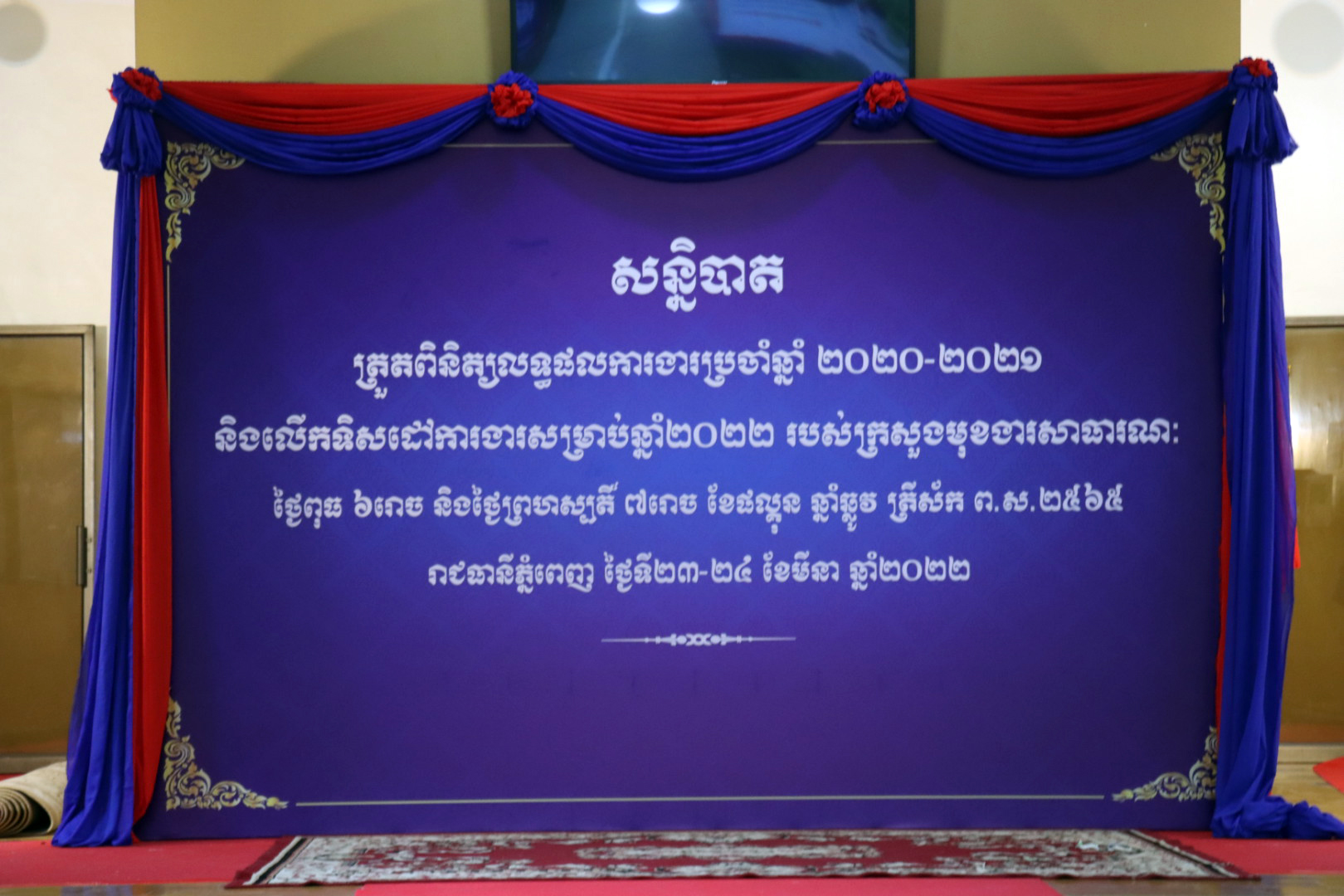 (ភ្នំពេញ)៖ នាព្រឹកថ្ងៃពុធ ៦រោច ខែផល្គុន ឆ្នាំឆ្លូវ ត្រីស័ក ព.ស.២៥៦៥ ត្រូវនឹងថ្ងៃទី២៣ ខែមីនា ឆ្នាំ២០២២ ឯកឧត្តម ព្រុំ សុខា រដ្ឋមន្ត្រីនៃក្រសួងមុខងារសាធារណៈ និងជាប្រធានគណៈកម្មាធិការកែទម្រង់រដ្ឋបាលសាធារណៈ បានអញ្ជើញជាអធិបតីក្នុងពិធីបើកសន្និបាតត្រួតពិនិត្យលទ្ធផលការងារប្រចាំឆ្នាំ២០២០-២០២១ និងលើកទិសដៅការងារសម្រាប់ឆ្នាំ២០២២ របស់ក្រសួងមុខងារសាធារណៈ។