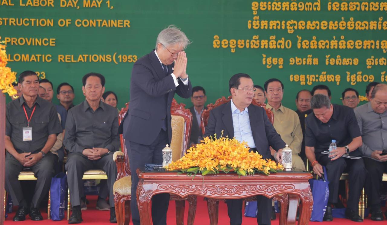 (ព្រះសីហនុ​)៖ នៅព្រឹកថ្ងៃចន្ទ ១២កើត ខែពិសាខ ឆ្នាំថោះ បញ្ចស័ក ព.ស.២៥៦៦ ត្រូវនឹងថ្ងៃទី០១ ខែឧសភា ឆ្នាំ២០២៣ នេះ សម្តេចអគ្គមហាសេនាបតីតេជោ ហ៊ុន សែន នាយករដ្ឋមន្រ្តី នៃព្រះរាជាណាចក្រកម្ពុជា និងឯកឧត្តម UENO Atsushi ឯកអគ្គរាជទូតជប៉ុនប្រចាំនៅកម្ពុជា បានអញ្ជើញជាអធិបតីភាពដ៏ខ្ពង់ខ្ពស់នៅក្នុងពិធី អបអរសាទរខួបអនុស្សាវរីយ៍លើកទី១៣៧ នៃទិវាពលកម្មអន្តរជាតិ១ឧសភា ពិធីបើកការដ្ឋានសាងសង់ចំណតផែកុងតឺន័រ នៅខេត្តព្រះសីហនុ និងពិធីអបអរសាទរខួបអនុស្សាវរីយ៍លើកទី៧០ នៃទំនាក់ទំនងការទូតរវាងកម្ពុជា និងជប៉ុន ដែលប្រារព្ធធ្វើឡើងនៅចំណតកំពង់ផែក្រុងព្រះសីហនុ។​ ក្នុង​ពិធី​នេះក៏មានវត្តមាន​ ឯកឧត្ដម​ គង់​ សុភី​ រដ្ឋលេខាធិកា​រ​ តំណាង​ ឯកឧត្ដម​រដ្ឋមន្ត្រី​ក្រសួង​មុខងារ​សាធារណៈ​ ចូលរួម​ផងដែរ៕