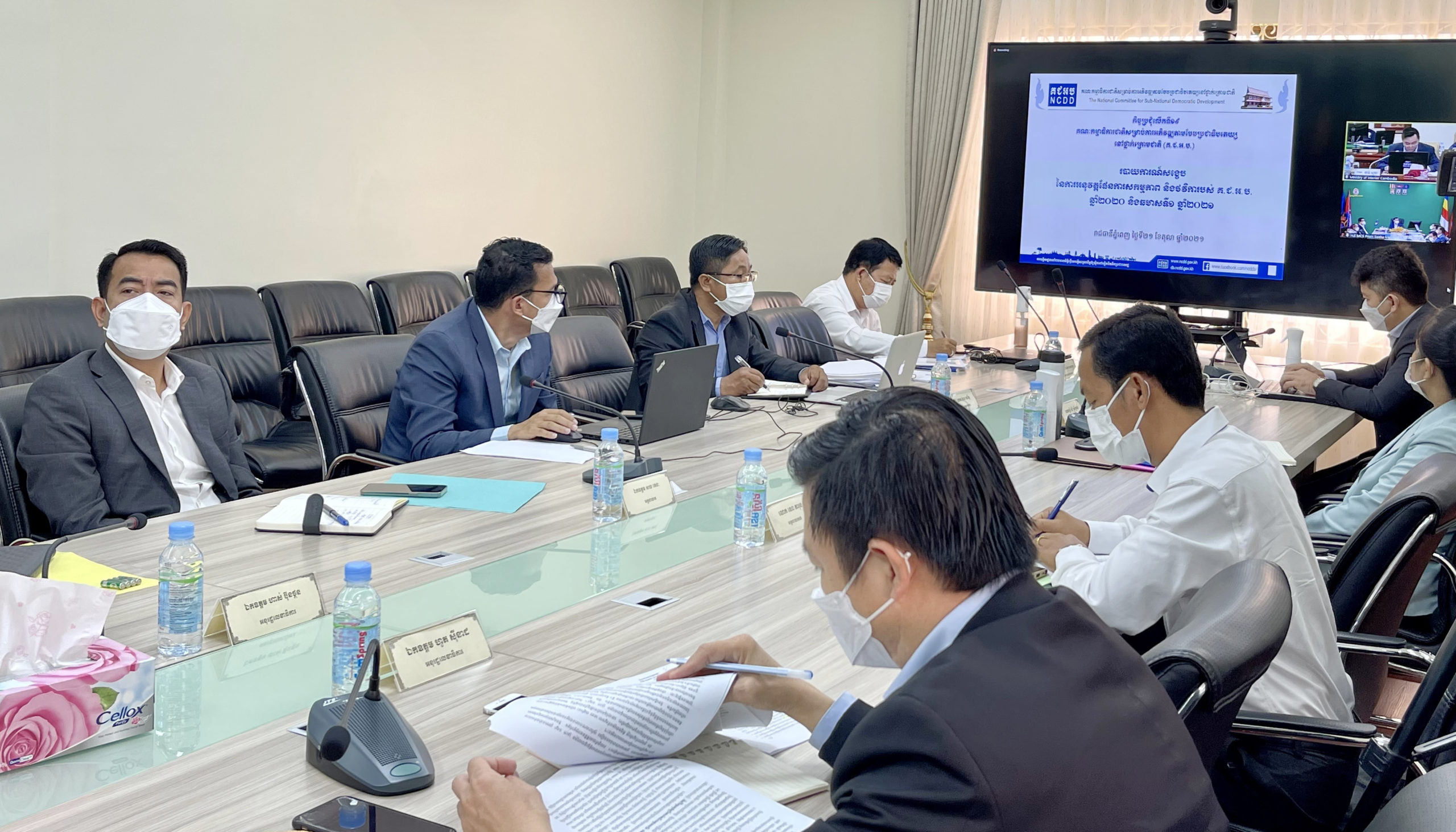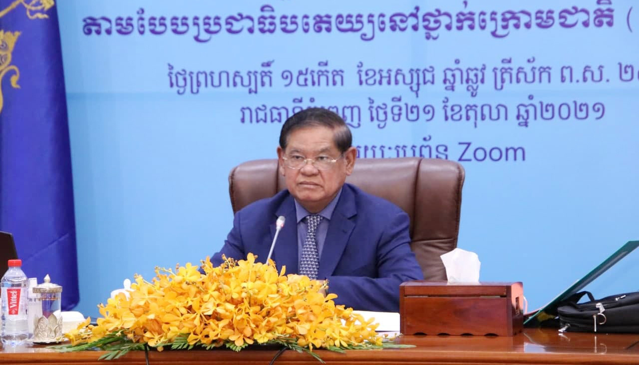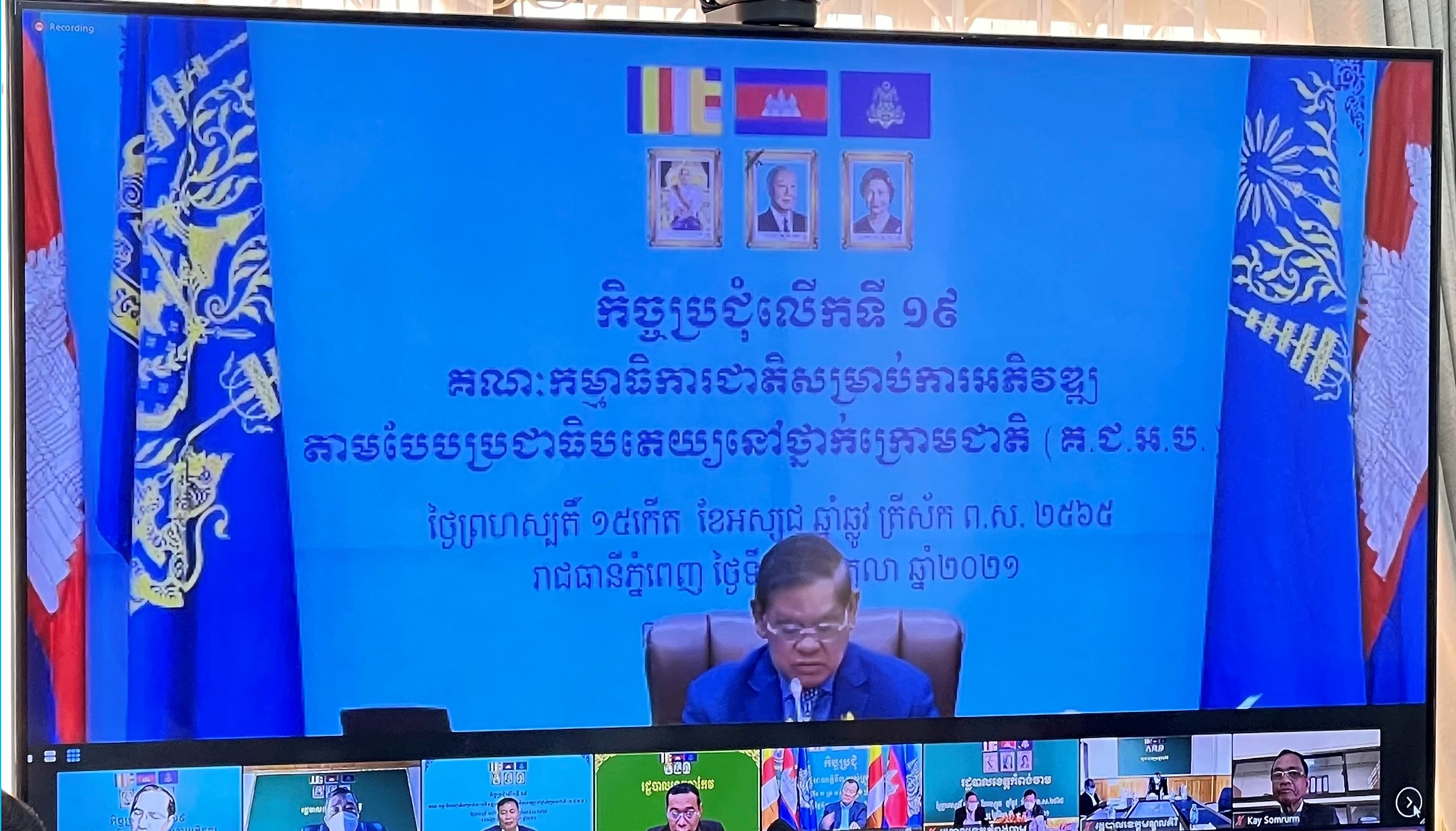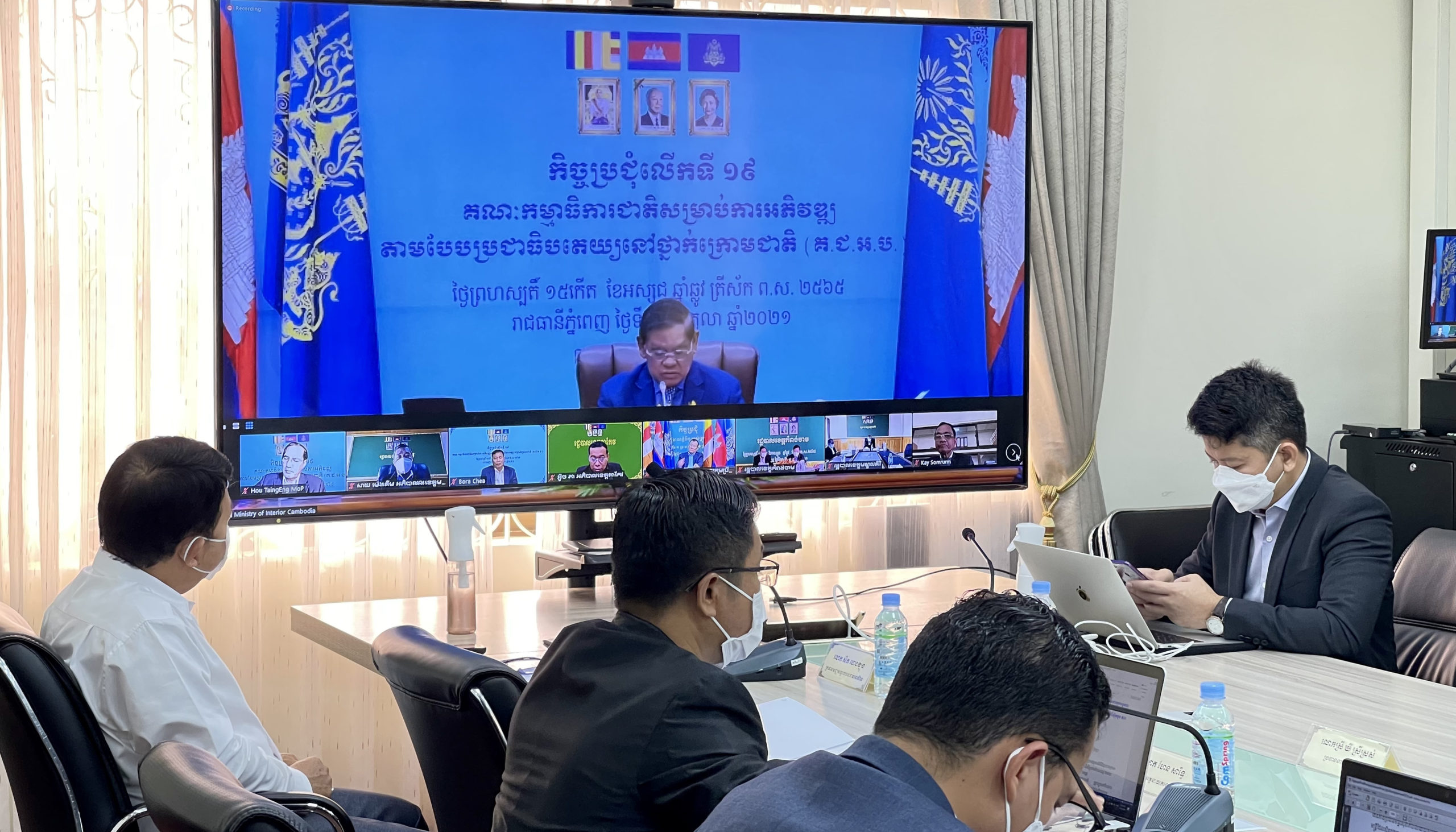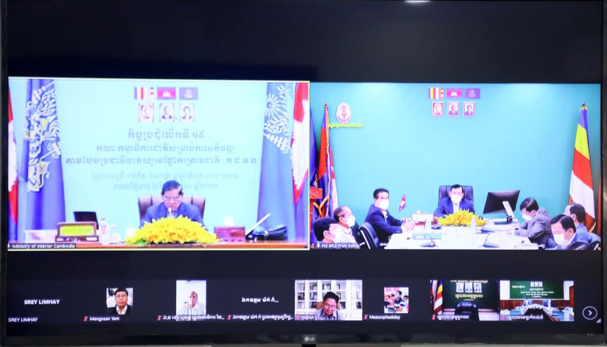 (រាជធានីភ្នំពេញ)៖ នៅព្រឹកថ្ងៃទី២១ ខែតុលា ឆ្នាំ២០២១ សម្តេចក្រឡាហោម ស ខេង ឧបនាយករដ្ឋមន្ត្រី រដ្ឋមន្ត្រីក្រសួងមហាផ្ទៃ និងជាប្រធានគណៈកម្មាធិការជាតិសម្រាប់ការអភិវឌ្ឍតាមបែបប្រជាធិបតេយ្យនៅថ្នាក់ក្រោមជាតិ (គ.ជ.អ.ប.) បានអញ្ជើញដឹកនាំកិច្ចប្រជុំលើកទី១៩ តាមរយៈប្រព័ន្ធអនឡាញ (Zoom)។