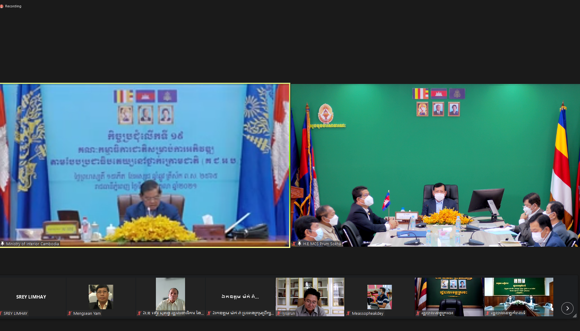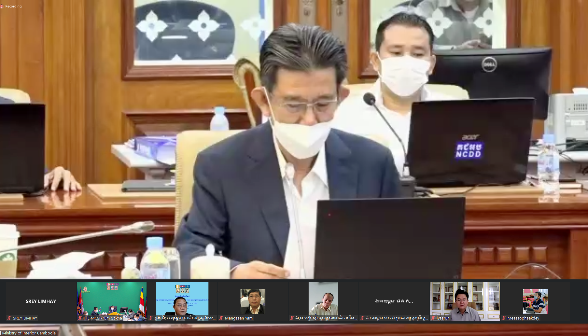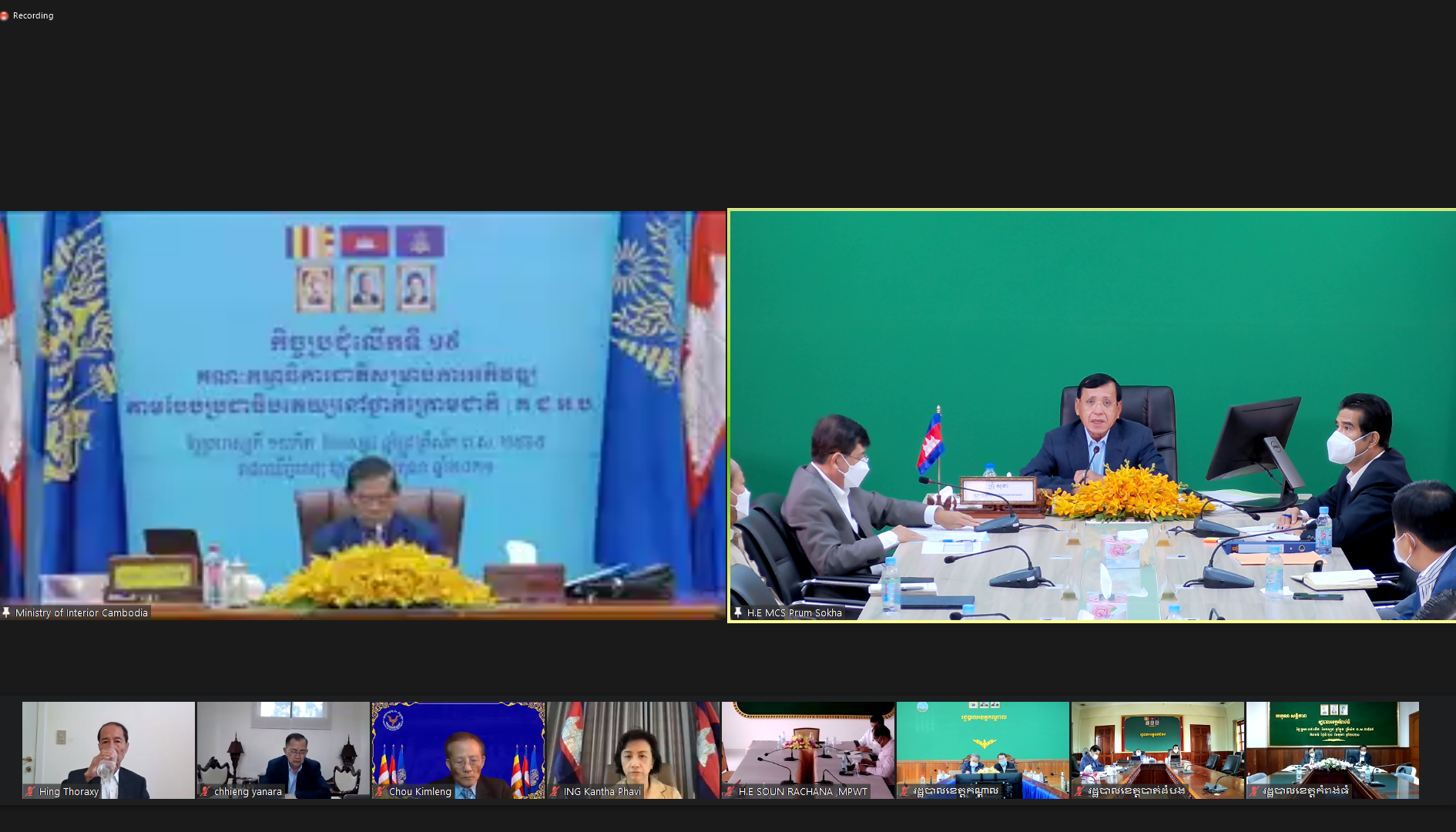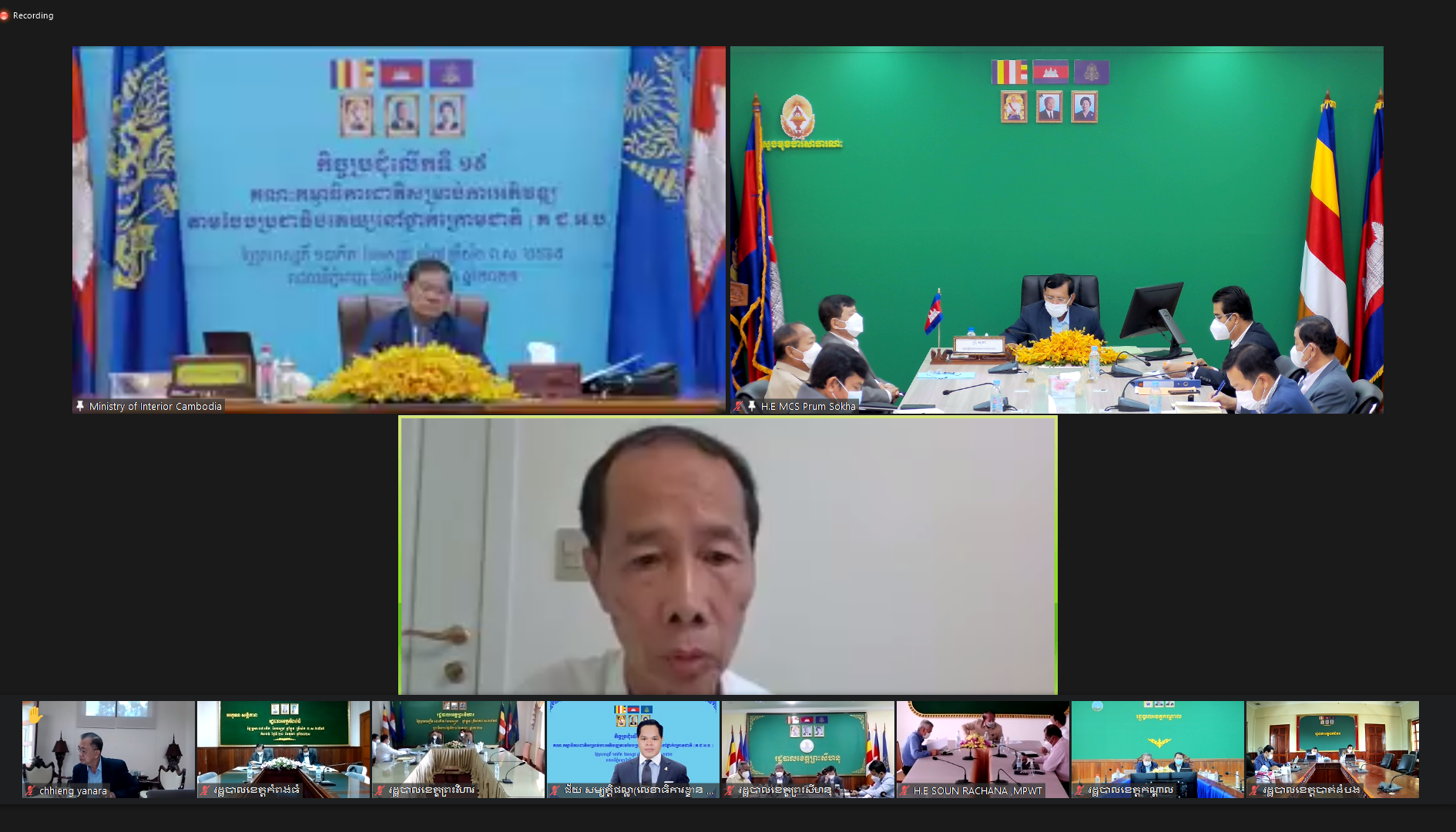 (រាជធានីភ្នំពេញ)៖ នៅព្រឹកថ្ងៃទី២១ ខែតុលា ឆ្នាំ២០២១ សម្តេចក្រឡាហោម ស ខេង ឧបនាយករដ្ឋមន្ត្រី រដ្ឋមន្ត្រីក្រសួងមហាផ្ទៃ និងជាប្រធានគណៈកម្មាធិការជាតិសម្រាប់ការអភិវឌ្ឍតាមបែបប្រជាធិបតេយ្យនៅថ្នាក់ក្រោមជាតិ (គ.ជ.អ.ប.) បានអញ្ជើញដឹកនាំកិច្ចប្រជុំលើកទី១៩ តាមរយៈប្រព័ន្ធអនឡាញ (Zoom)។