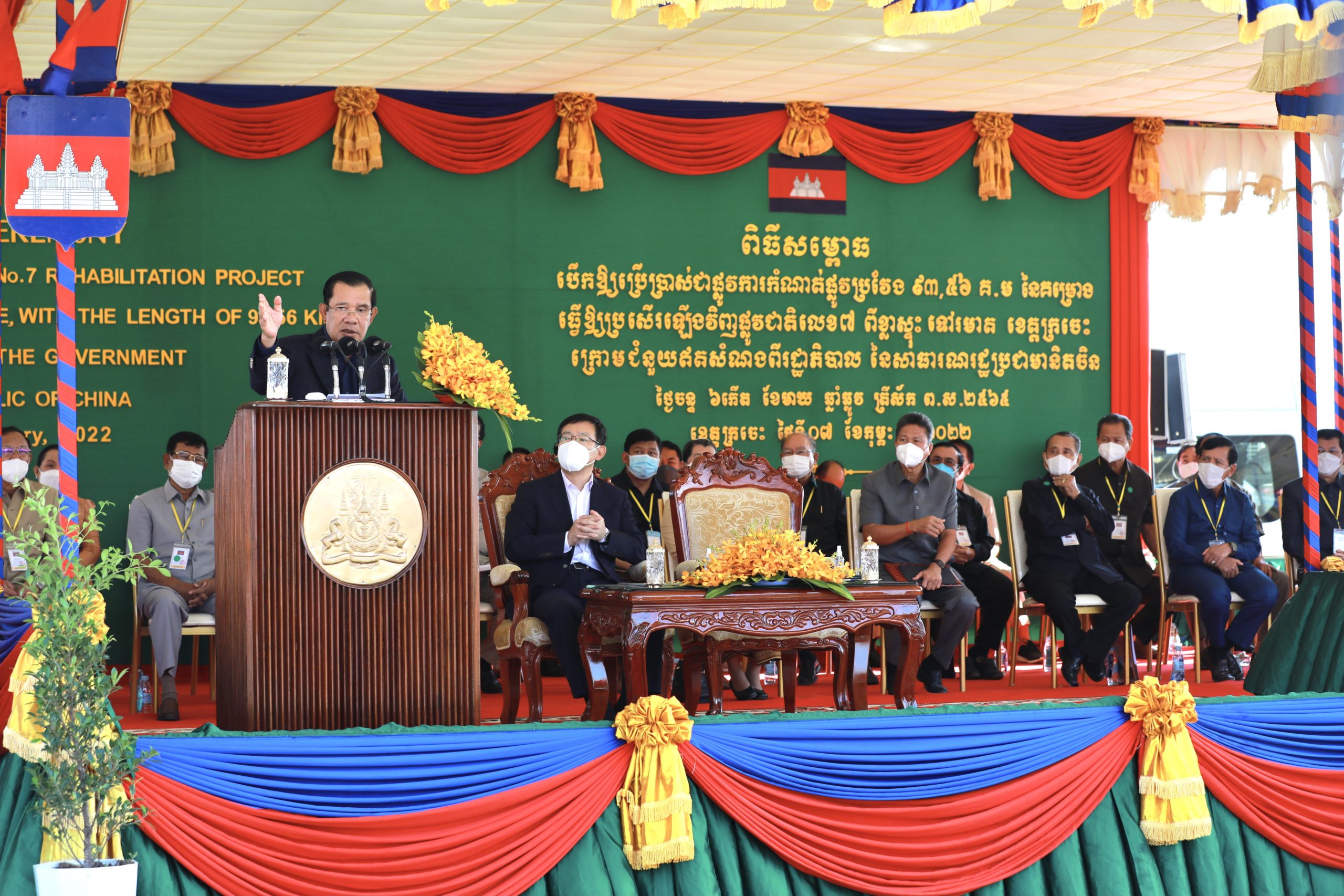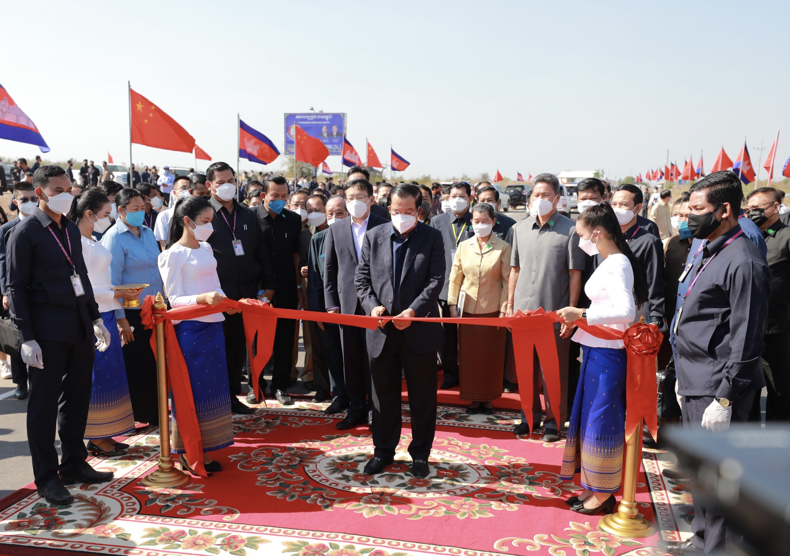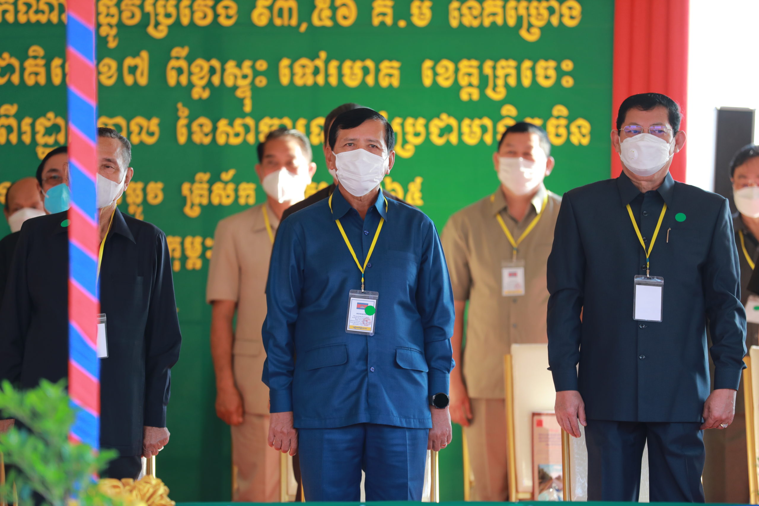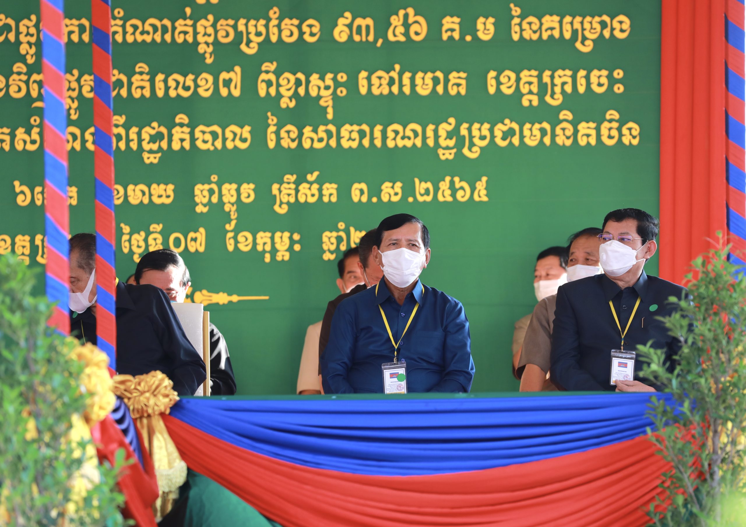 (ក្រចេះ)៖ នាព្រឹកថ្ងៃចន្ទ ៦កើត ខែមាឃ ឆ្នាំឆ្លូវ ត្រីស័ក ព.ស ២៥៦៥ ត្រូវនឹងថ្ងៃទី៧ ខែកុម្ភៈ ឆ្នាំ២០២២នេះ សម្តេចអគ្គមហាសេនាបតីតេជោ ហ៊ុន សែន នាយករដ្ឋមន្ត្រីនៃព្រះរាជាណាចក្រកម្ពុជា បានអញ្ជើញជាអធិបតីសម្ពោធដាក់ឱ្យប្រើប្រាស់ជាផ្លូវការកំណាត់ផ្លូវជាតិលេខ៧ ពីចំណុចរង្វង់មូលខ្លាស្ទុះ ក្រុងក្រចេះ ទៅភូមិរមាត ឃុំអូរគ្រៀង ស្រុកសំបូរ ខេត្តក្រចេះ ប្រវែងប្រមាណ ៩៣.៥៦គីឡូម៉ែត្រ ដែលសាងសង់ក្រោមជំនួយឥតសំណងរបស់រដ្ឋាភិបាលចិន។ ឯកឧត្តម ព្រុំ សុខា រដ្ឋមន្រ្តីក្រសួងមុខងារសាធារណៈ និងជាប្រធានក្រុមការងារខេត្តក្រចេះ ក៏បានអញ្ជើញចូលរួមក្នុងពិធីនេះផងដែរ៕