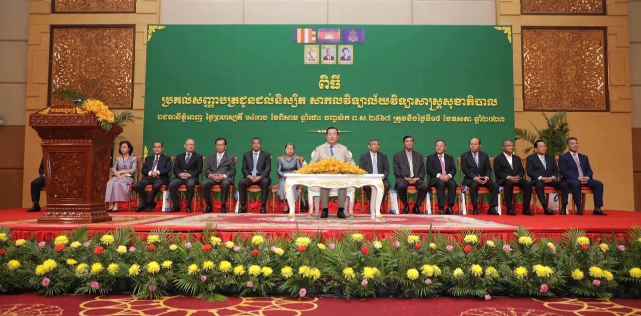 (ភ្នំពេញ)៖ នៅព្រឹកថ្ងៃព្រហស្បតិ៍ ១៤រោច ខែពិសាខ ឆ្នាំថោះ បញ្ចស័ក ព.ស.២៥៦៧ ត្រូវនឹងថ្ងៃទី១៨ ខែឧសភា ឆ្នាំ២០២៣ សម្តេចតេជោ ហ៊ុន សែន នាយករដ្ឋមន្ត្រីកម្ពុជា អញ្ជើញជាអធិបតីក្នុងពិធីប្រគល់សញ្ញាបត្រដល់និស្សិតពេទ្យដែលបានបញ្ចប់ការសិក្សាពីសាកលវិទ្យាល័យវិទ្យាសាស្ត្រសុខាភិបាលចំនួន ១,៣៩៦នាក់ នៅសណ្ឋាគារសុខាភ្នំពេញ។ ក្នុងពិធីនេះក៏មានឯកឧត្តម ហង្ស ឆាំឆាន រដ្ឋលេខាធិការតំណាងឯកឧត្តមរដ្ឋមន្ត្រីក្រសួងមុខងារសាធារណៈ ចូលរួមផងដែរ៕