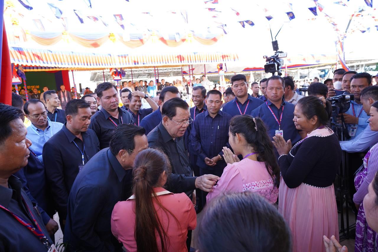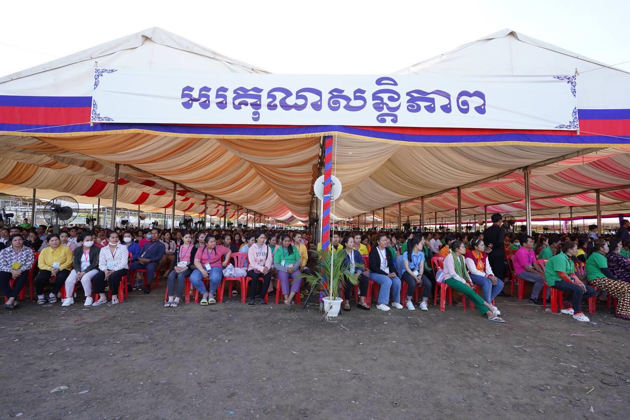 (កំពង់ចាម)៖ នៅថ្ងៃសុក្រ ១៣រោច ខែជេស្ឋ ឆ្នាំថោះ បញ្ចស័ក ព.ស.២៥៦៧ ត្រូវនឹងថ្ងៃទី១៦ ខែមិថុនា ឆ្នាំ២០២៣នេះ សម្តេចតេជោ ហ៊ុន សែន នាយករដ្ឋមន្ត្រីនៃព្រះរាជាណាចក្រកម្ពុជា បានអញ្ជើញចុះជួបសំណេះសំណាលជាមួយកម្មករ កម្មការិនីសរុបជិត២ម៉ឺននាក់ មកពីរោងចក្រ សហគ្រាសចំនួន៦ ដែលកំពុងដំណើរការក្នុងស្រុកជើងព្រៃ និងស្រុកបាធាយ ខេត្តកំពង់ចាម។ ជំនួបសំណេះសំណាលធ្វើឡើង នៅទីតាំងរោងចក្រឡឺក្រោន ស៊ូ អ៊ិនដាសស្ទ្រី (LECROWN SHOES INDUSTRY) ស្ថិតក្នុងភូមិរវៀង ឃុំខ្នុរដំបង ស្រុកជើងព្រៃ ខេត្តកំពង់ចាម។ ក្នុងពិធីនេះក៏មានវត្តមាន ឯកឧត្តម គង់ សុភី រដ្ឋលេខាធិការ តំណាងឯកឧត្តមរដ្ឋមន្រ្តីក្រសួងមុខងារសាធារណៈ ចូលរួមផងដែរ៕