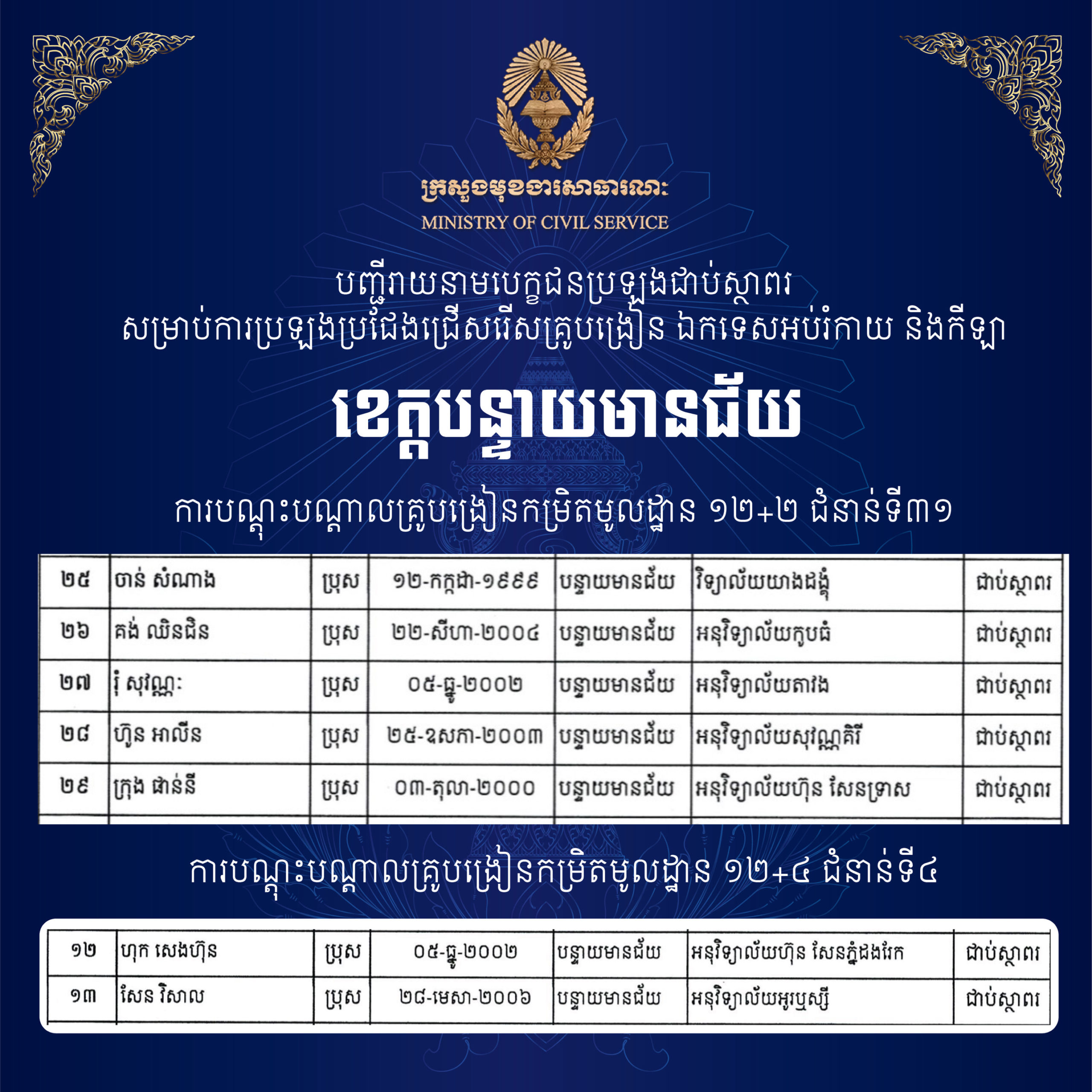 សូមចូលរួមអបអរសាទរ ដល់បេក្ខជនប្រឡងជាប់ជាស្ថាពរ សម្រាប់ការប្រឡងប្រជែងជ្រើសរើសគ្រូបង្រៀនឯកទេសអប់រំកាយ និងកីឡា ឱ្យចូលបម្រើការងារក្នុងក្របខណ្ឌក្រសួងអប់រំ យុវជន និងកីឡា។