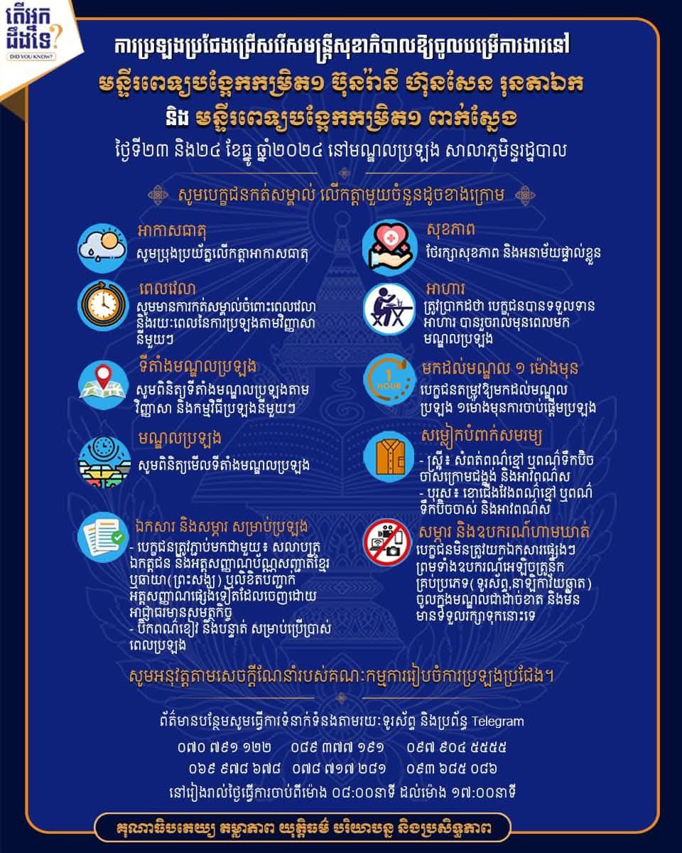 សូមបេក្ខជនទាំងអស់ ដែលត្រូវចូលរួមប្រឡងប្រជែងជ្រើសរើសមន្ត្រីរាជការឱ្យចូលបម្រើការងារនៅមន្ទីរពេទ្យបង្អែកកម្រិត១ ប៊ុនរ៉ានី ហ៊ុនសែន រុនតាឯក ថ្ងៃទី២៣ ខែធ្នូ ឆ្នាំ២០២៤ និងនៅមន្ទីរពេទ្យបង្អែកកម្រិត១ ពាក់ស្នែង ថ្ងៃទី២៤ ខែធ្នូ ឆ្នាំ២០២៤ គួរកត់សម្គាល់លើកត្តាមួយចំនួន និងត្រូវអនុវត្តតាមបទប្បញ្ញត្តិ ដែលណែនាំដោយគណៈកម្មការរៀបចំការប្រឡងប្រជែង
