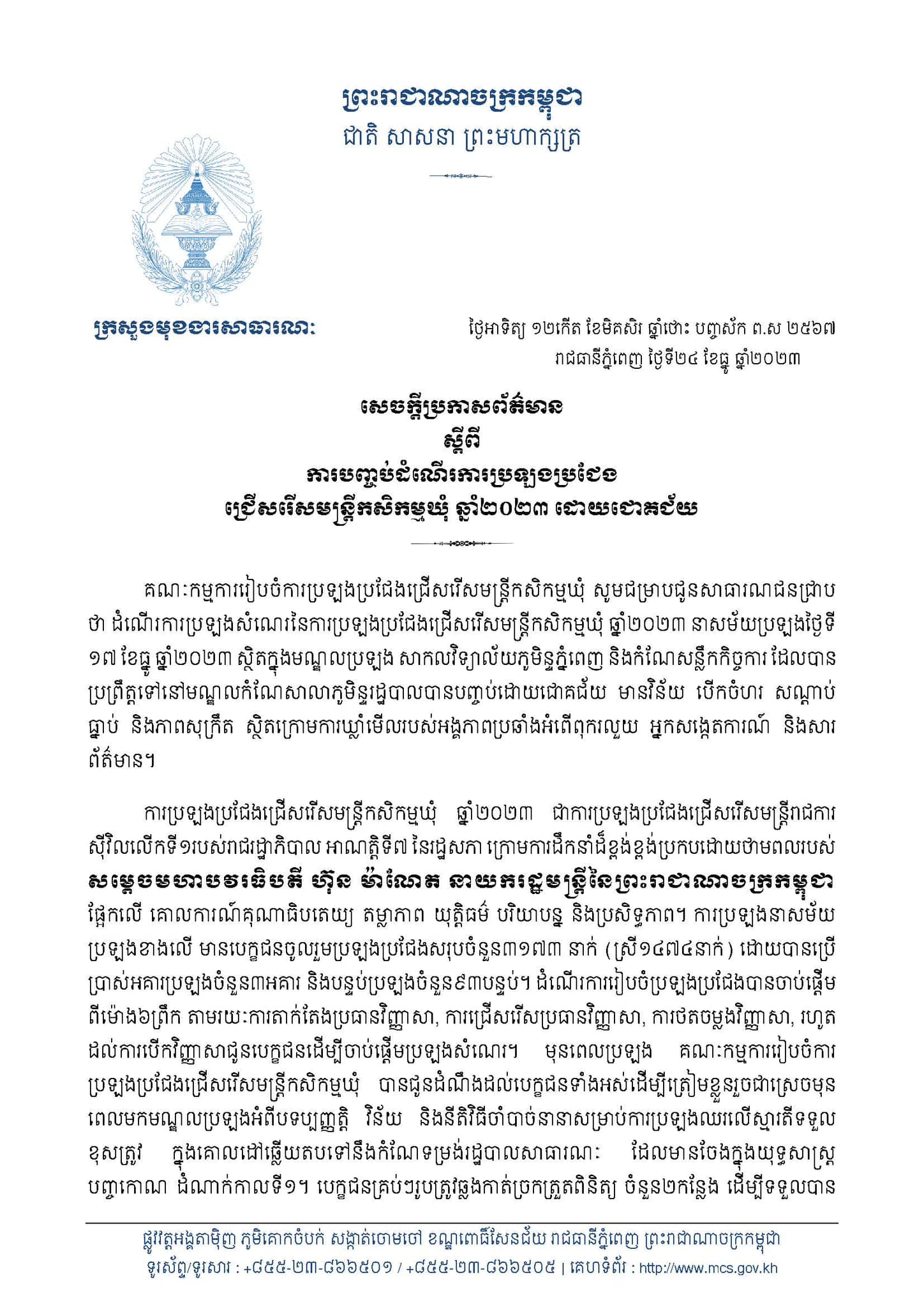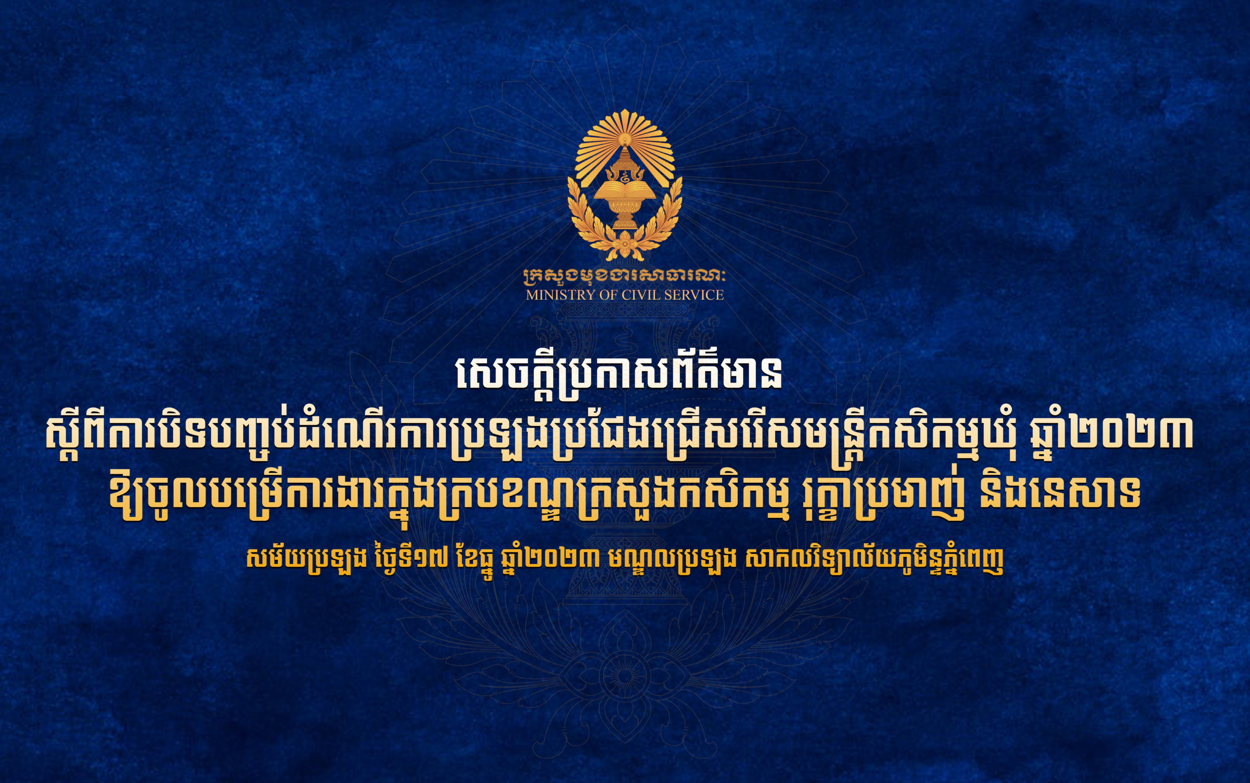 សេចក្ដីប្រកាសព័ត៌មាន ស្តីពីការបិទបញ្ចប់ដំណើរការប្រឡងប្រជែងជ្រើសរើសមន្ត្រីកសិកម្មឃុំ ឆ្នាំ២០២៣ ឱ្យចូលបម្រើការងារក្នុងក្របខណ្ឌក្រសួងកសិកម្ម រុក្ខាប្រមាញ់ និងនេសាទ សម័យប្រឡង ថ្ងៃទី ១៧ ខែធ្នូ ឆ្នាំ២០២៣។