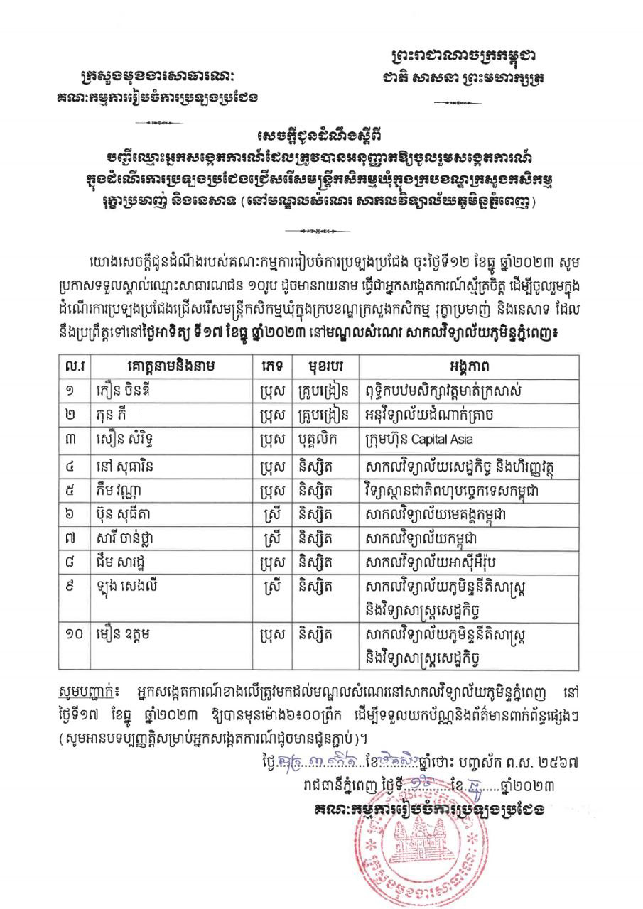 សេចក្តីជូនដំណឹងរបស់គណៈកម្មការរៀបចំការប្រឡងប្រជែង ស្តីពីបញ្ជីឈ្មោះអ្នកសង្កេតការណ៍ដែលត្រូវបានអនុញ្ញាតឱ្យចូលរួមសង្កេតការណ៍ ក្នុងដំណើរការប្រឡងប្រជែងជ្រើសរើសមន្ត្រីកសិកម្មឃុំក្នុងក្របខណ្ឌក្រសួងកសិកម្ម រុក្ខប្រមាញ់ និងនេសាទ៖