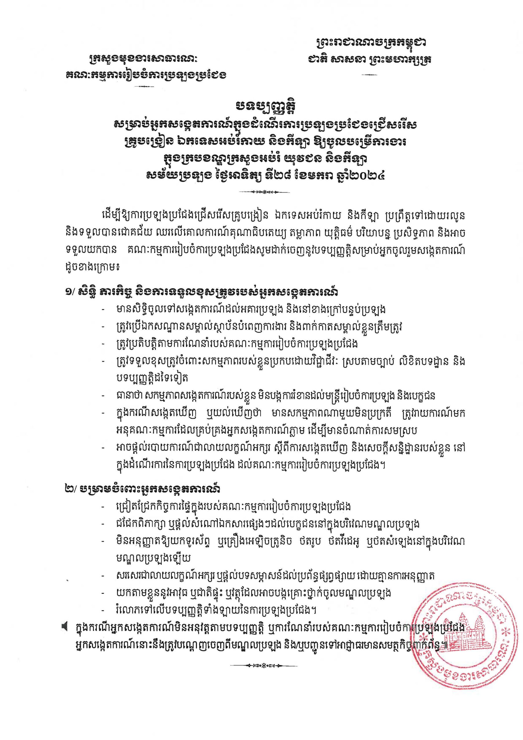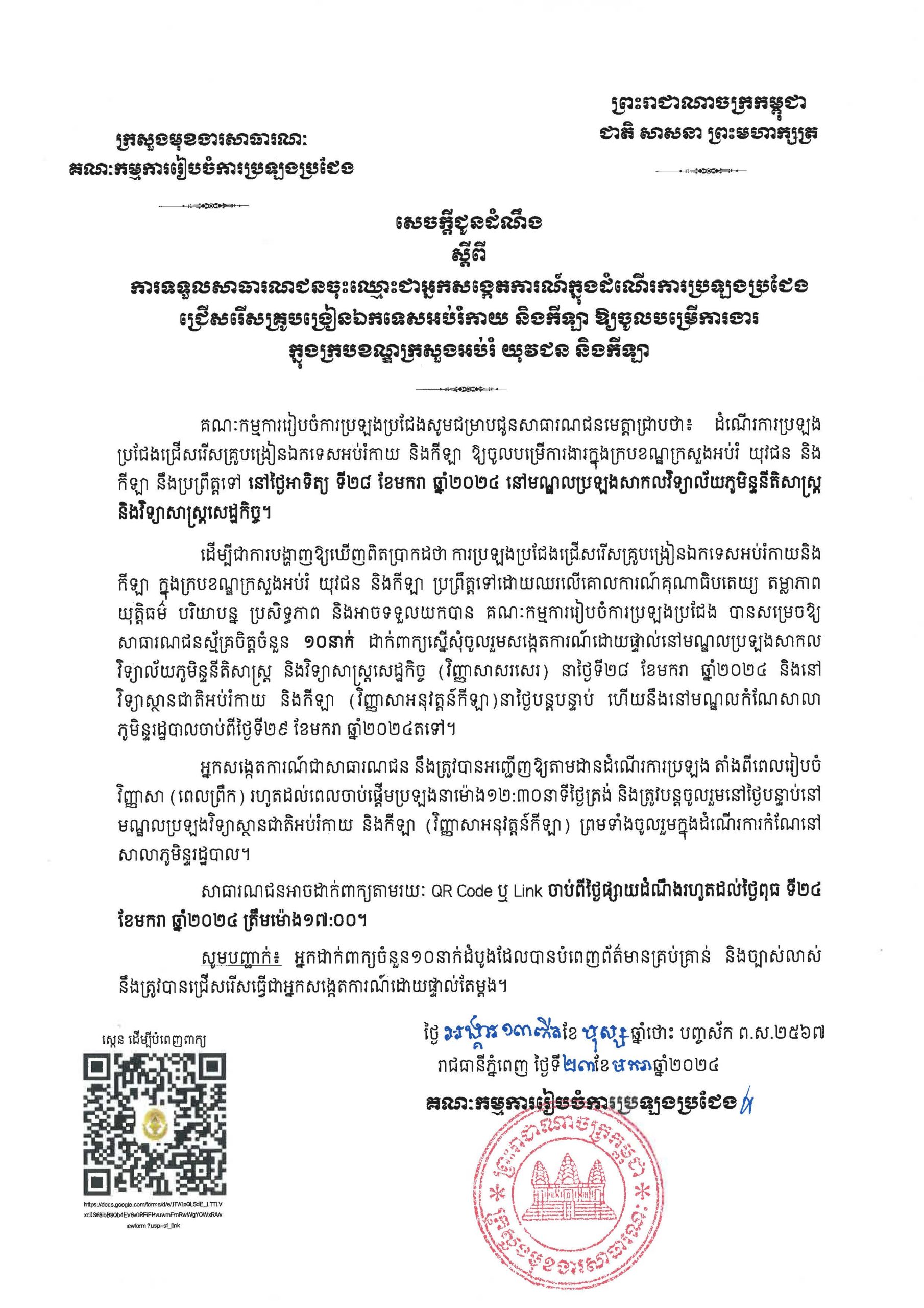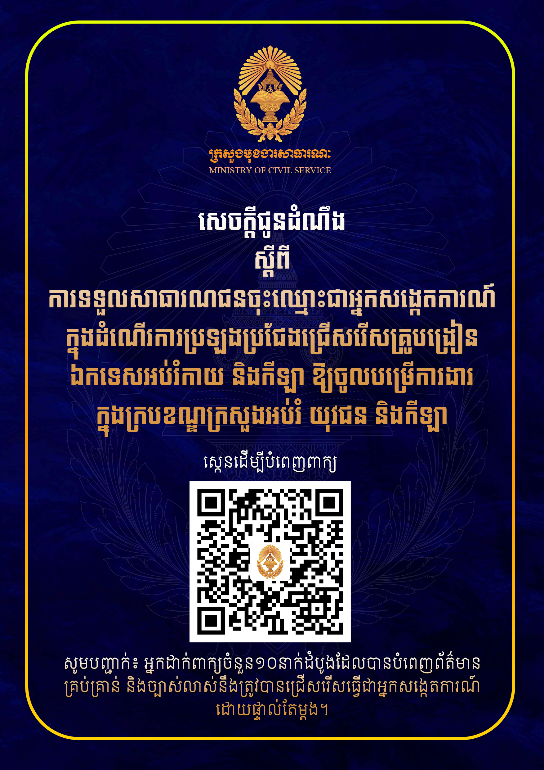 សេចក្តីជូនដំណឹងរបស់គណៈកម្មការរៀបចំការប្រឡងប្រជែង ស្តីពី ការទទួលសាធារណជនចុះឈ្មោះជាអ្នកសង្កេតការណ៍ក្នុងដំណើរការប្រឡងប្រជែងជ្រើសរើសគ្រូបង្រៀនឯកទេសអប់រំកាយ និងកីឡា ឱ្យចូលបម្រើការងារក្នុងក្របខណ្ឌក្រសួងអប់រំ យុវជន និងកីឡា