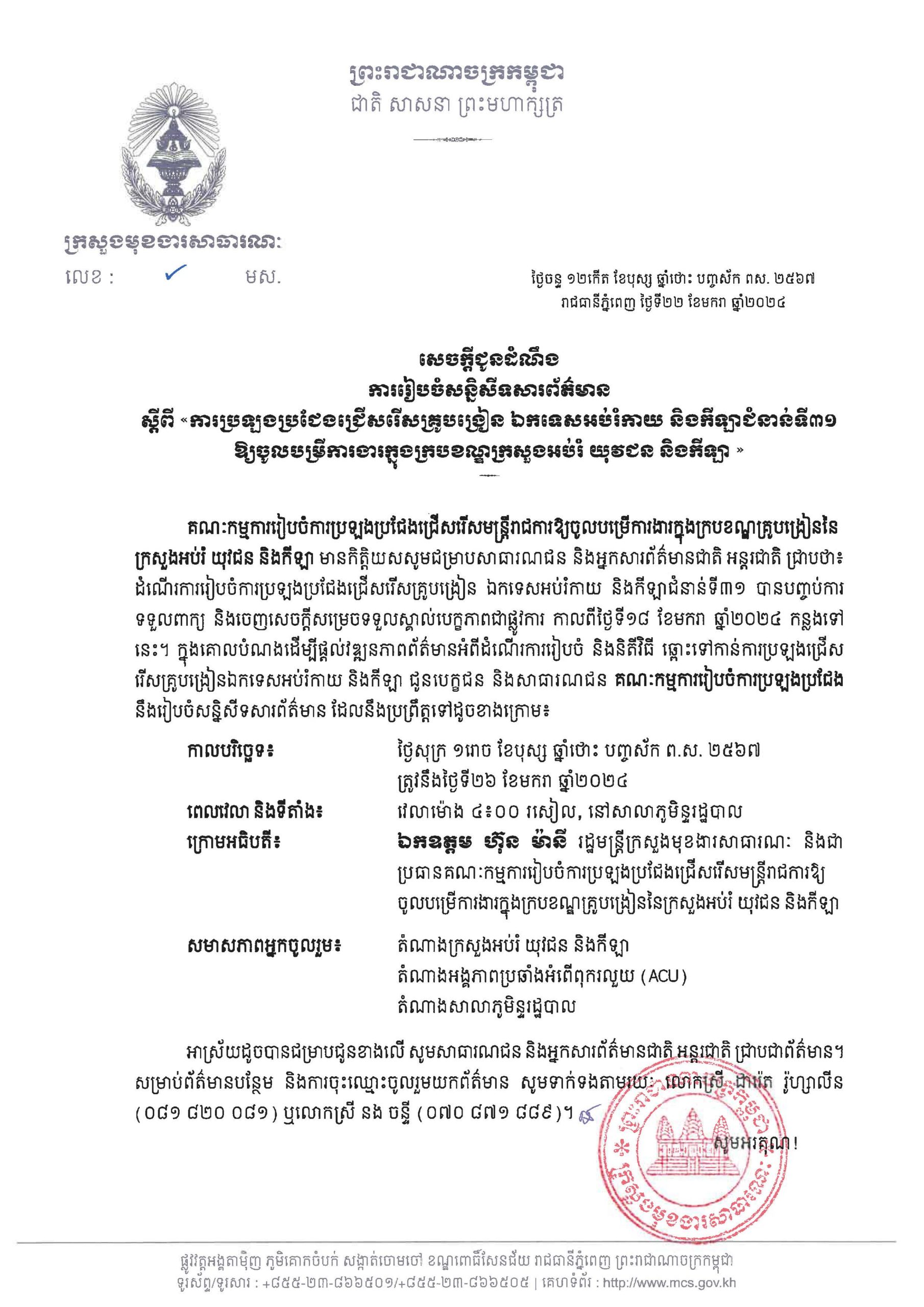 សេចក្តីជូនដំណឹង ការរៀបចំសន្និសីទសារព័ត៌មាន ស្តីពី «ការប្រឡងប្រជែងជ្រើសរើសគ្រូបង្រៀន ឯកទេសអប់រំកាយ និងកីឡាជំនាន់ទី៣១ ឱ្យចូលបម្រើការងារក្នុងក្របខណ្ឌក្រសួងអប់រំ យុវជន និងកីឡា»