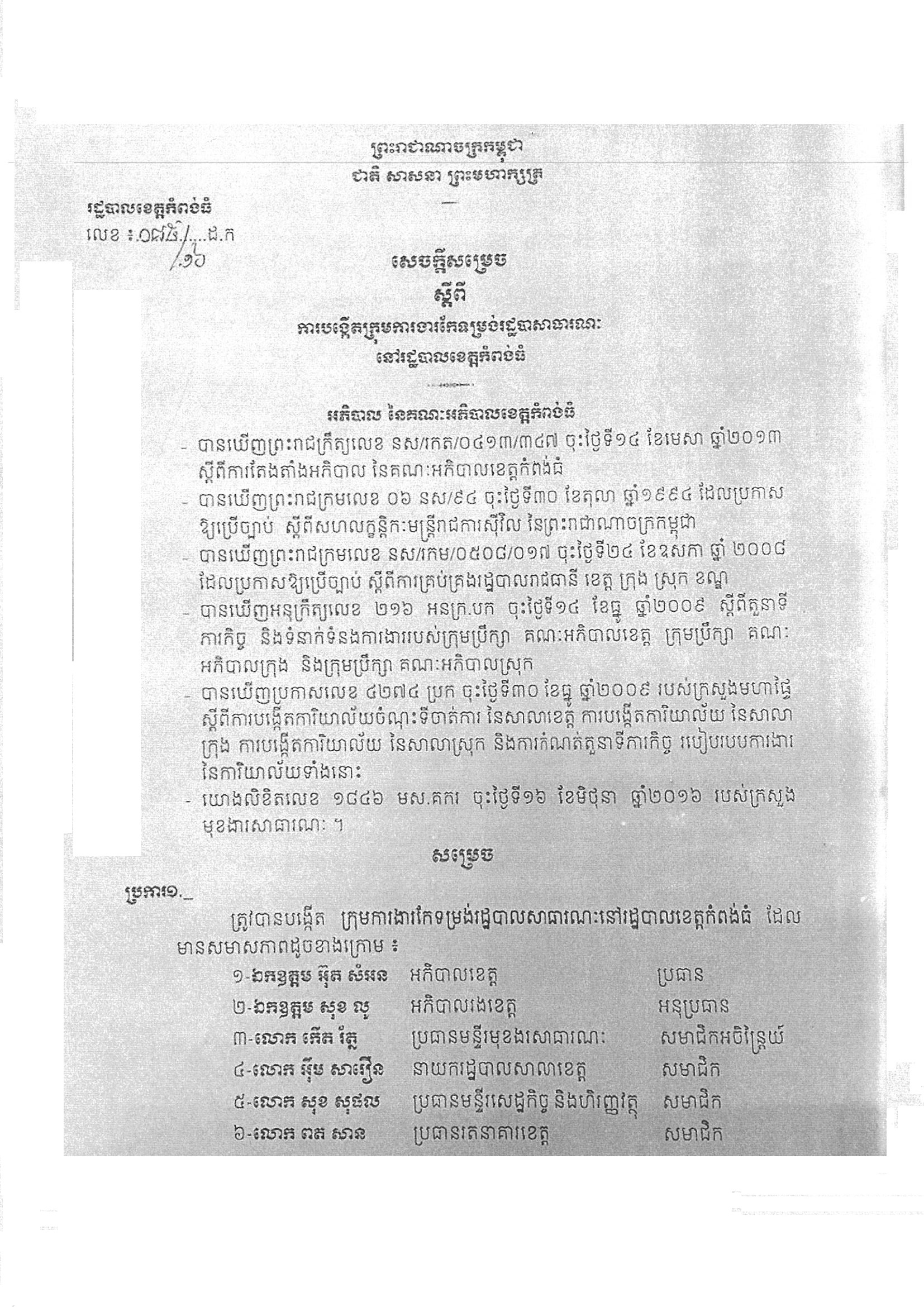 សេចក្តីសម្រេច ស្តីពីការបង្កើតក្រុមការងារកែទម្រង់រដ្ឋបាលសាធារណៈនៅរដ្ឋបាលខេត្តកំពង់ធំ