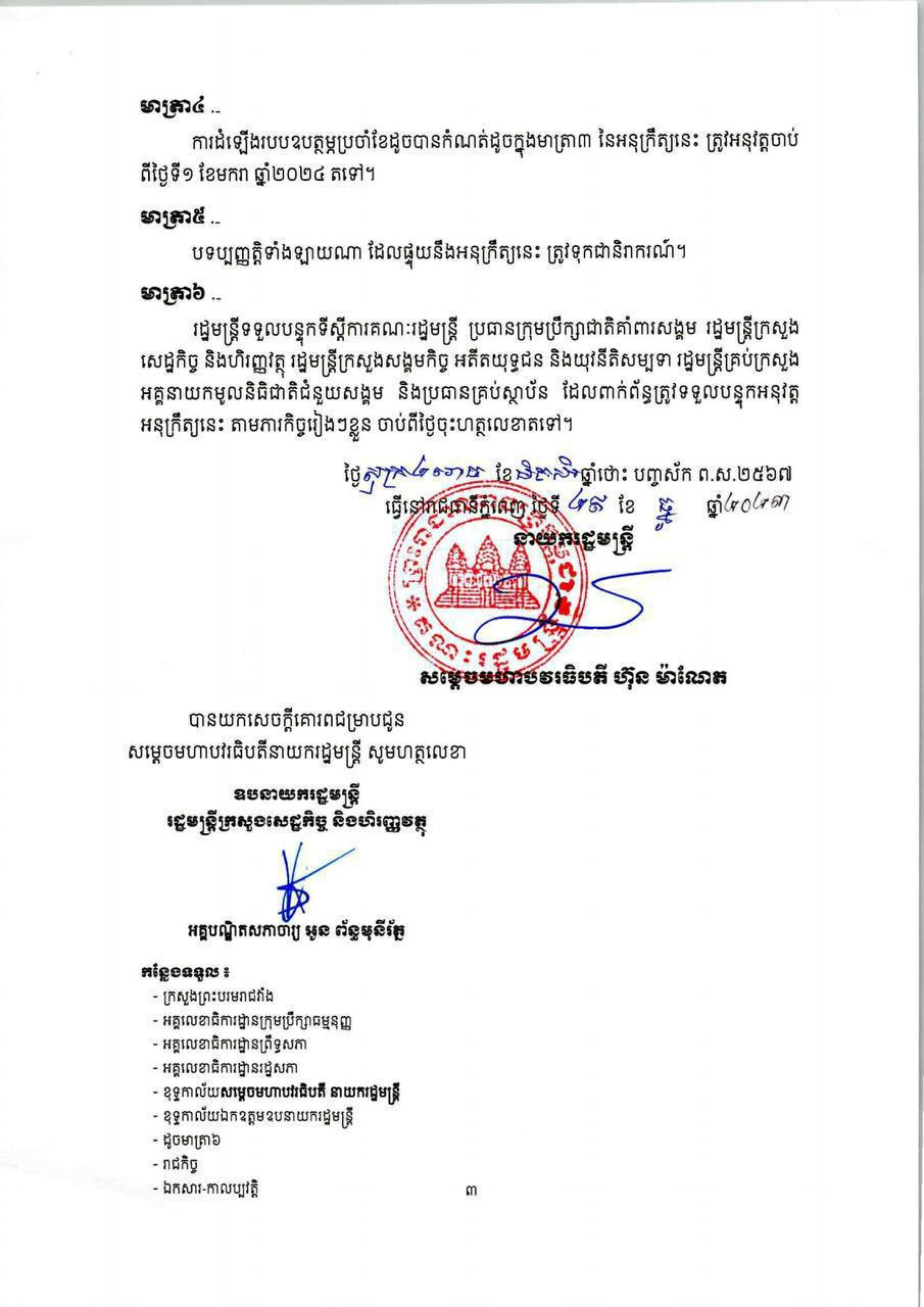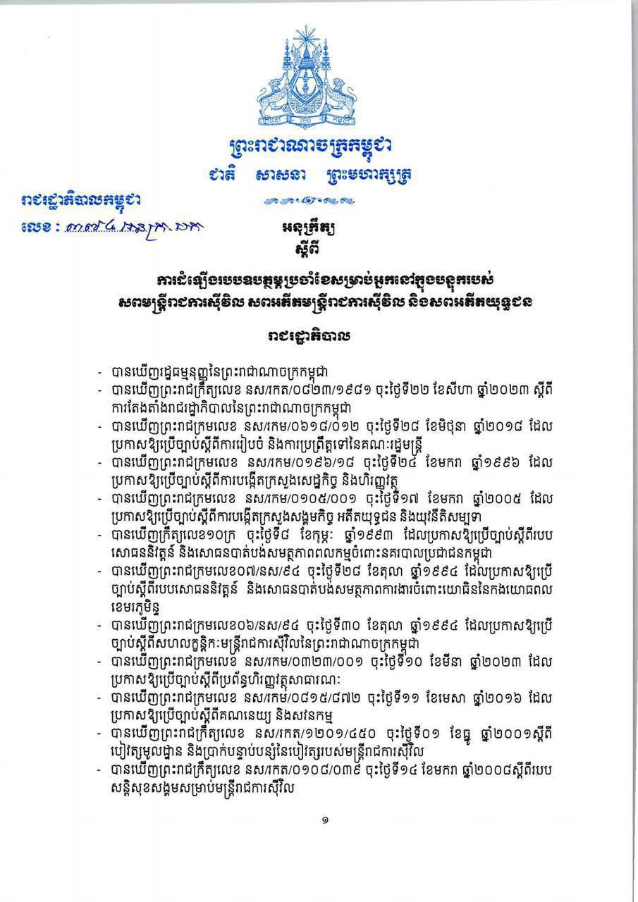 អនុក្រឹត្យលេខ៣៧៤ អនក្រ.បក ស្តីពីការដំឡើងរបបឧបត្ថម្ភប្រចាំខែសម្រាប់អ្នកនៅក្នុងបន្ទុករបស់សពមន្រ្តីរាជការស៊ីវិល សពអតីតមន្រ្តីរាជការស៊ីវិល និងសពអតីតយុទ្ធជន ត្រូវអនុវត្តចាប់ពីថ្ងៃទី១ ខែមករា ឆ្នាំ ២០២៤ តទៅ។