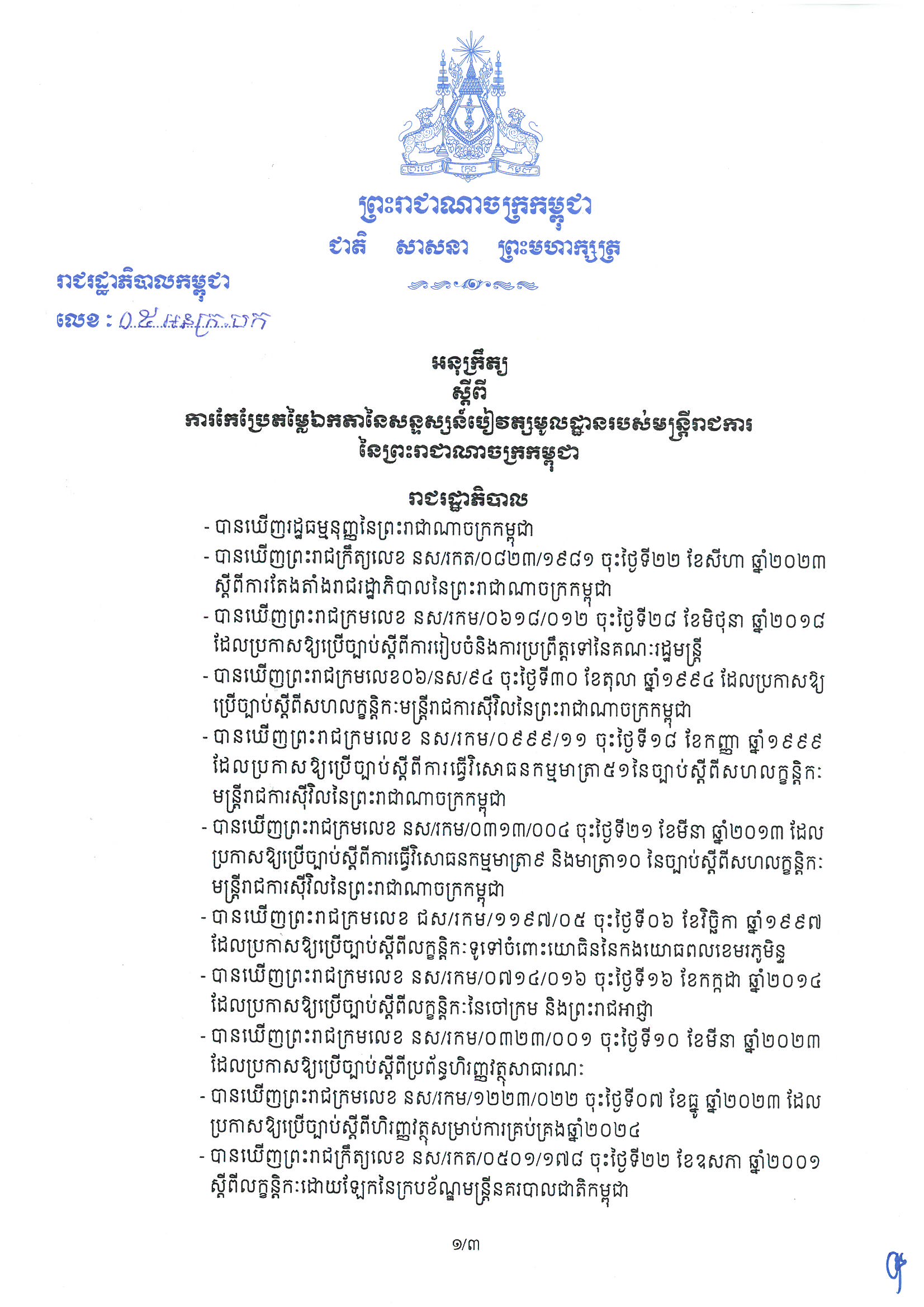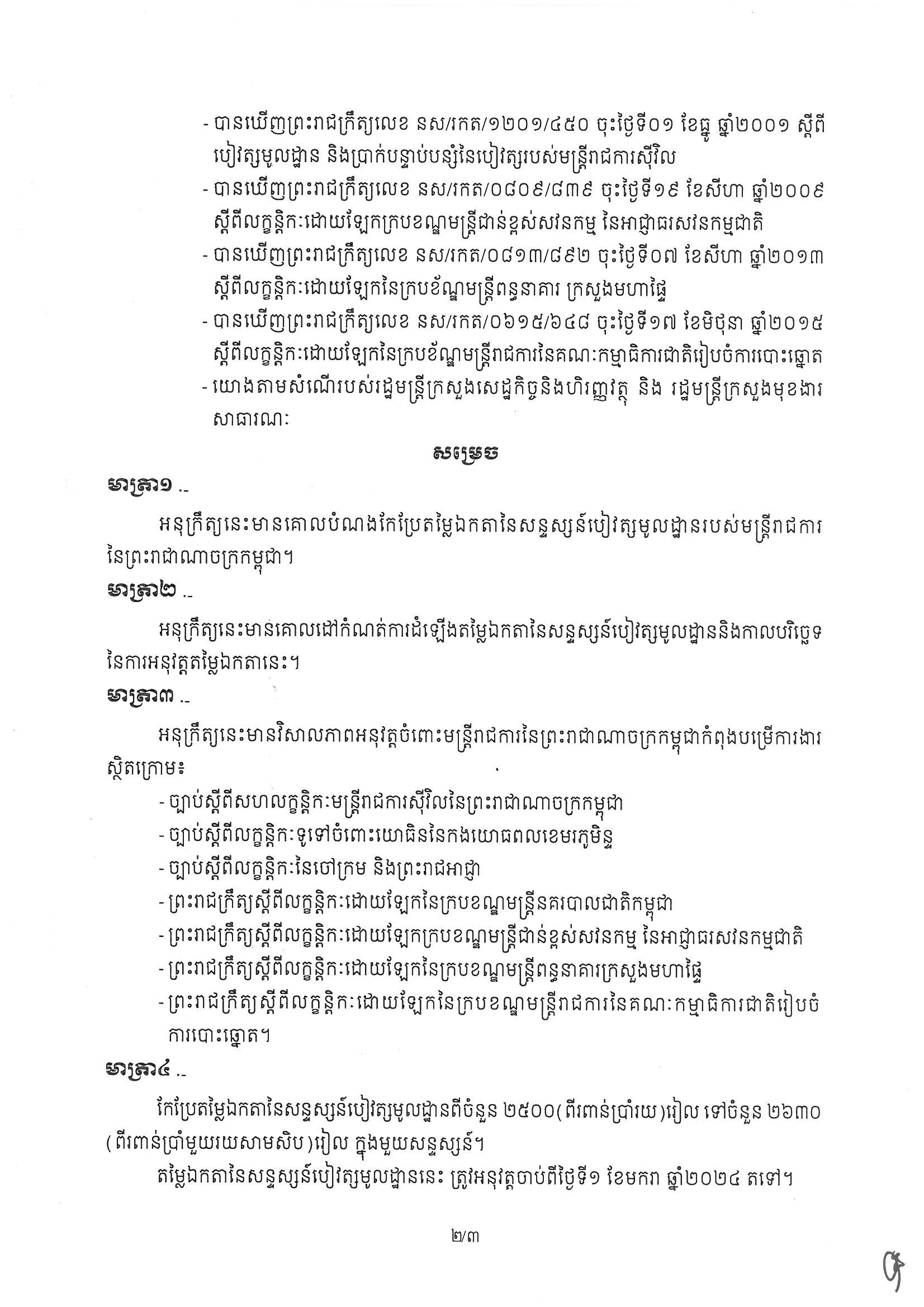 អនុក្រឹត្យលេខ ០៥អនក្រ.បក ស្តីពីការកែប្រែតម្លៃឯកតានៃសន្ទស្សន៍បៀវត្សមូលដ្ឋានរបស់មន្រ្តីរាជការនៃព្រះរាជាណាចក្រកម្ពុជា។