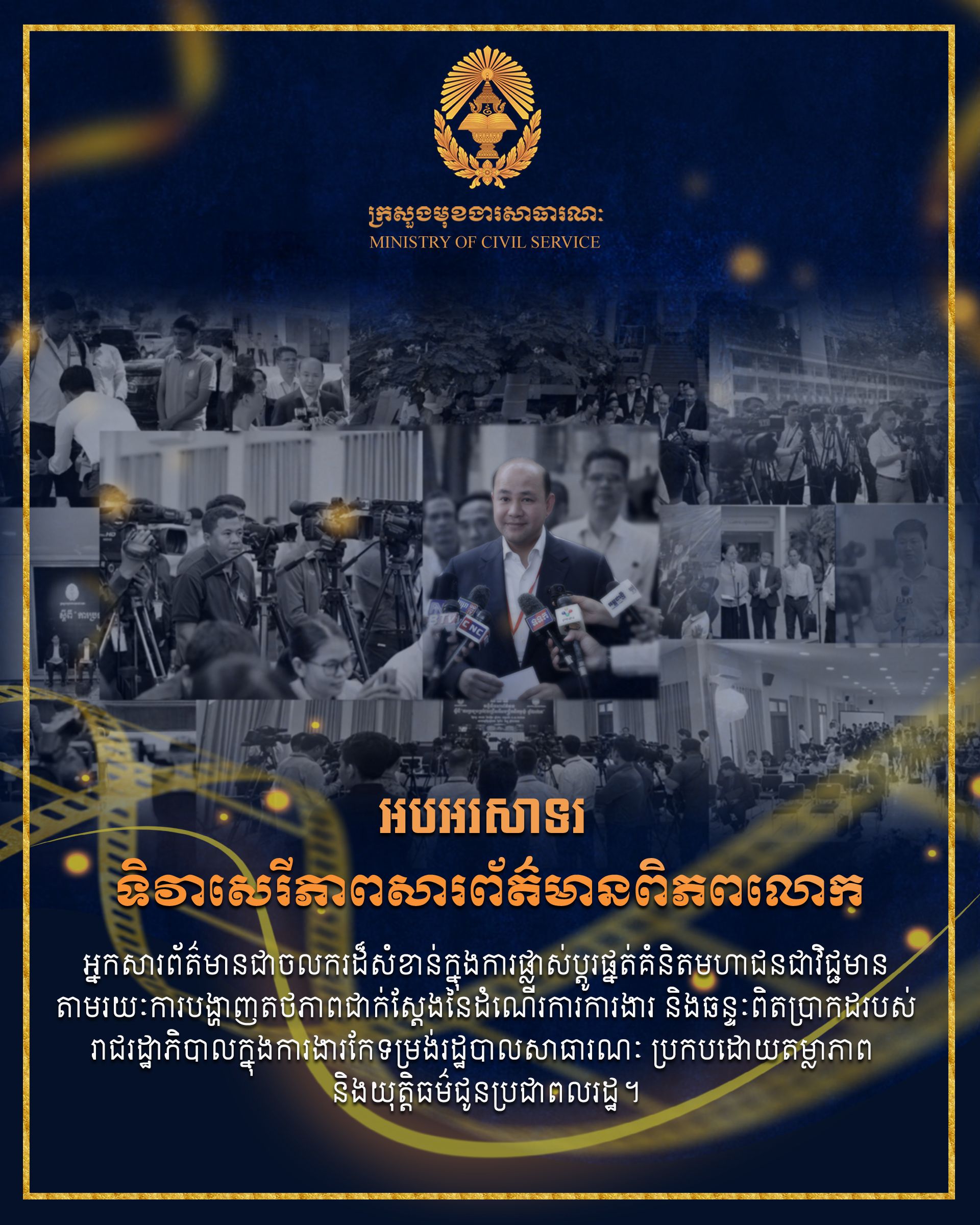 ក្រសួងមុខងារសាធារណៈ សូមកោតសរសើរចំពោះទឹកចិត្ត និងកិច្ចសហការដ៏ស្អិតរមួតនេះ ហើយជឿជាក់ថាអ្នកសារព័ត៌មានទាំងអស់នឹងយកឱកាសនេះ បន្តចូលរួមជាមួយគ្នា ដើម្បីលើកកម្ពស់កិត្យានុភាពរបស់ព្រះរាជាណាចក្រកម្ពុជា តាមរយៈការផ្តល់ព័ត៌មានដែលត្រឹមត្រូវ មានក្រមសីលធម៌ និងប្រកបដោយវិជ្ជាជីវៈខ្ពស់។