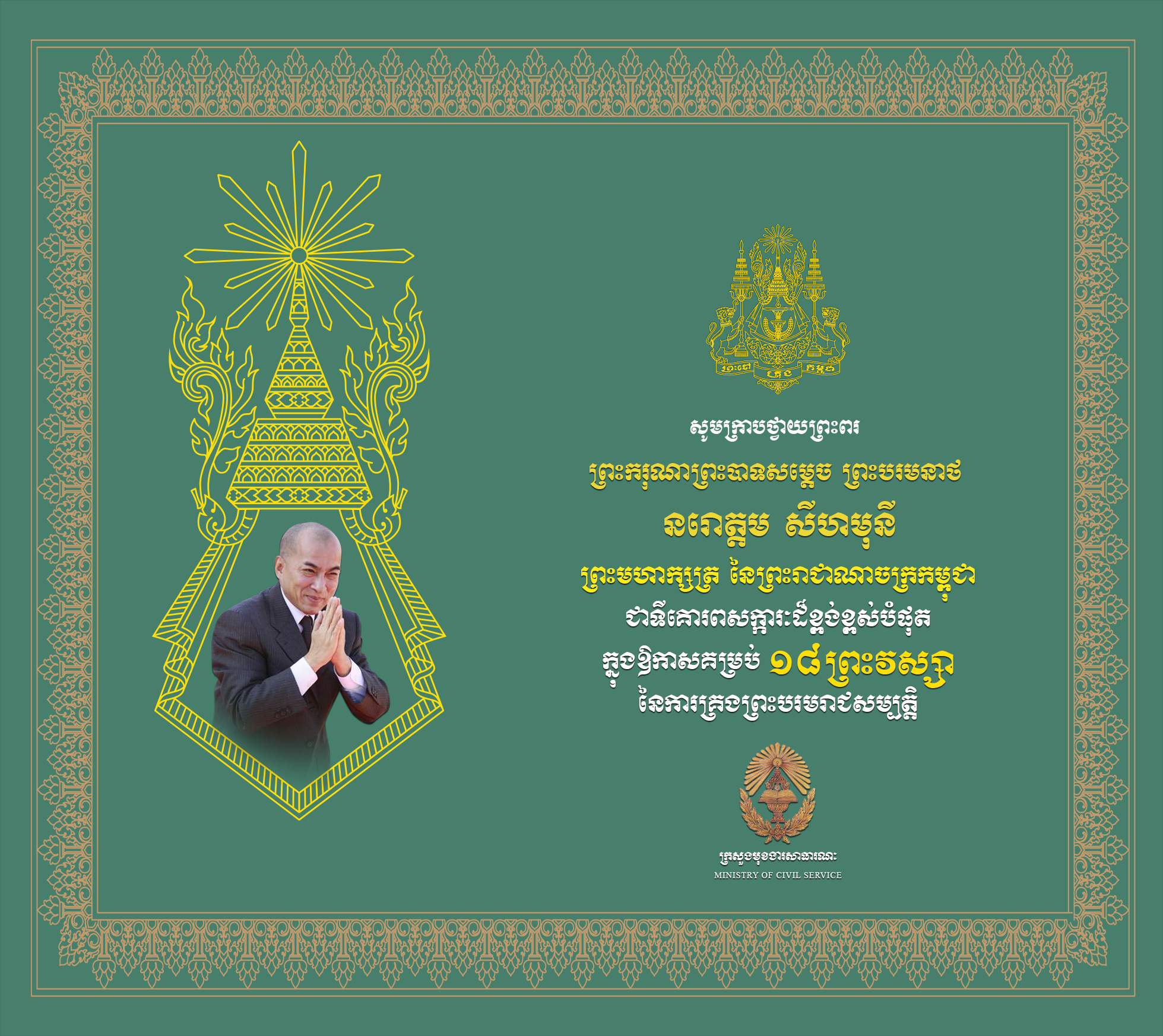 ឯកឧត្ដមរដ្ឋមន្ត្រី និងថ្នាក់ដឹកនាំ ព្រមទាំងមន្ត្រីរាជការនៃក្រសួងមុខងារសារធារណៈ សូមក្រាបបង្គំទូលថ្វាយសារលិខិតថ្វាយព្រះពរ ព្រះករុណាព្រះបាទសម្ដេចព្រះបរមនាថ នរោត្តម សីហមុនី ព្រះមហាក្សត្រ នៃព្រះរាជាណាចក្រកម្ពុជា ក្នុងឱកាសដ៏ឧត្តុង្គឧត្តម នៃព្រះរាជពិធីខួបលើកទី១៨ ការយាងគ្រងព្រះបរមសិរីរាជសម្បត្តិរបស់ ព្រះករុណាជាអម្ចាស់ជីវិតលើត្បូង ជាទីគោរពសក្ការៈដ៏ខ្ពង់ខ្ពស់បំផុត៕