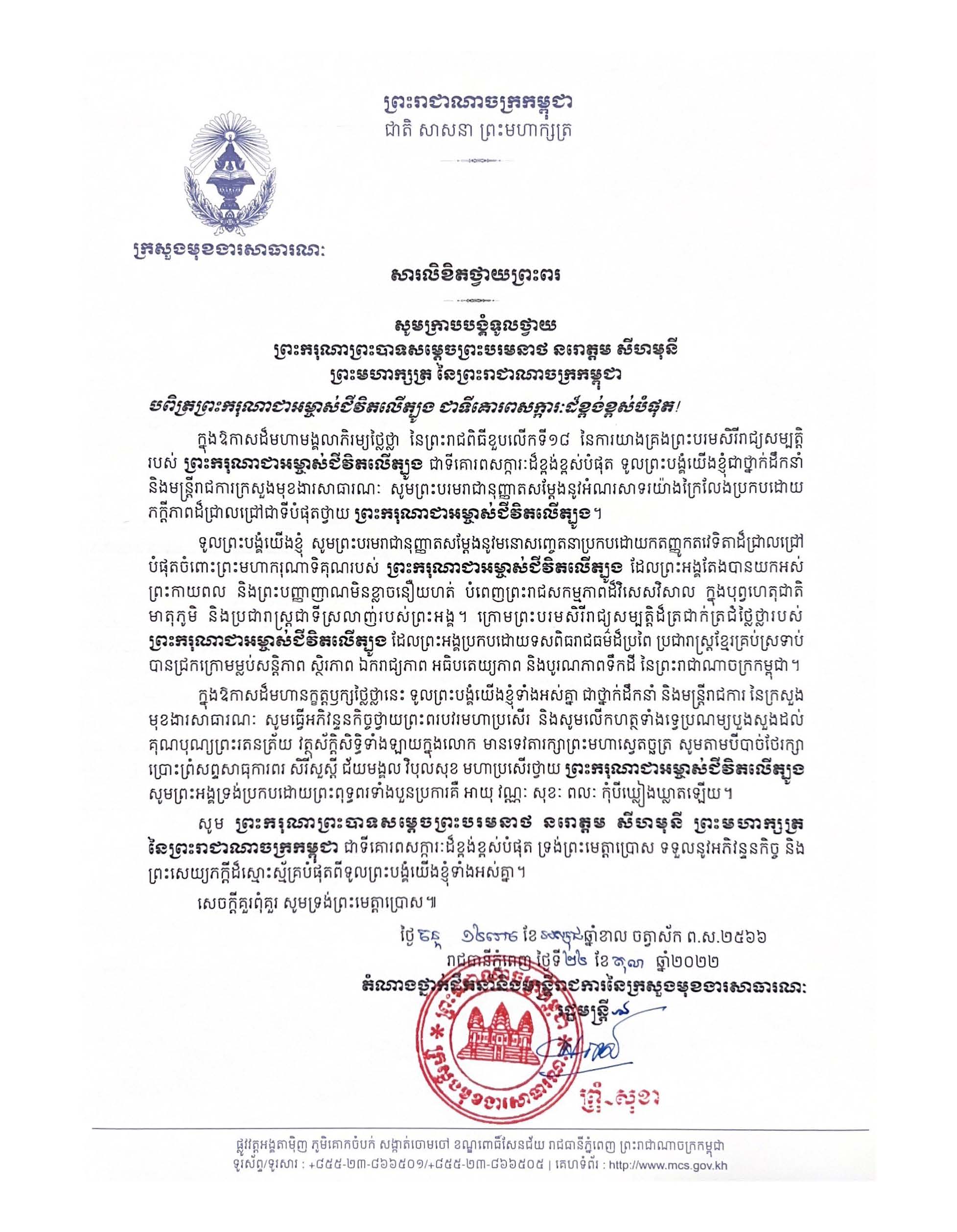 ឯកឧត្ដមរដ្ឋមន្ត្រី និងថ្នាក់ដឹកនាំ ព្រមទាំងមន្ត្រីរាជការនៃក្រសួងមុខងារសារធារណៈ សូមក្រាបបង្គំទូលថ្វាយសារលិខិតថ្វាយព្រះពរ ព្រះករុណាព្រះបាទសម្ដេចព្រះបរមនាថ នរោត្តម សីហមុនី ព្រះមហាក្សត្រ នៃព្រះរាជាណាចក្រកម្ពុជា