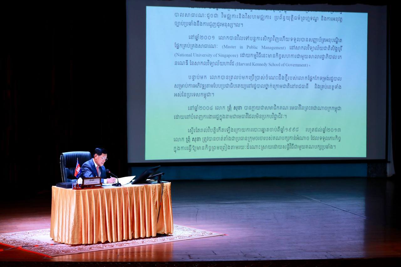 (ពោធិ៍សែនជ័យ-ភ្នំពេញ)៖ ឯកឧត្តម ព្រុំ សុខា រដ្ឋមន្ត្រីក្រសួងមុខងារសាធារណៈ និងជាប្រធានគណ:កម្មាធិការកែទម្រង់រដ្ឋបាលសាធារណៈ បានអញ្ជើញធ្វើបាឋកថា ស្ដីពី «ភាពជាអ្នកដឹកនាំ នវានុវត្តន៍ និងគុណាធិបតេយ្យ ក្នុងរដ្ឋបាលសាធារណៈ» ដល់និស្សិតសាកលវិទ្យាល័យភូមិន្ទវិចិត្រសិល្បៈ។
