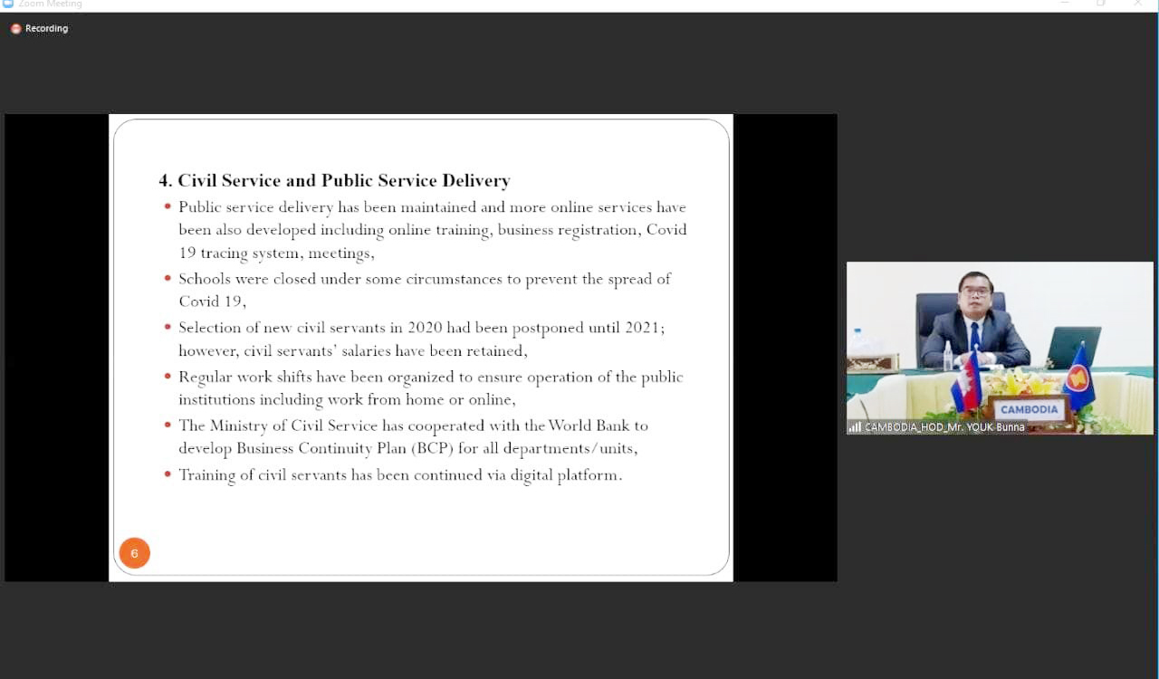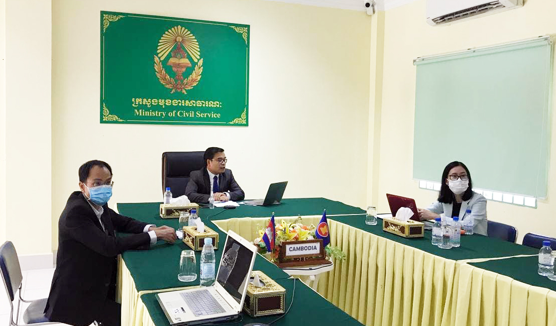 ឯកឧត្តមរដ្ឋលេខាធិការប្រចាំការនៃក្រសួងមុខងារសាធារណៈ ដឹកនាំប្រតិភូចូលរួមកិច្ចប្រជុំត្រៀម និងមន្ត្រីជាន់ខ្ពស់អាស៊ាន លើវិស័យមុខងារសាធារណៈ តាមប្រព័ន្ធវីដេអូ