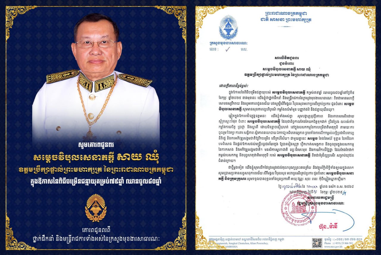 ក្នុងឱកាសនៃពិធីចម្រើនជន្មាយុរបស់ សម្តេចវិបុលសេនាភក្តី គម្រប់ ៧៩ឆ្នាំ ឈានចូល ៨០ឆ្នាំ នៅថ្ងៃទី៥ ខែកុម្ភៈ ឆ្នាំ២០២៥ នេះ យើងខ្ញុំជាថ្នាក់ដឹកនាំ និងមន្ត្រីរាជការនៃក្រសួងមុខងារសាធារណៈ ពិតជាមានសេចក្តី សោមនស្សរីករាយ និងសូមគោរពជូនពរជ័យ បវរសួស្តីសិរីមង្គល វិបុលសុខមហាប្រសើរគ្រប់ប្រការ ជូនចំពោះ សម្តេចវិបុលសេនាភក្តី សូមមានសុខភាពល្អបរិបូរណ៍ កម្លាំងពលំមាំមួន បញ្ញាវាងវៃ និងជន្មាយុយឺនយូរ។