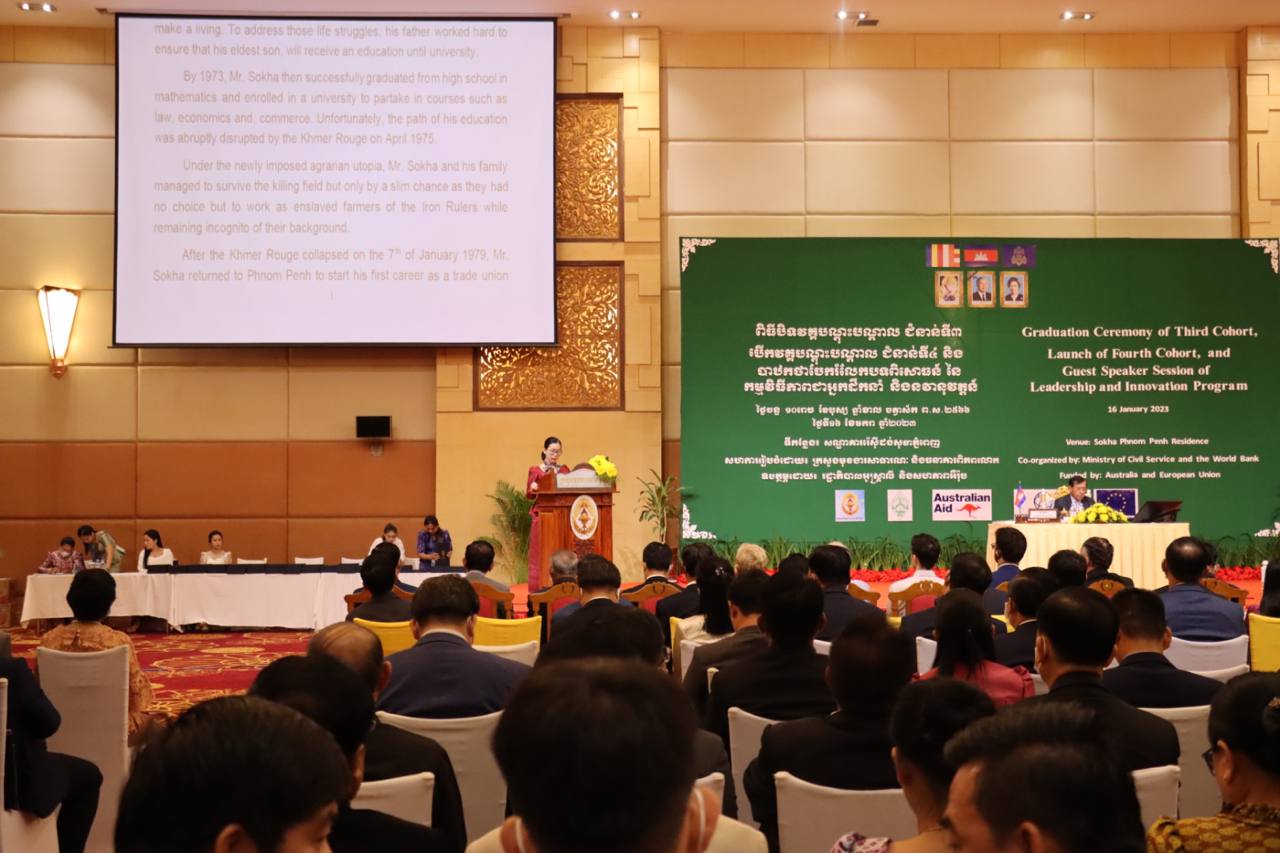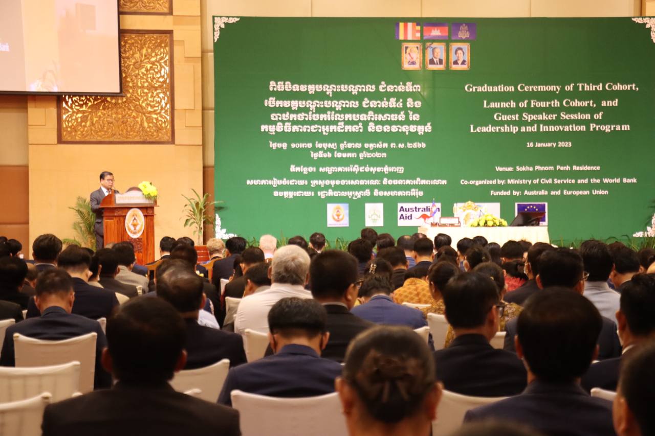ពិធីនេះបានរៀបចំឡើង នាព្រឹកថ្ងៃទី១៦ ខែមករា ឆ្នាំ២០២៣ នៅសណ្ឋាគាររ៉េស៊ីដង់សុខាភ្នំពេញ ក្រោមកិច្ចសហប្រតិបត្តិការរវាងក្រសួងមុខងារសាធារណៈ និងធនាគារពិភពលោក ដោយមានការចូលរួមពីតំណាងធនាគារពិភពលោក សហភាពអឺរ៉ុបប្រចាំប្រទេសកម្ពុជា ស្ថានទូតអូស្ត្រាលីប្រចាំកម្ពុជា ថ្នាក់ដឹកនាំក្រសួងមុខងារសាធារណៈ គណៈគ្រប់គ្រងសាលាភូមិន្ទរដ្ឋបាល សិក្ខាកាមនៃវគ្គភាពជាអ្នកដឹកនាំ និងនវានុវត្តន៍ជំនាន់ទី៣ និងជំនាន់ទី៤ សរុបអ្នកចូលរួមមានចំនួន៤៣១នាក់។
