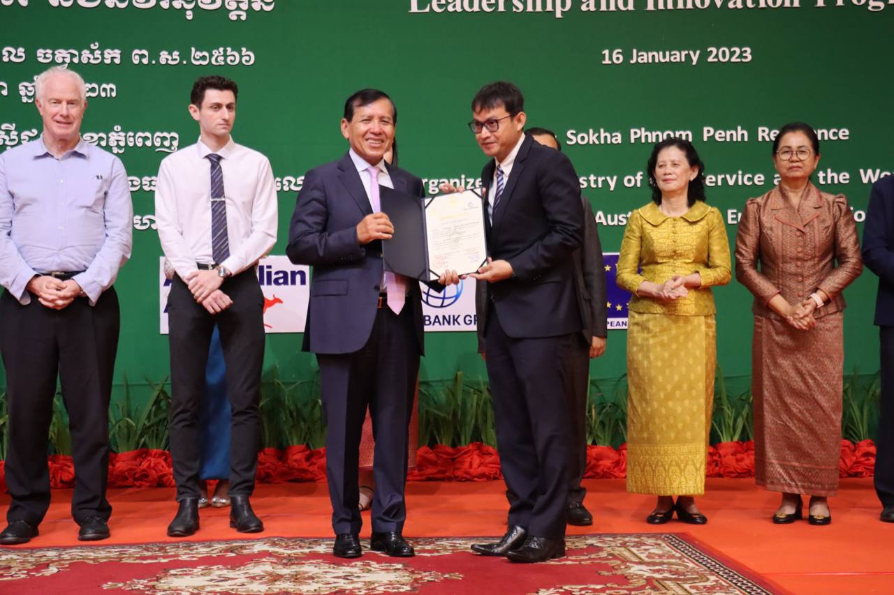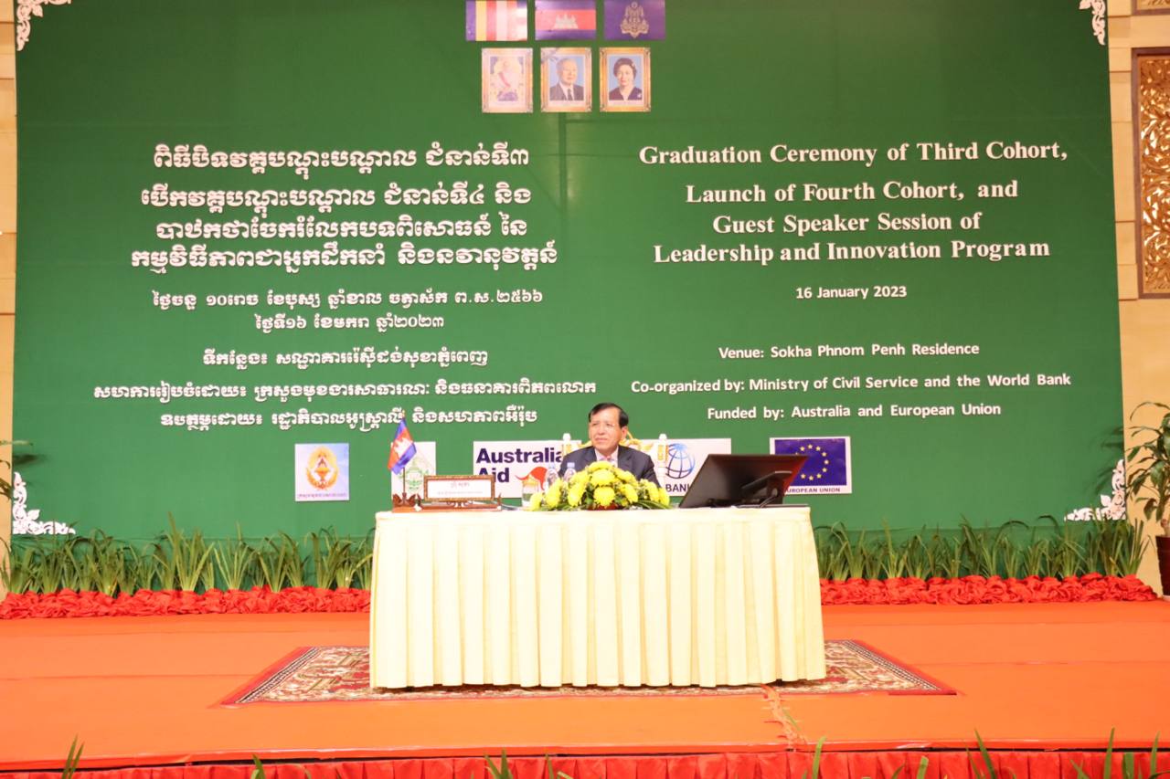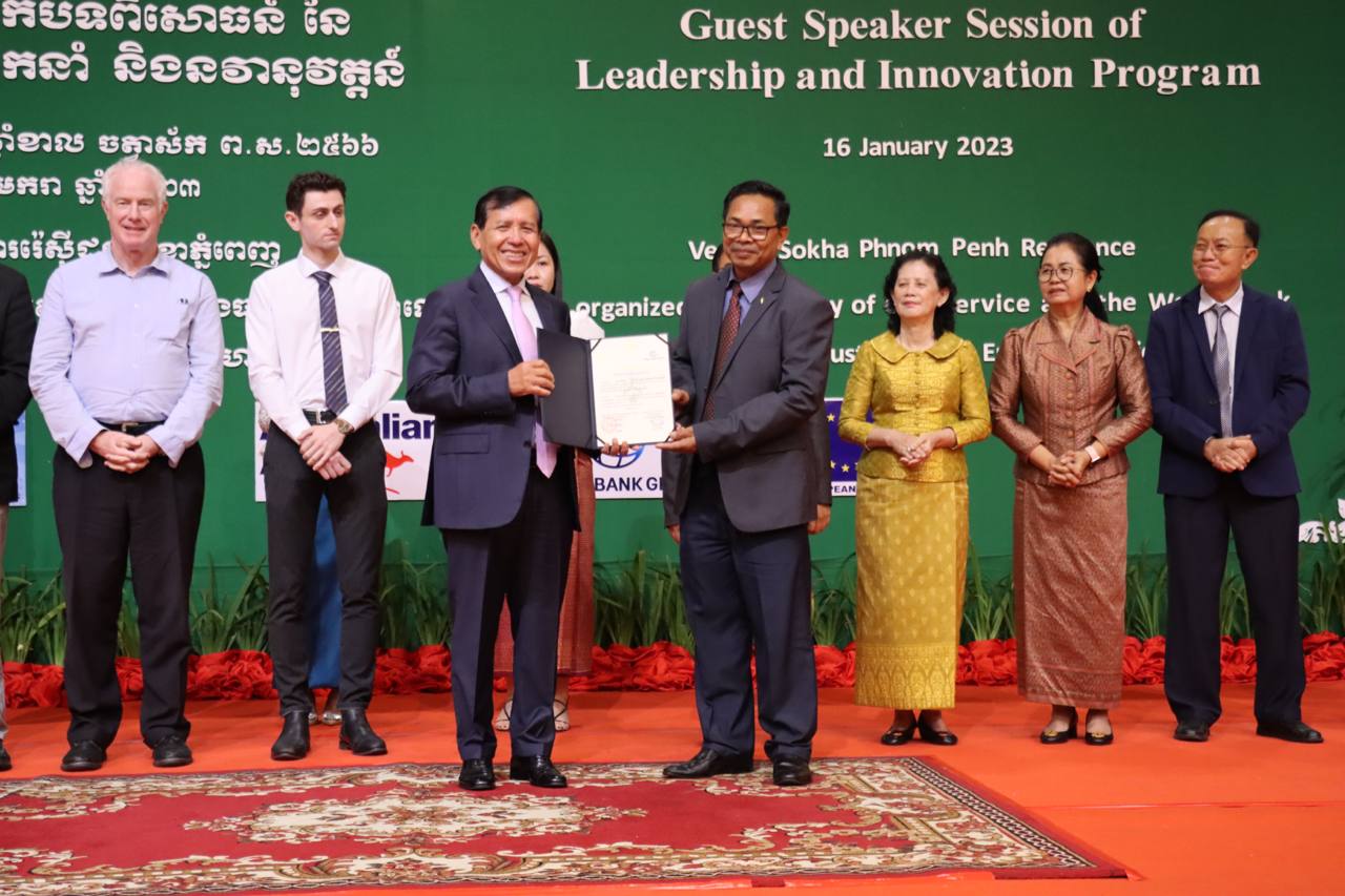 ឯកឧត្តម ព្រុំ សុខា រដ្ឋមន្ត្រីក្រសួងមុខងារសាធារណៈ អញ្ជើញចូលរួមក្នុងពិធីបិទវគ្គបណ្ដុះបណ្ដាលជំនាន់ទី៣ បើកវគ្គបណ្ដុះបណ្ដាលជំនាន់ទី៤ និងផ្តល់បាឋកថាចែករំលែកបទពិសោធន៍ នៃកម្មវិធីភាពជាអ្នកដឹកនាំ និងនវានុវត្តន៍