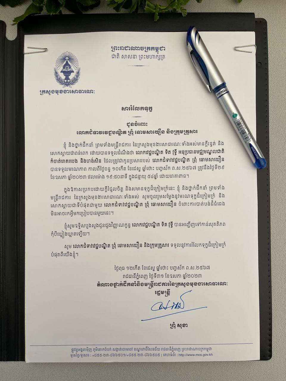 (ភ្នំពេញ)៖ នាព្រឹកថ្ងៃពុធ ទី៣១ ខែឧសភា ឆ្នាំ២០២៣នេះ ឯកឧត្តម ព្រុំ សុខា រដ្ឋមន្ត្រីក្រសួងមុខងារសាធារណៈ បានដឹកនាំប្រតិភូ ចូលរួមគោរពវិញ្ញាណក្ខន្ធ លោកវេជ្ជបណ្ឌិត ទិត វុទ្ធី អនុប្រធានមជ្ឈមណ្ឌលជាតិកំចាត់រោគរបេង និងហង់សិន ដែលត្រូវជាកូនប្រសារ លោកជំទាវវេជ្ជបណ្ឌិត ព្រុំ ឆោមសាយឿន នៅគេហដ្ឋាននៃសព ស្ថិតក្នុងបូរីហាយធិចលុច្សសារី ផ្ទះលេខ៤២ ផ្លូវលីលី សង្កាត់និរោធ ខណ្ឌច្បារអំពៅ រាជធានីភ្នំពេញ៕