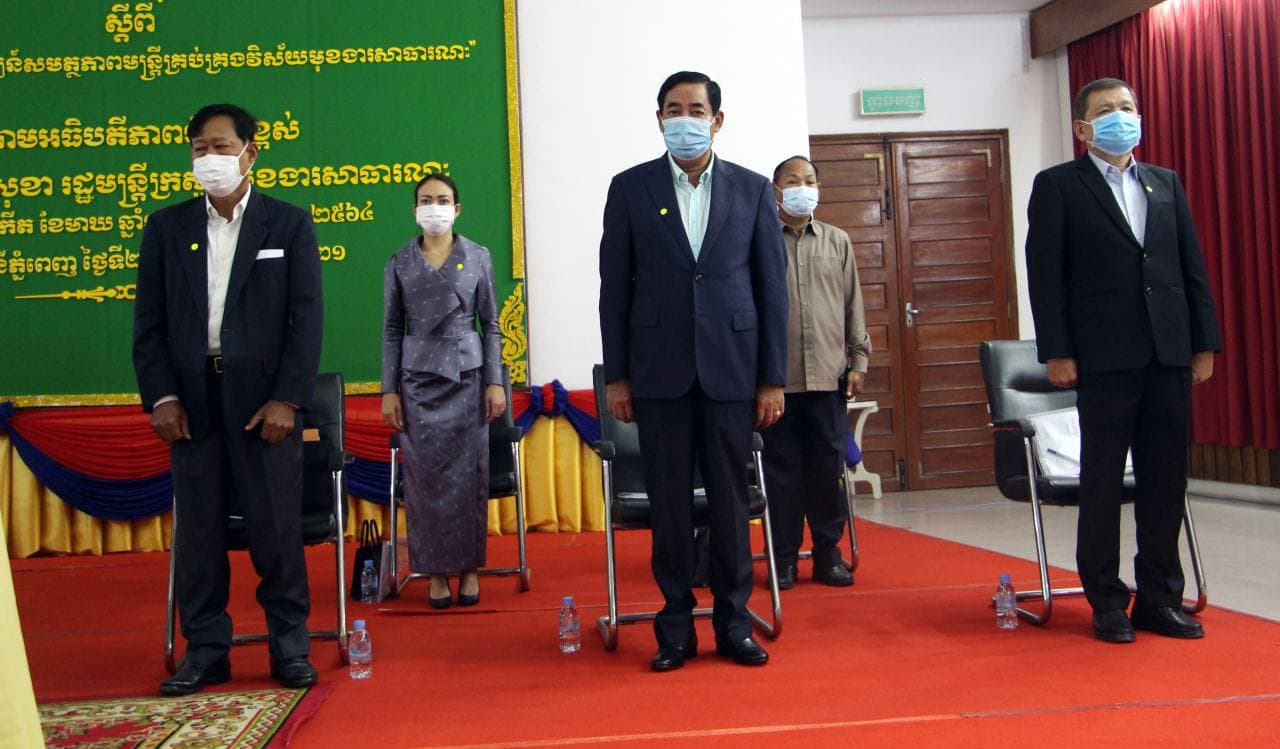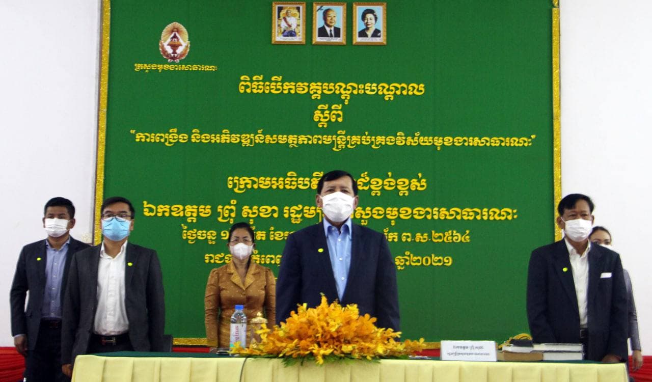 រាជធានីភ្នំពេញ៖ នាព្រឹកថ្ងៃទី២៥ ខែមករា ឆ្នាំ២០២១ នៅសហសាលនៃសាលាភូមិន្ទរដ្ឋបាល ឯកឧត្តម ព្រុំ សុខា រដ្ឋមន្រ្តីក្រសួងមុខងារសាធារណ: បានអញ្ជើញជាអធិបតីដ៏ខ្ពង់ខ្ពស់ក្នុងពិធីបើកវគ្គបណ្តុះបណ្តាល ស្តីពី “ការពង្រឹងនិងអភិវឌ្ឍន៍សមត្ថភាពមន្រ្តីគ្រប់គ្រងវិស័យមុខងារសាធារណ:” និងបានធ្វើបទបង្ហាញស្តីពី “ភាពជាអ្នកដឹកនាំក្នុងរដ្ឋបាលសាធារណ:” ជូនថ្នាក់ដឹកនាំជារដ្ឋលេខាធិការ អនុរដ្ឋលេខាធិការ ទីប្រឹក្សា អគ្គនាយក អគ្គាធិការ អគ្គនាយករង ប្រធាននាយកដ្ឋាន ប្រធានមន្ទីរមុខងារសាធារណ: និងមន្ត្រីរបស់ក្រសួង សរុបជិត ២០០នាក់។