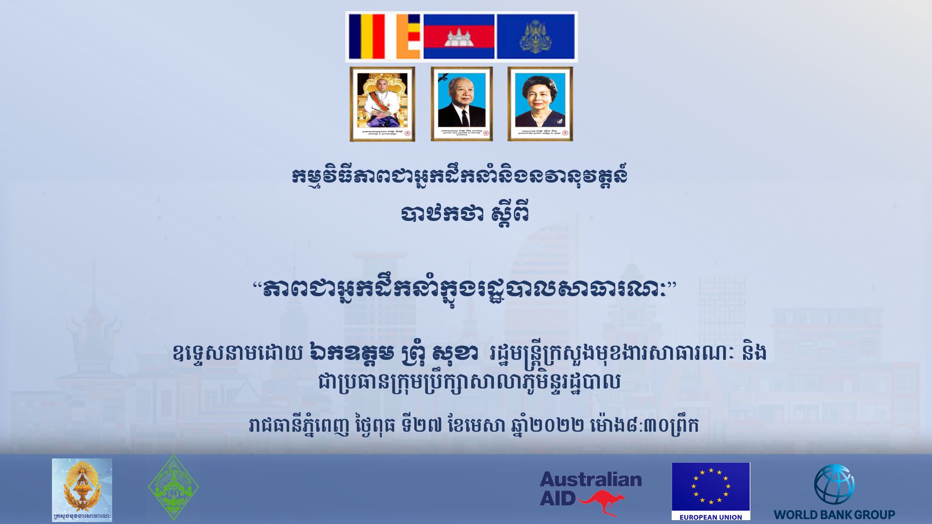 ពិធីនេះបានប្រព្រឹត្តទៅនៅព្រឹក ថ្ងៃទី២៧ ខែមេសា ឆ្នាំ២០២២ នៅសាលាភូមិន្ទរដ្ឋបាល ដែលមានការចូលរួមដោយផ្ទាល់ និងតាមប្រព័ន្ធអនឡាញ ពីឯកឧត្តម លោកជំទាវ អស់លោក លោកស្រី ជាសិក្ខាមជាន់ខ្ពស់មកពីក្រសួង ស្ថាប័ន ថ្នាក់អគ្គនាយករង អគ្គនាយក អភិបាលរង អភិបាលខេត្ត រហូតដល់រដ្ឋលេខាធិការ និងសិស្សមន្រ្តីជាន់ខ្ពស់ជំនាន់ទី១២ នៃសាលាភូមិន្ទរដ្ឋបាល សរុបអ្នកចូលរួមចំនួនមានប្រមាណជាង២៥០នាក់។