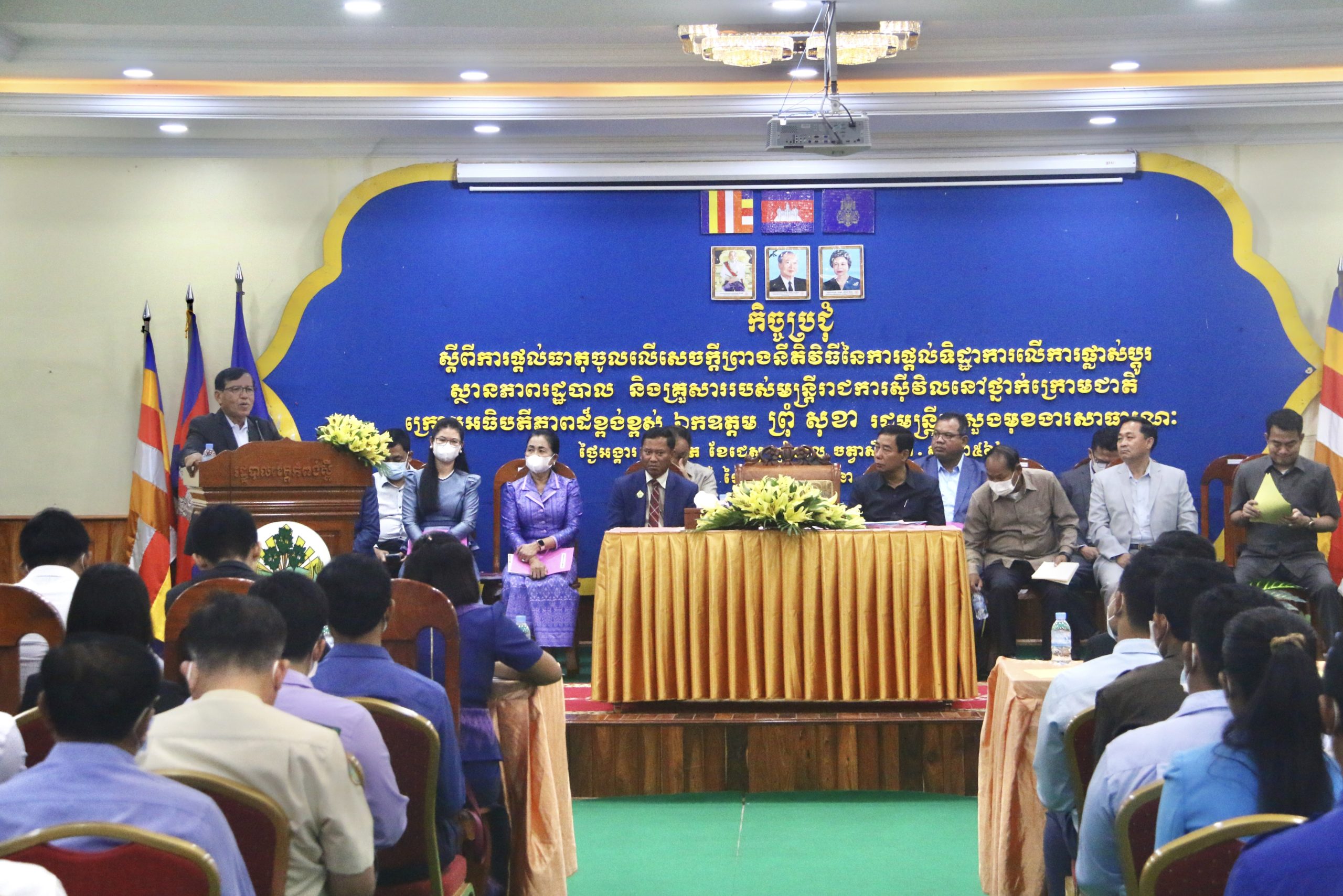 ឯកឧត្តម ព្រុំ សុខា រដ្ឋមន្ត្រីក្រសួងមុខងារសាធារណៈ អញ្ជើញជាអធិបតីក្នុងកិច្ចប្រជុំស្តីពីការផ្តល់ធាតុចូលលើសេចក្តីព្រាងនីតិវិធីនៃការផ្តល់ទិដ្ឋការលើការផ្លាស់ប្តូរស្ថានភាពរដ្ឋបាល និងគ្រួសាររបស់មន្រ្តីរាជការស៊ីវិលនៅថ្នាក់ក្រោមជាតិ នៅខេត្តកំពង់ស្ពឺ