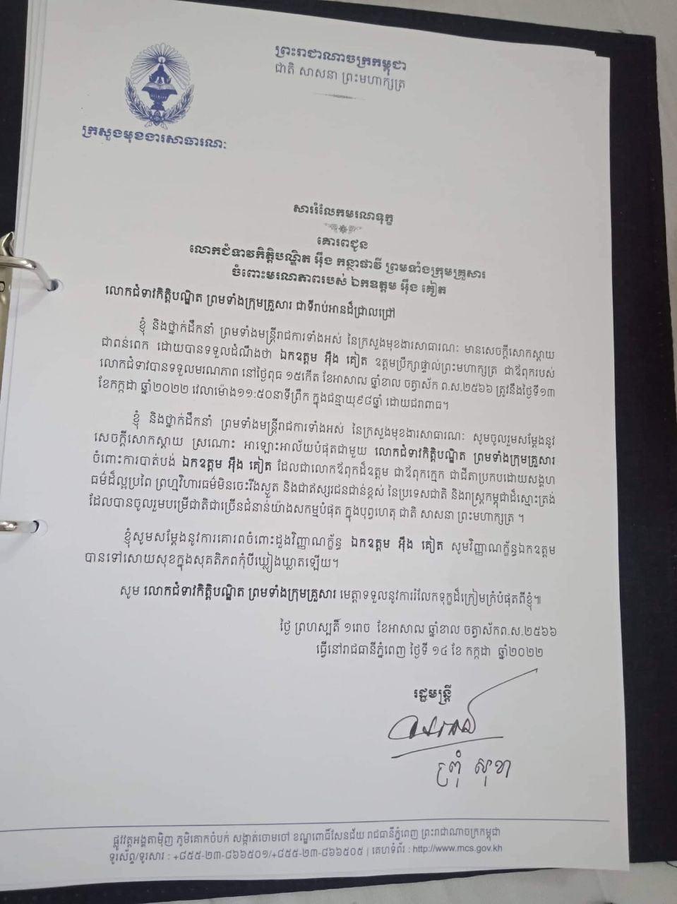 (ភ្នំពេញ)៖ នារសៀលថ្ងៃទី១៤ ខែកក្កដា ឆ្នាំ២០២២នេះ ឯកឧត្តមរដ្ឋមន្ត្រី ព្រុំ សុខា និងថ្នាក់ដឹកនាំ ក្រសួងមុខងារសាធារណៈ តំណាងឱ្យមន្ត្រីរាជការទាំងអស់ នៃក្រសួងមុខងារសាធារណៈ បានអញ្ជើញចូលរួមគោរពវិញ្ញាណក្ខន្ធឯកឧត្តម អ៉ឹង គៀត ឧត្ដមប្រឹក្សាផ្ទាល់ព្រះមហាក្សត្រ ត្រូវជាឪពុកលោកជំទាវកិត្តិបណ្ឌិត អ៉ឹង កន្ថាផាវី រដ្ឋមន្ត្រីក្រសួងកិច្ចការនារី ដោយបានទទួលមរណភាពកាលពីថ្ងៃពុធ ១៥កើត ខែអាសាឍ ឆ្នាំខាល ចត្វាស័ក ព.ស ២៥៦៦ ត្រូវនឹងថ្ងៃទី១៣ ខែកក្កដា ឆ្នាំ២០២២ វេលាម៉ោង ១១:៥០នាទី ក្នុងជន្មាយុ ៩៨ឆ្នាំ ដោយជរាពាធ៕